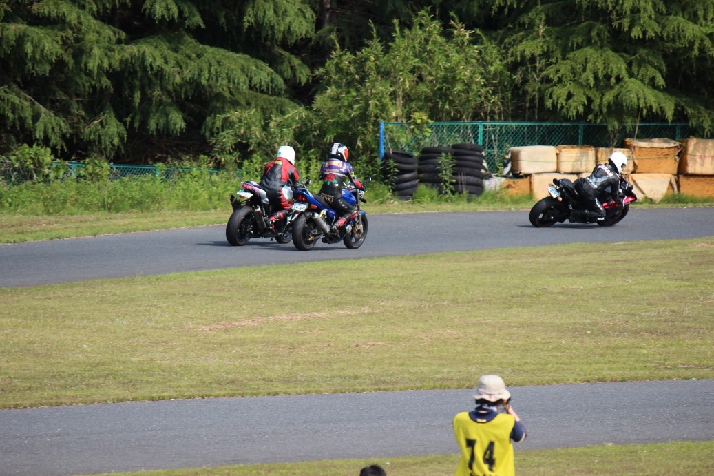 好スタートを切ったのはポールから飛び出した松木R1、さらに2番手には同じくR1の中村、3番手争いはイン側に平沼GSXR1000、アウト側に梨本亮CB400SF。