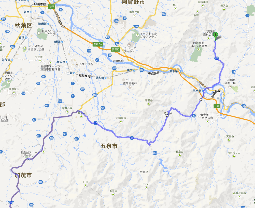 栃木インターから裏五頭山荘までのちょうど中間地点ほど、約170kmに位置します。場所はコチラをご参照。ポイントBの地点が曲家になります。121号から352号に入って401号に抜けるちょっと手前です。ミニストップからここまでで大体4時間前後と睨んでいるのですが、果たして。