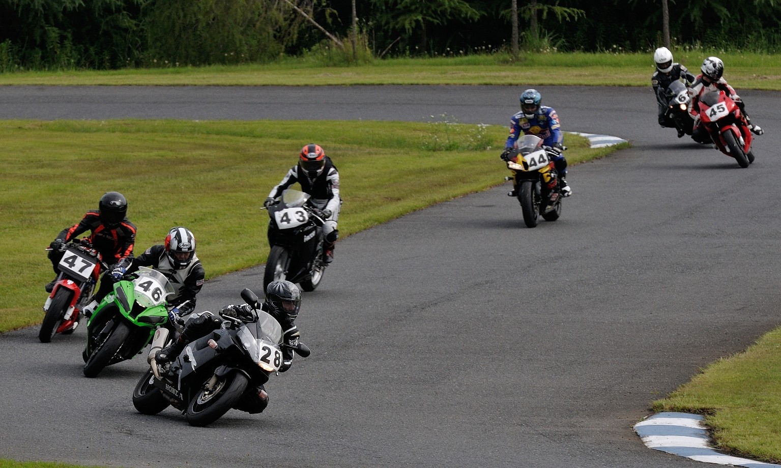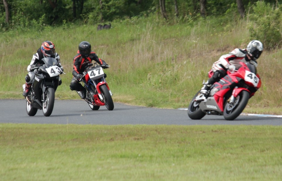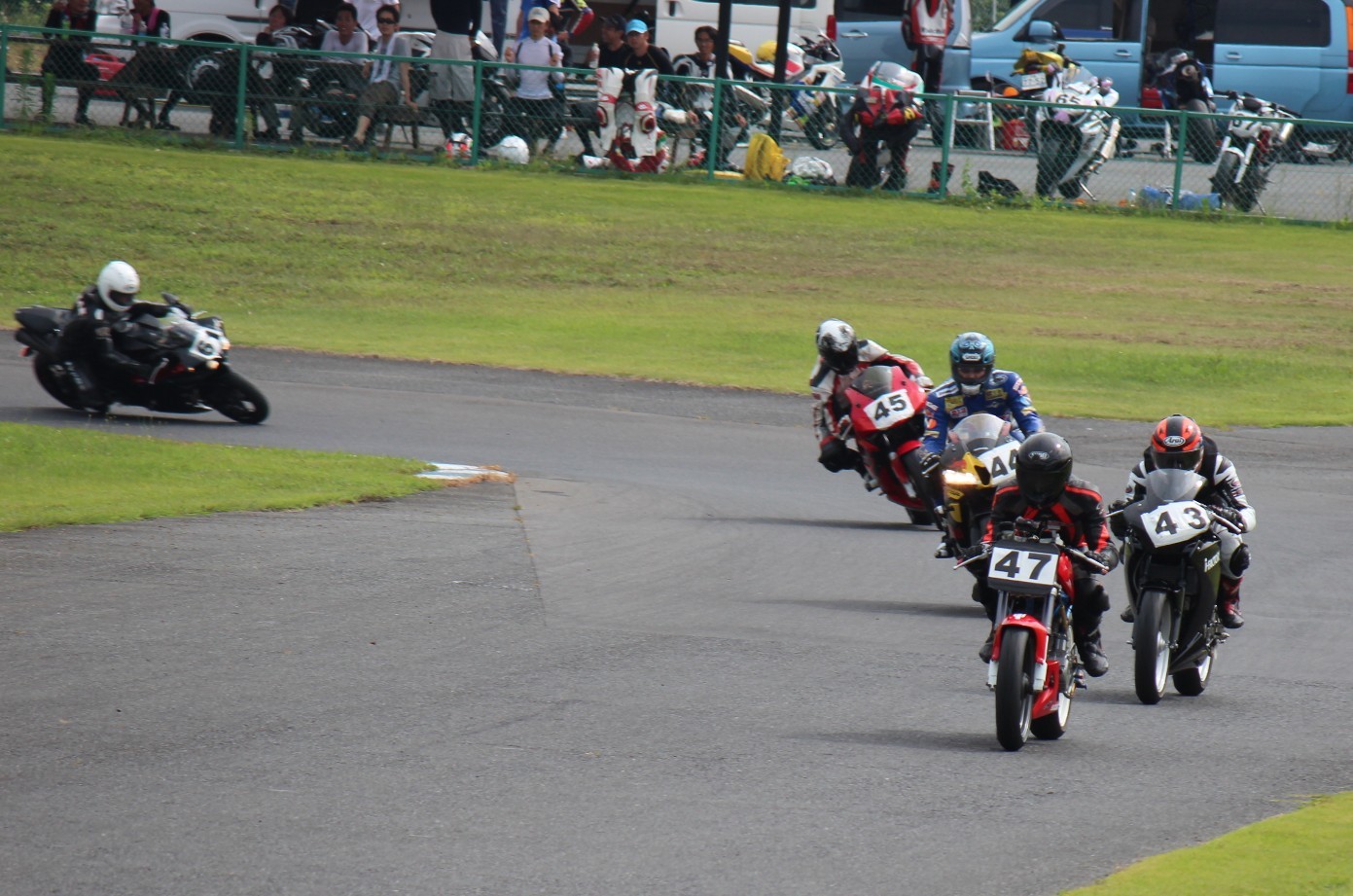 ホールショットを奪取。2番手には大木ZX10R。3番手に西村、さらにその外側に新井グース、加藤CBR250R、高土CBR600RR、中村R1と続く。