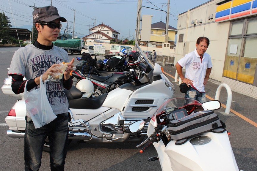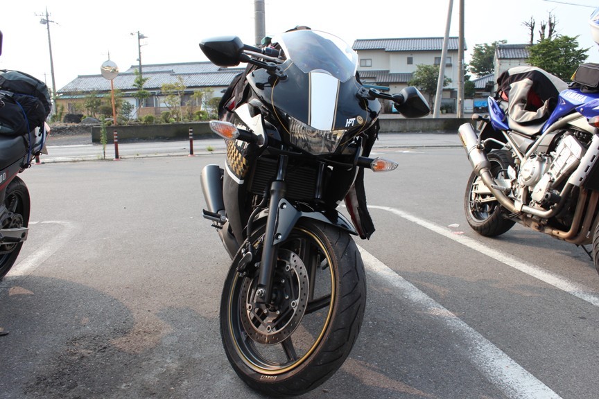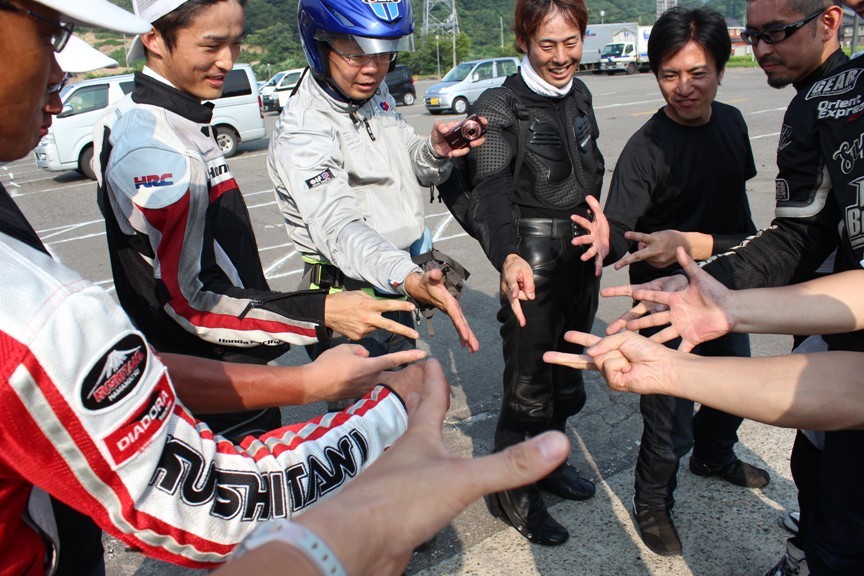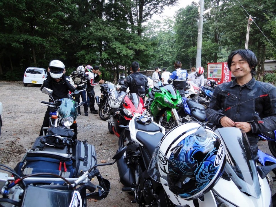 こちらは今回初参加していただいたZX14R、森川選手。トゥーブラエキパイが目耳を引く。さらにFZ1のテラ選手も一緒。