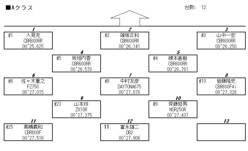 グリッドは1位から5位までをCBR600RRが独占、そしてここまでが27秒を切っている。梨本塾において、まだまだCBRの独壇場は続きそうだ。