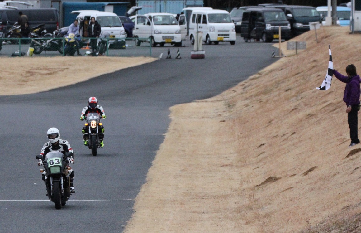 そのままトップでチェッカーを受けた。2位には悔しい妹尾。