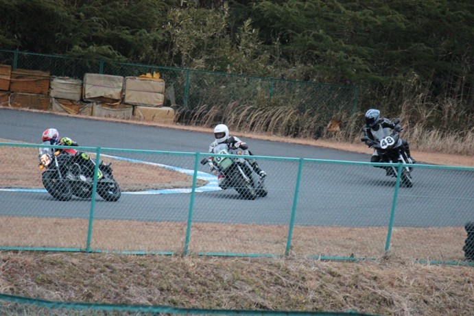 グループ先頭に8位の鈴木CB750、その次に首位の露木FZ6、そして2位の妹尾VTR250、さらに吉田RS4、そして3位の高島GPZ900Rという順で1コーナーへ。
