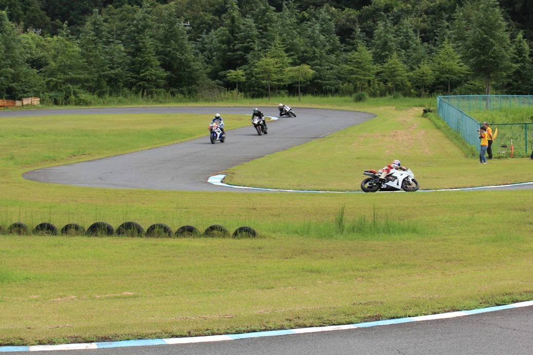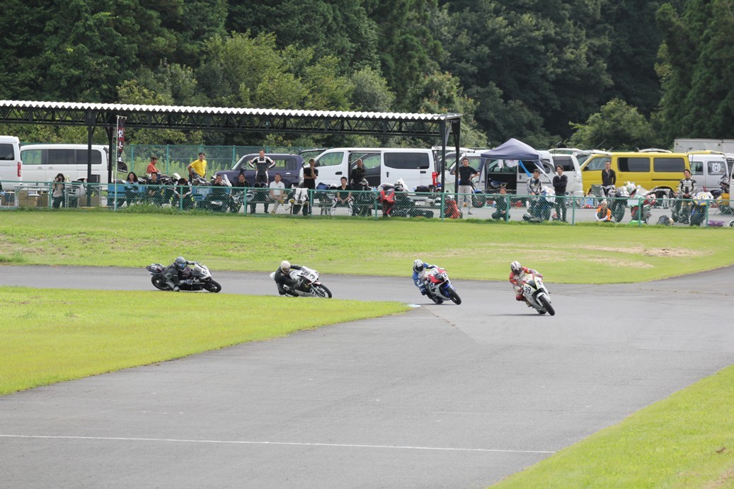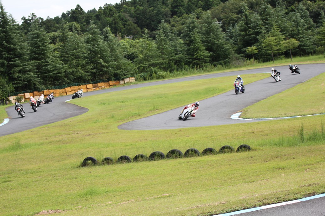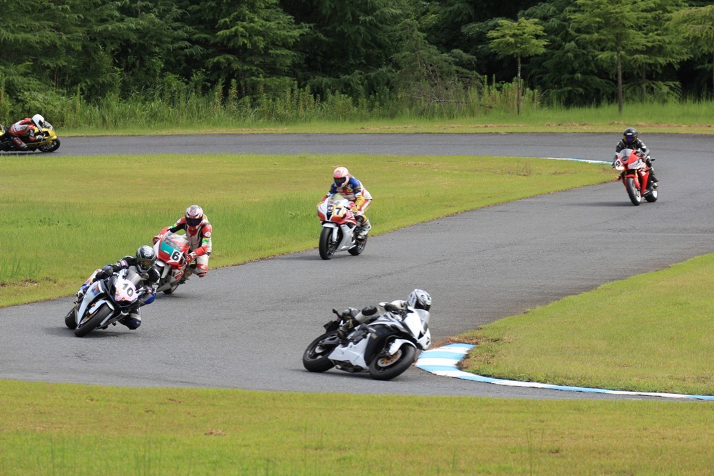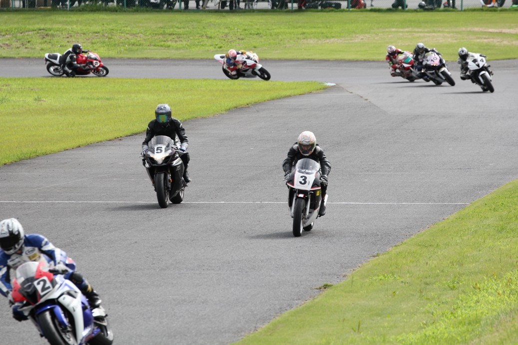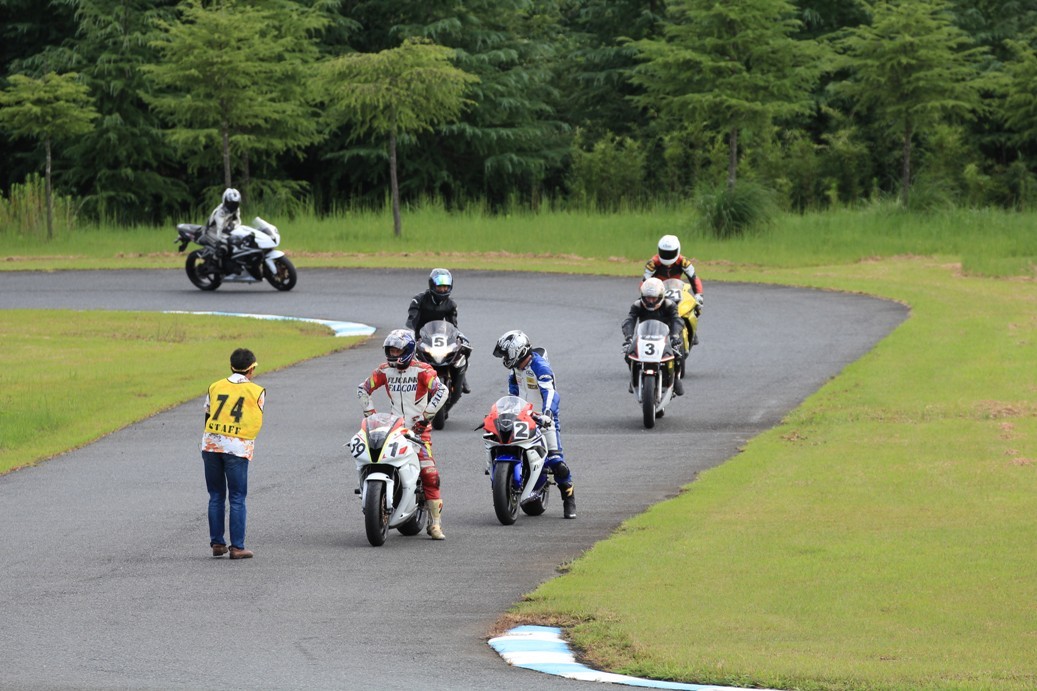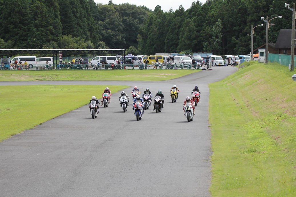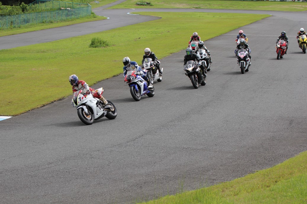 7番手に磯山TZR250R、8番手に皆藤CBR600RR、予選6番手からバックスタートとなったのは9番手の緒方CBR600RR、そして午前Bクラスから唯一ジャンプアップした池原S1000RRが10番手で1コーナーへ。