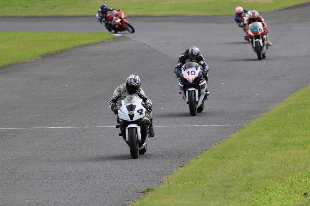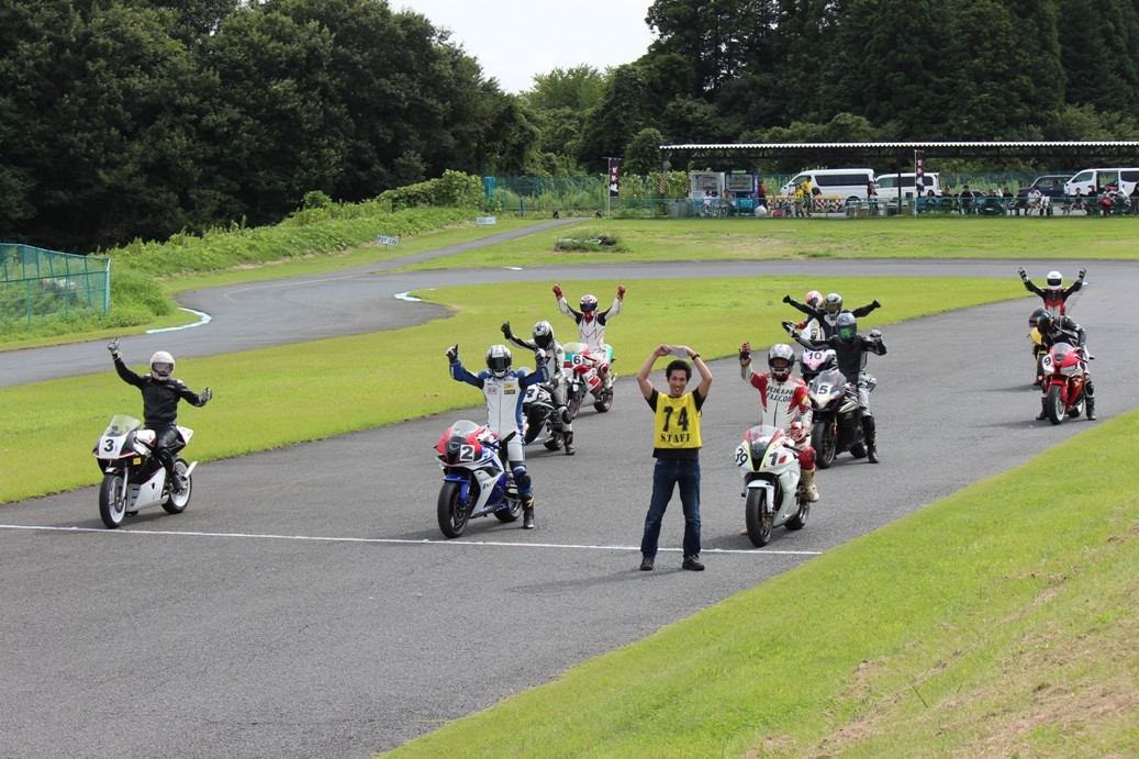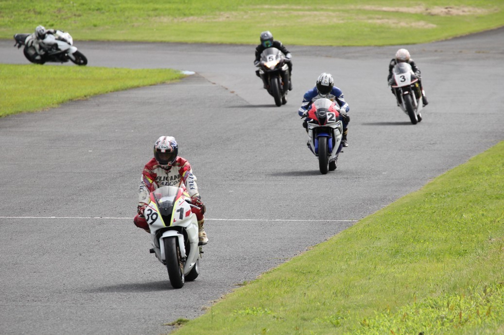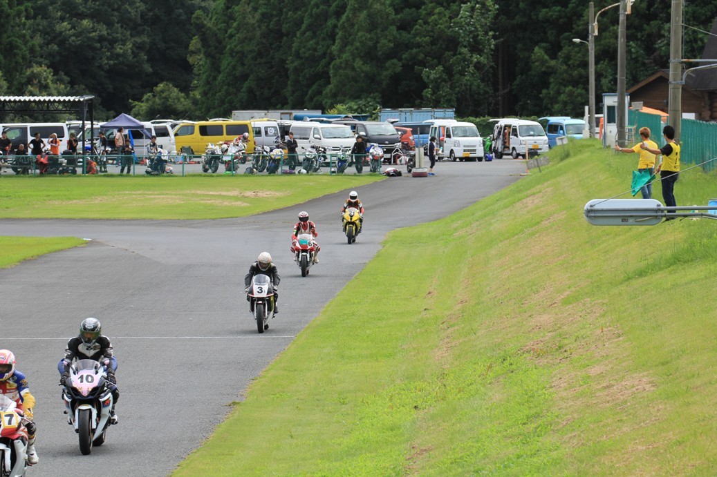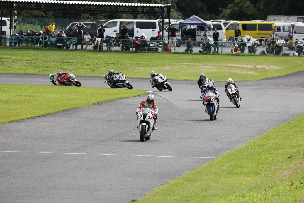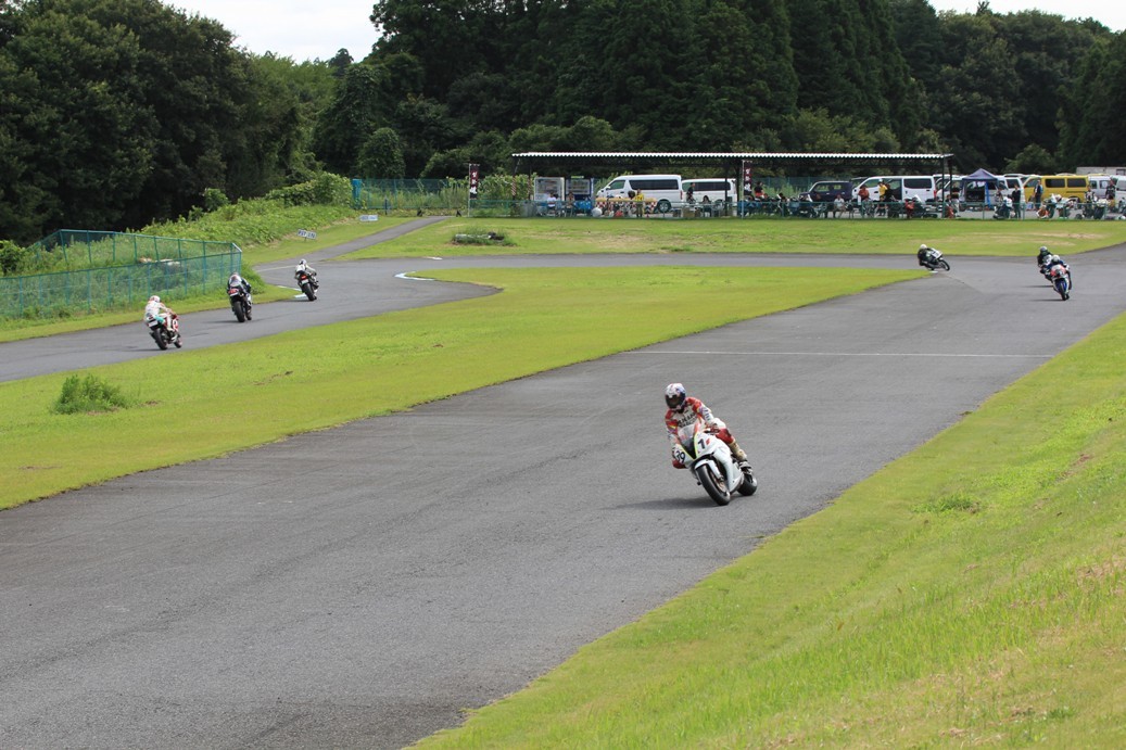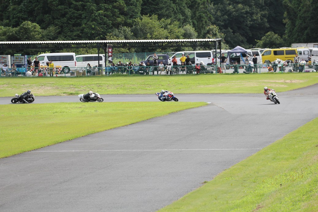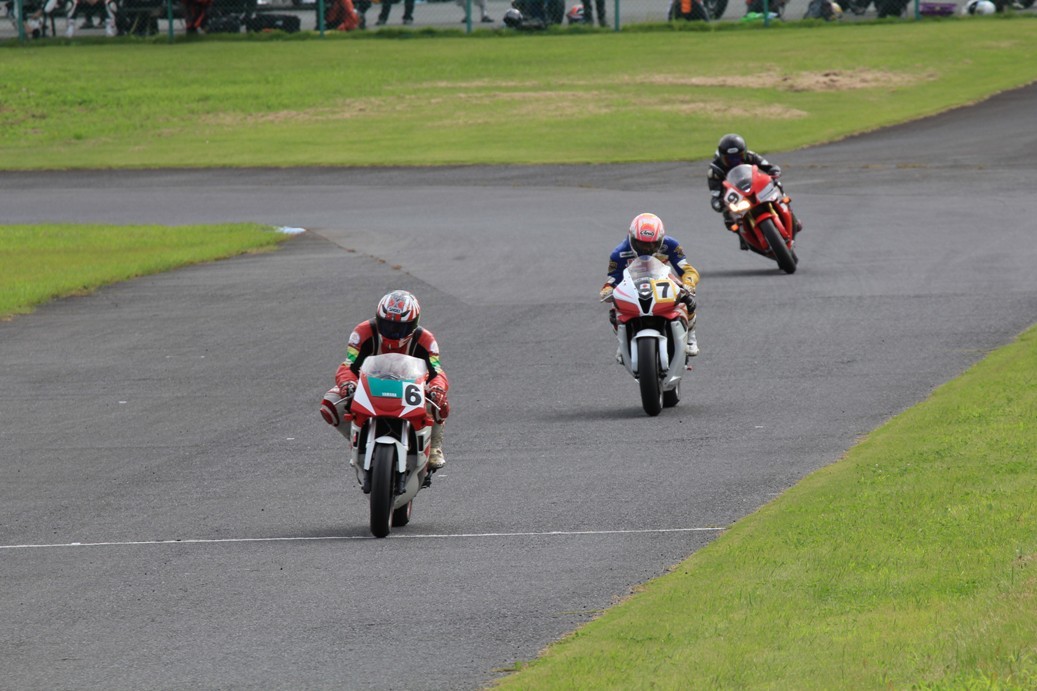 7番手に磯山TZR250R、8番手に皆藤CBR600RR、予選6番手からバックスタートとなったのは9番手の緒方CBR600RR、そして午前Bクラスから唯一ジャンプアップした池原S1000RRが10番手で1コーナーへ。