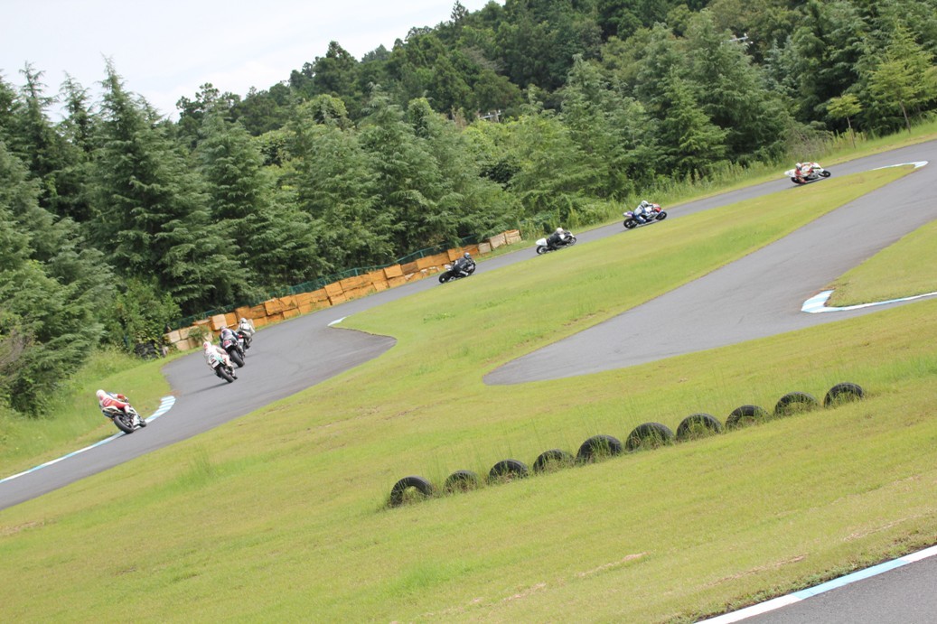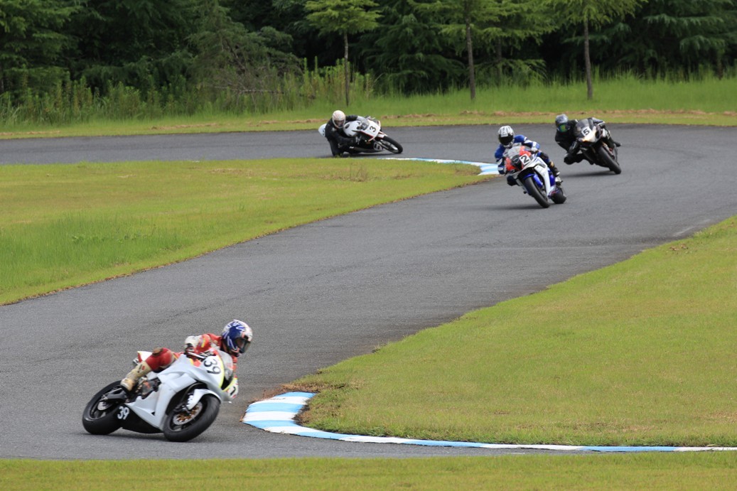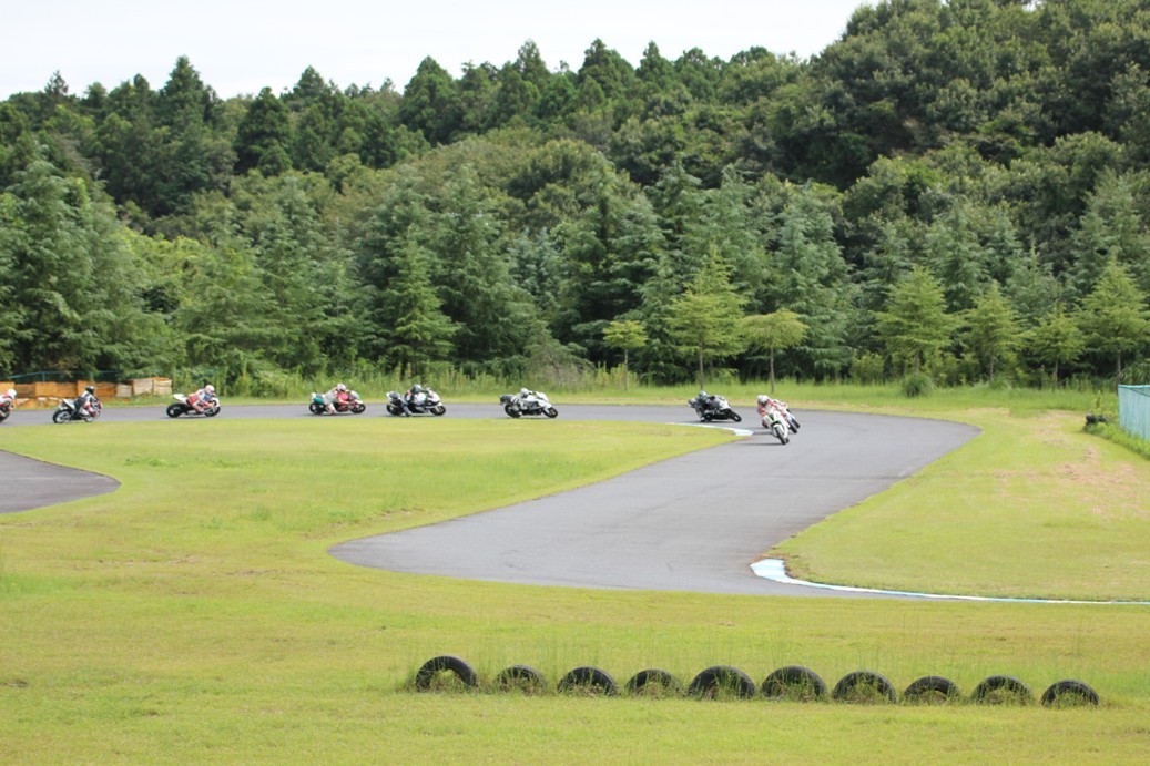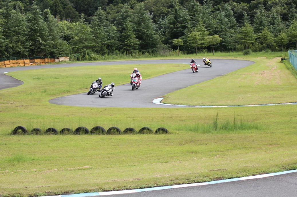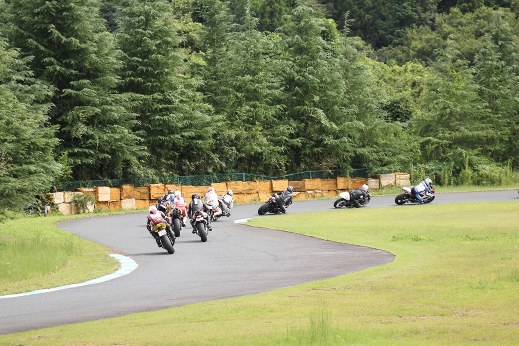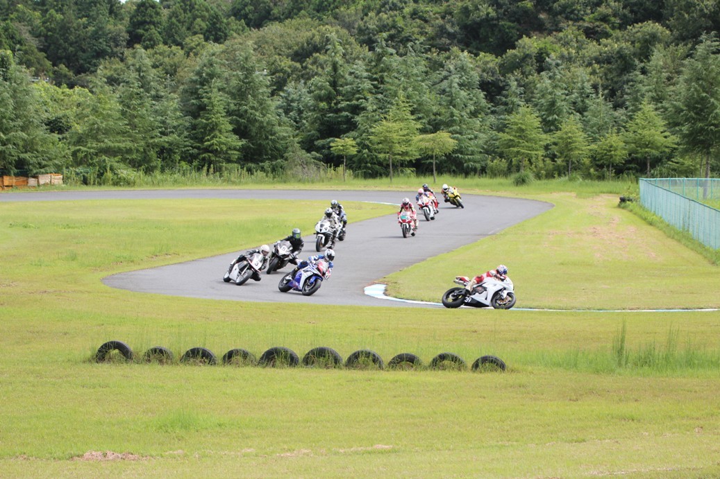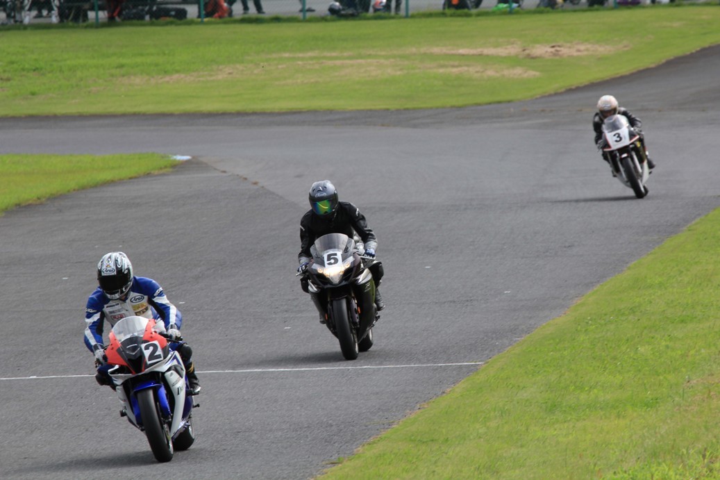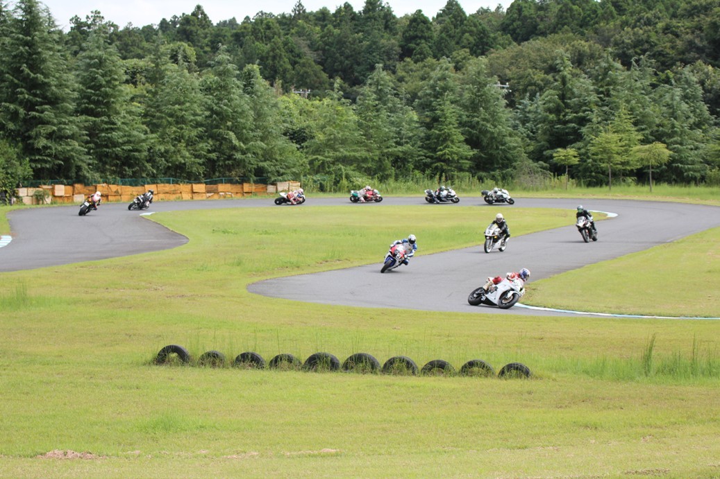 7番手に磯山TZR250R、8番手に皆藤CBR600RR、予選6番手からバックスタートとなったのは9番手の緒方CBR600RR、そして午前Bクラスから唯一ジャンプアップした池原S1000RRが10番手で1コーナーへ。
