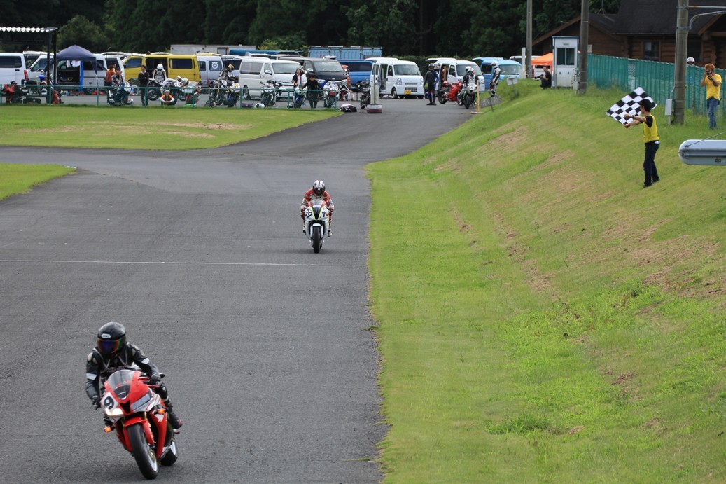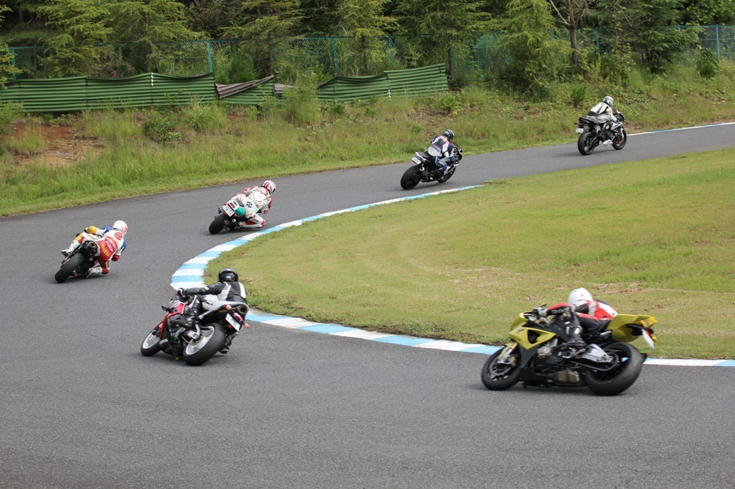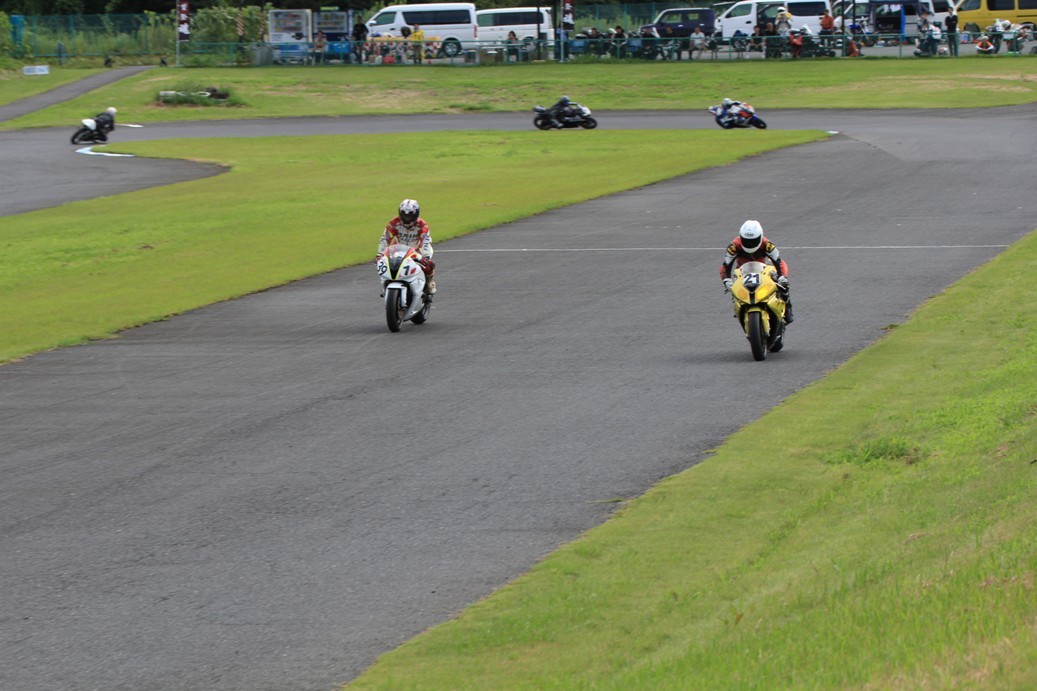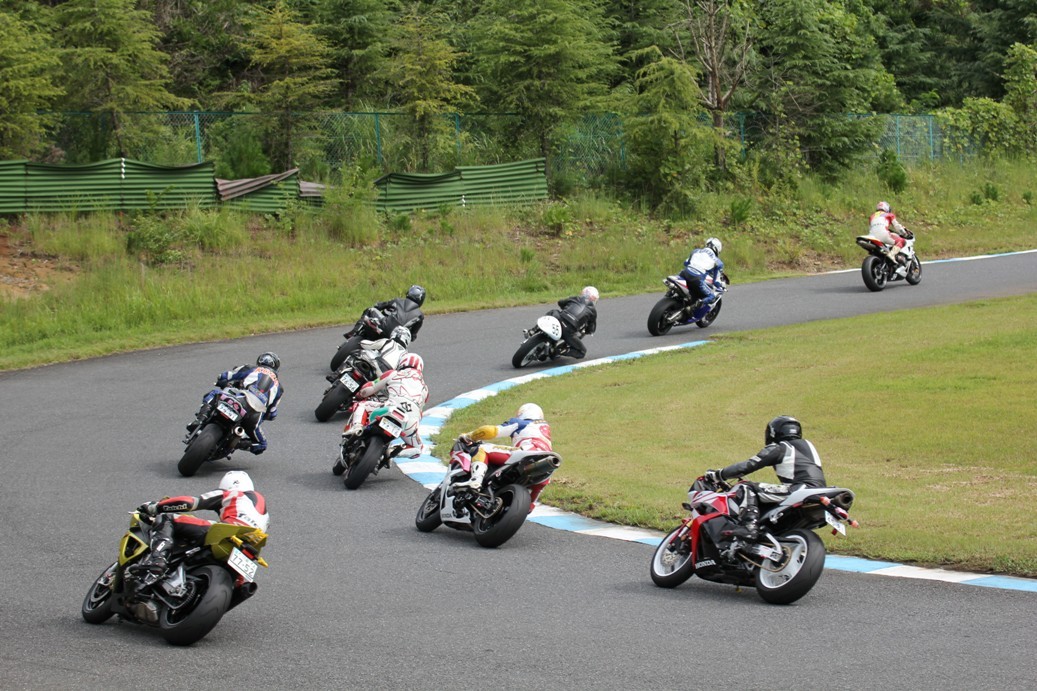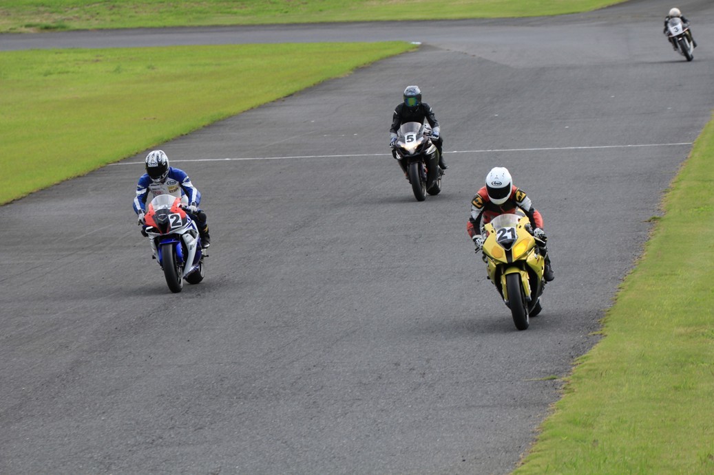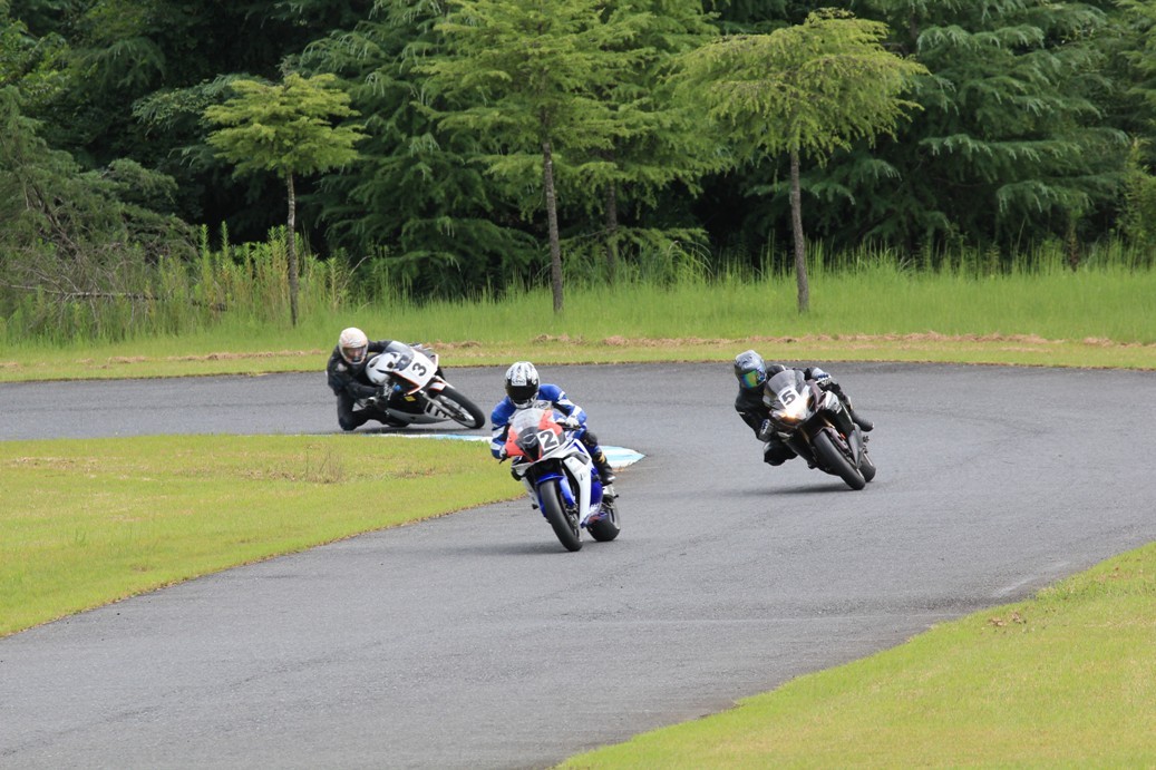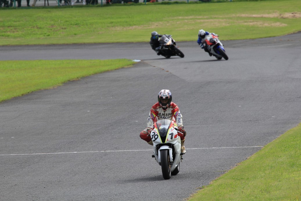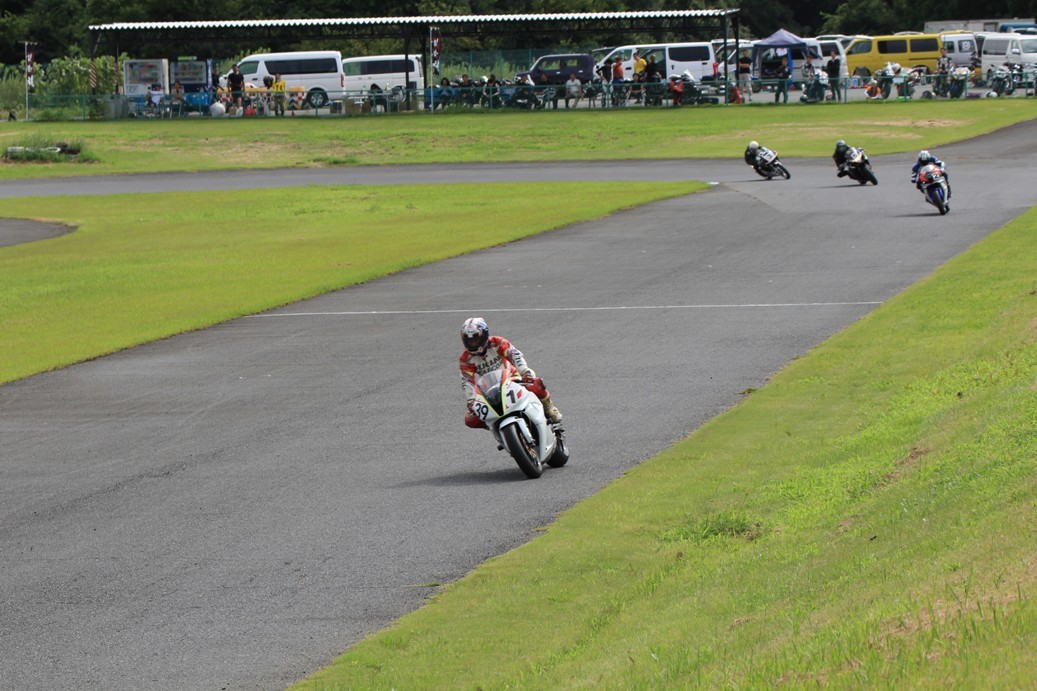 7番手に磯山TZR250R、8番手に皆藤CBR600RR、予選6番手からバックスタートとなったのは9番手の緒方CBR600RR、そして午前Bクラスから唯一ジャンプアップした池原S1000RRが10番手で1コーナーへ。