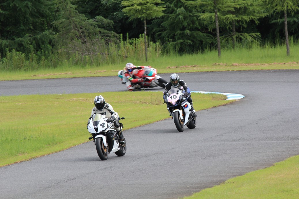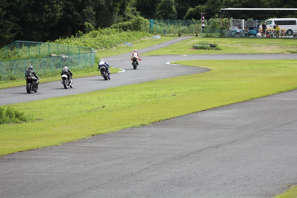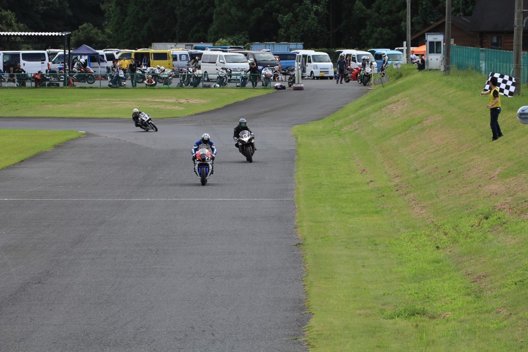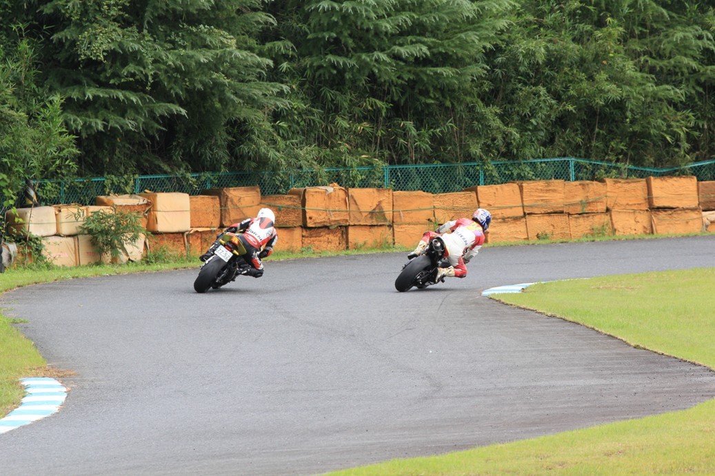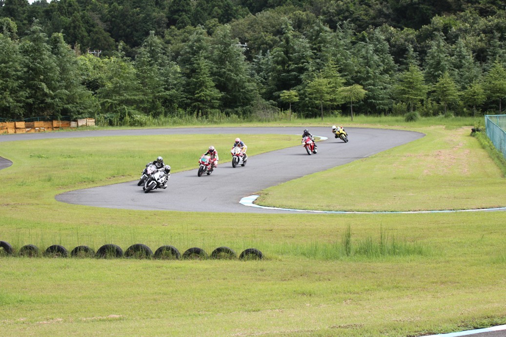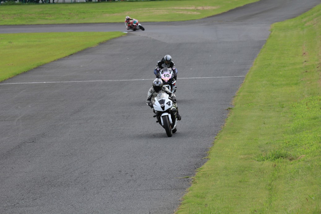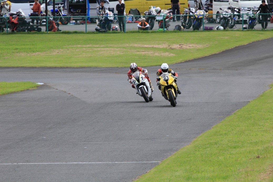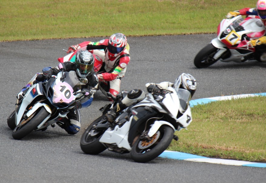 7番手に磯山TZR250R、8番手に皆藤CBR600RR、予選6番手からバックスタートとなったのは9番手の緒方CBR600RR、そして午前Bクラスから唯一ジャンプアップした池原S1000RRが10番手で1コーナーへ。