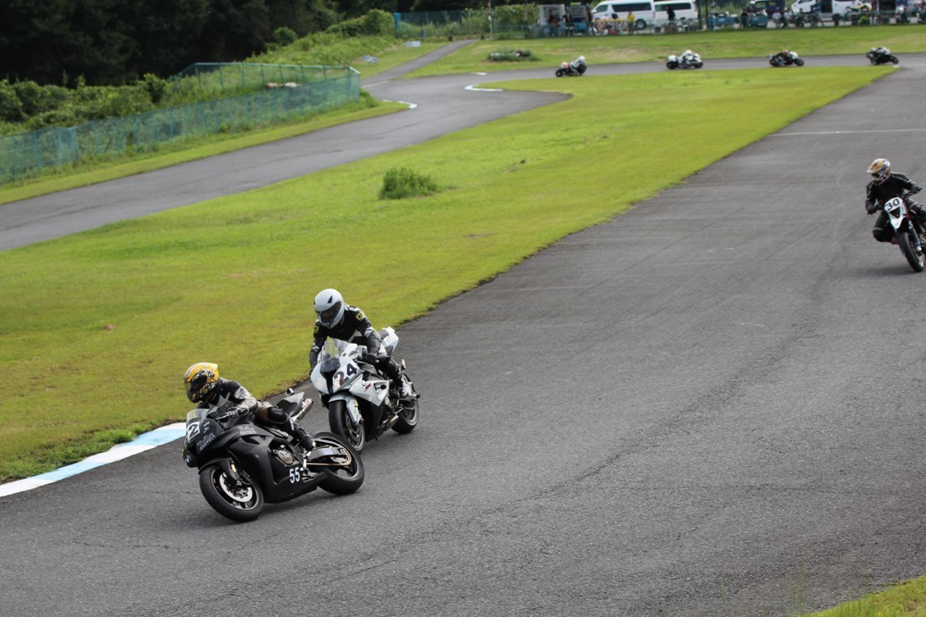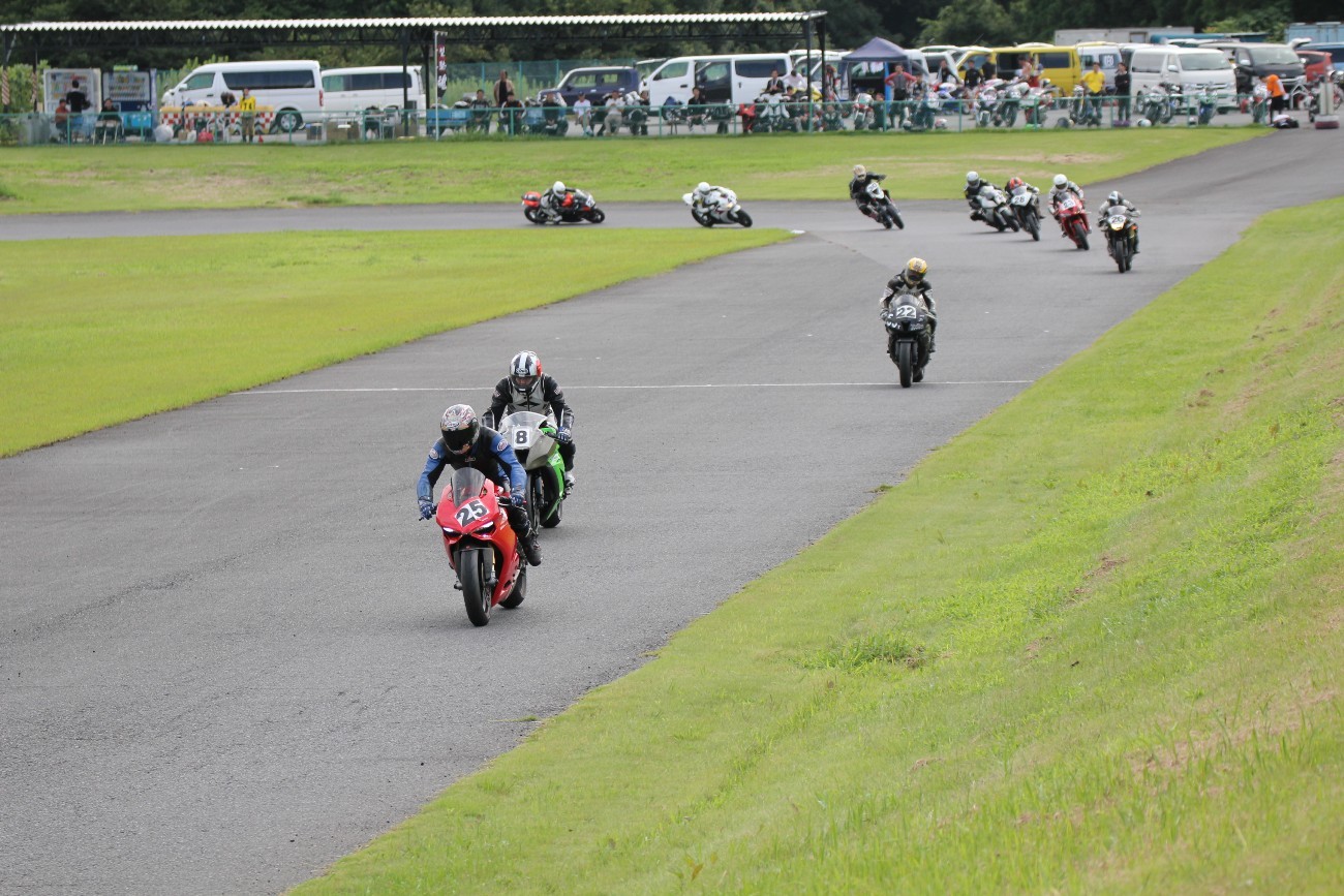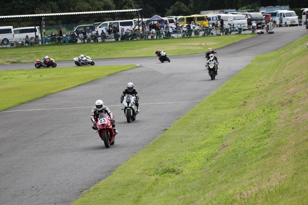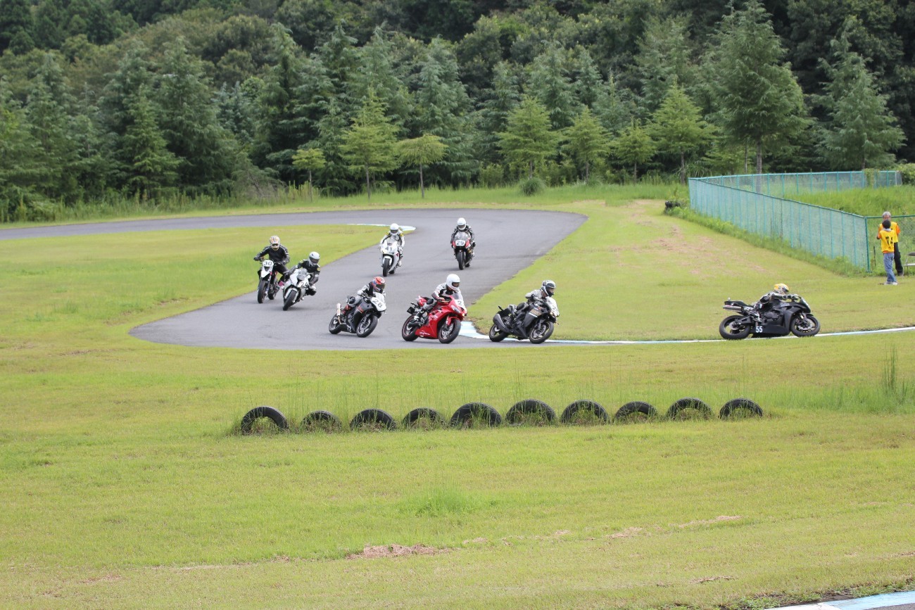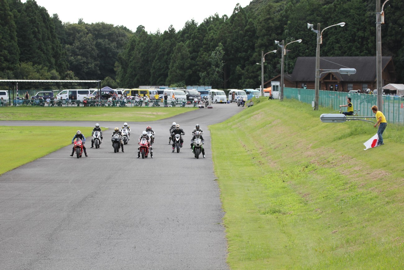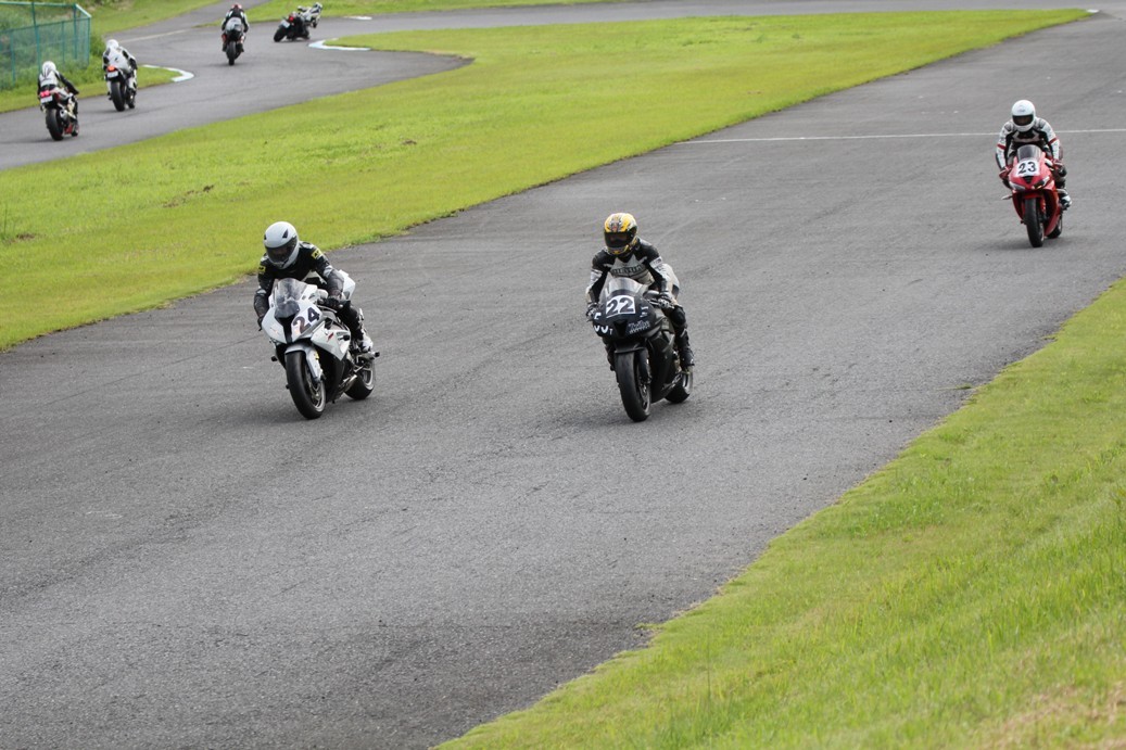 3番手には初参加でセカンドローから出た門間CBR600RR、4番手にやや出遅れた高島デイトナ675、6番手に渡辺CBR250R、7番手に大塚S1000RR、予選4番手から出た松野SMR449は大きく出遅れて8番手、9番手に前田CBR1000RR、そして10番手に安居GSXR750。