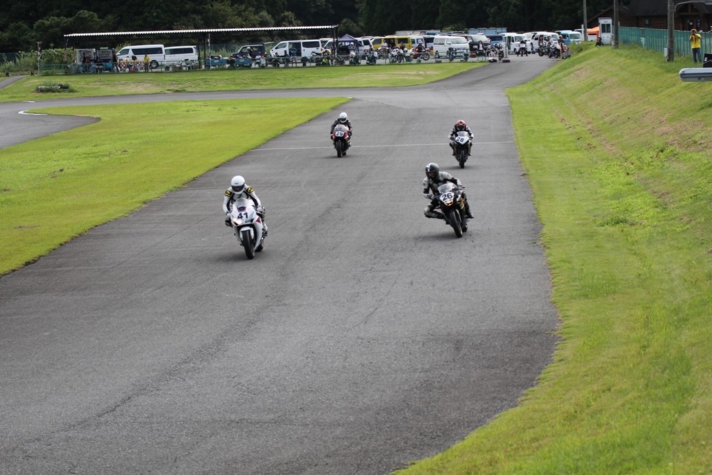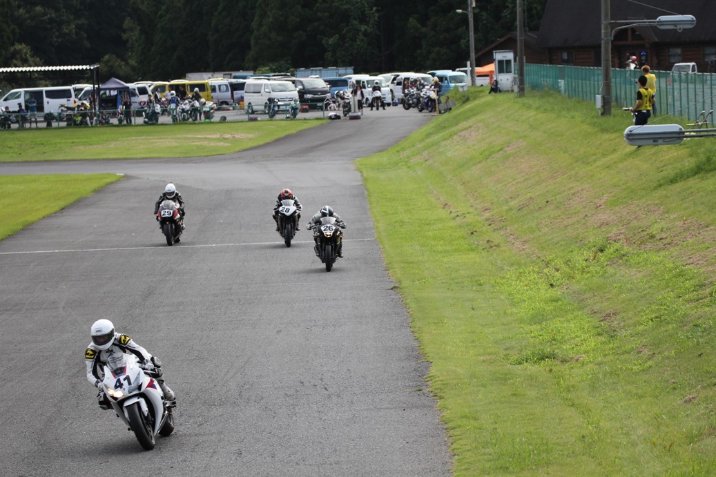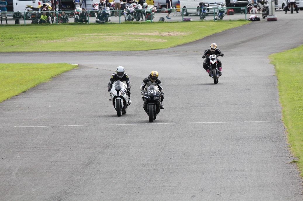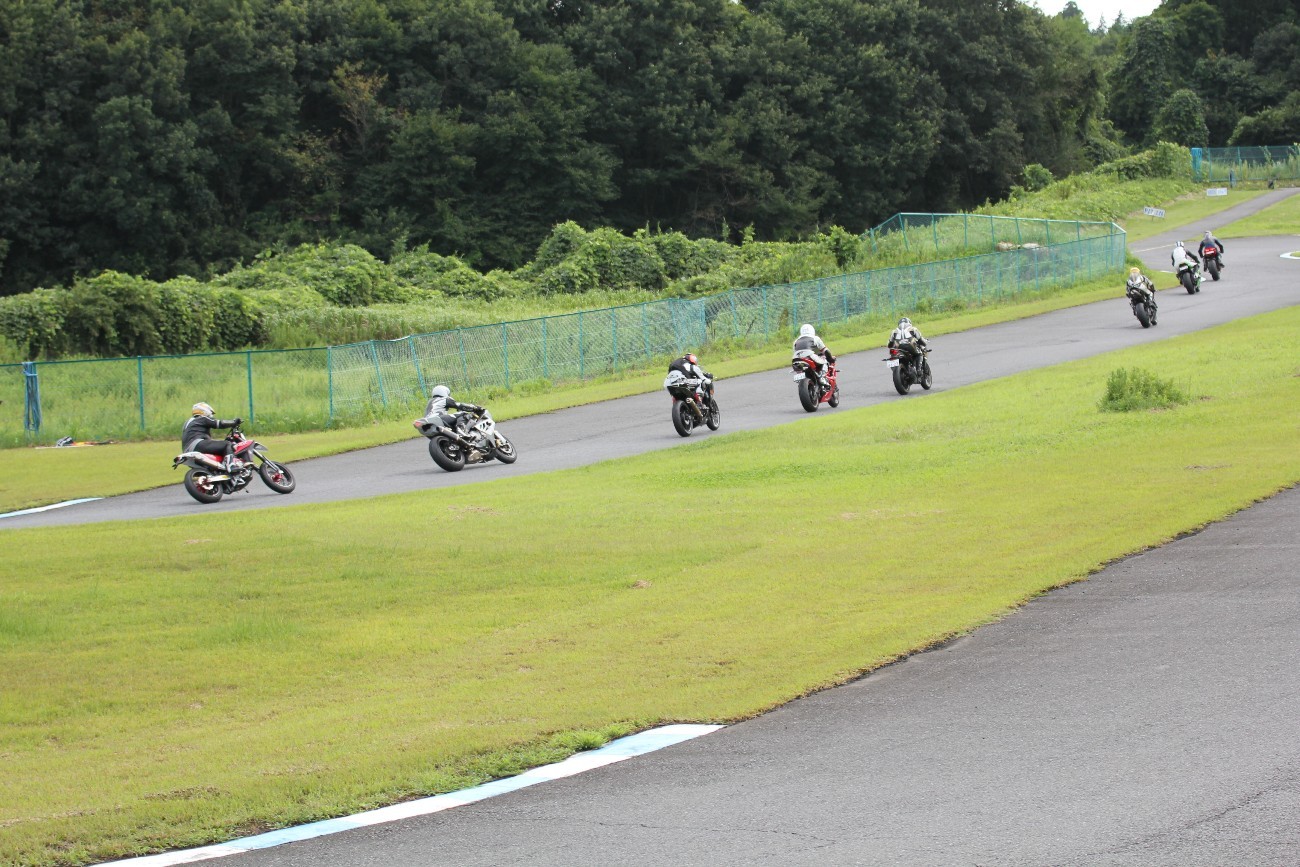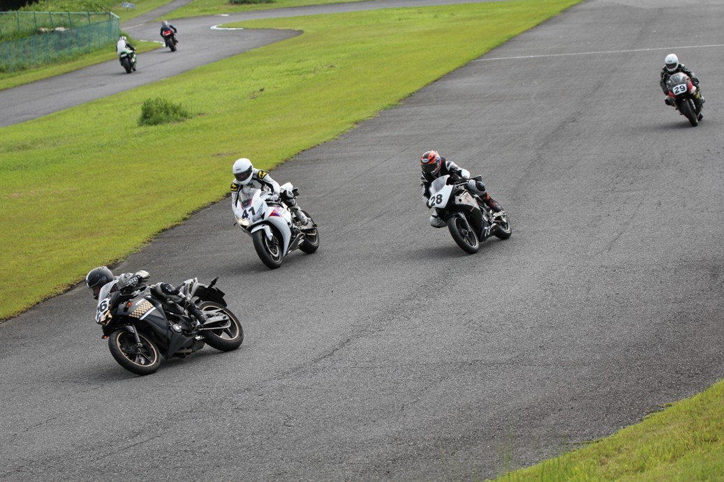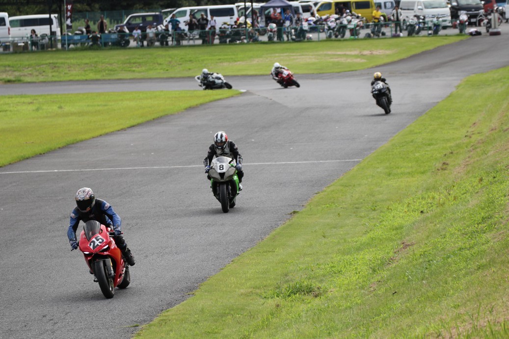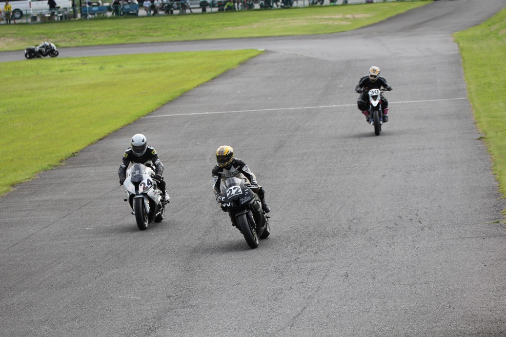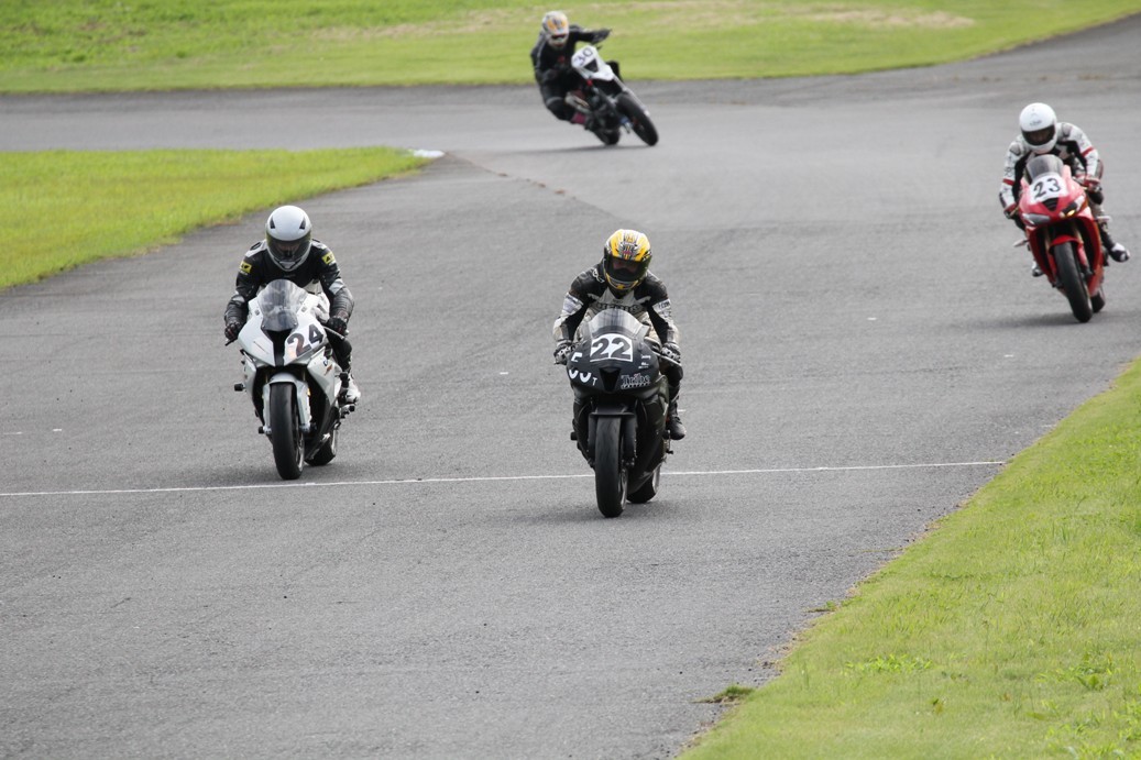 3番手には初参加でセカンドローから出た門間CBR600RR、4番手にやや出遅れた高島デイトナ675、6番手に渡辺CBR250R、7番手に大塚S1000RR、予選4番手から出た松野SMR449は大きく出遅れて8番手、9番手に前田CBR1000RR、そして10番手に安居GSXR750。