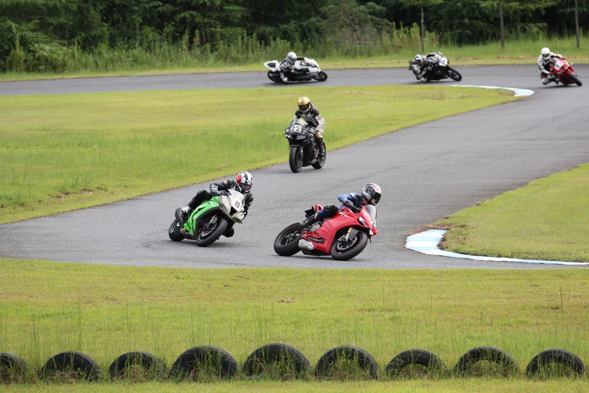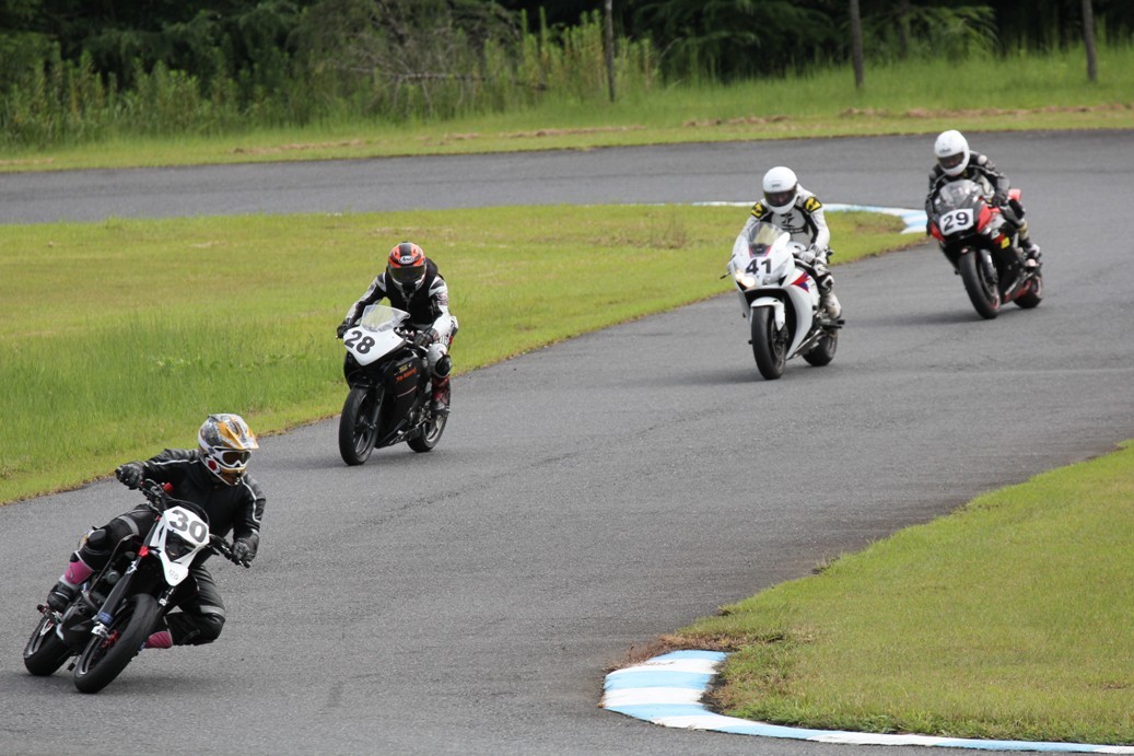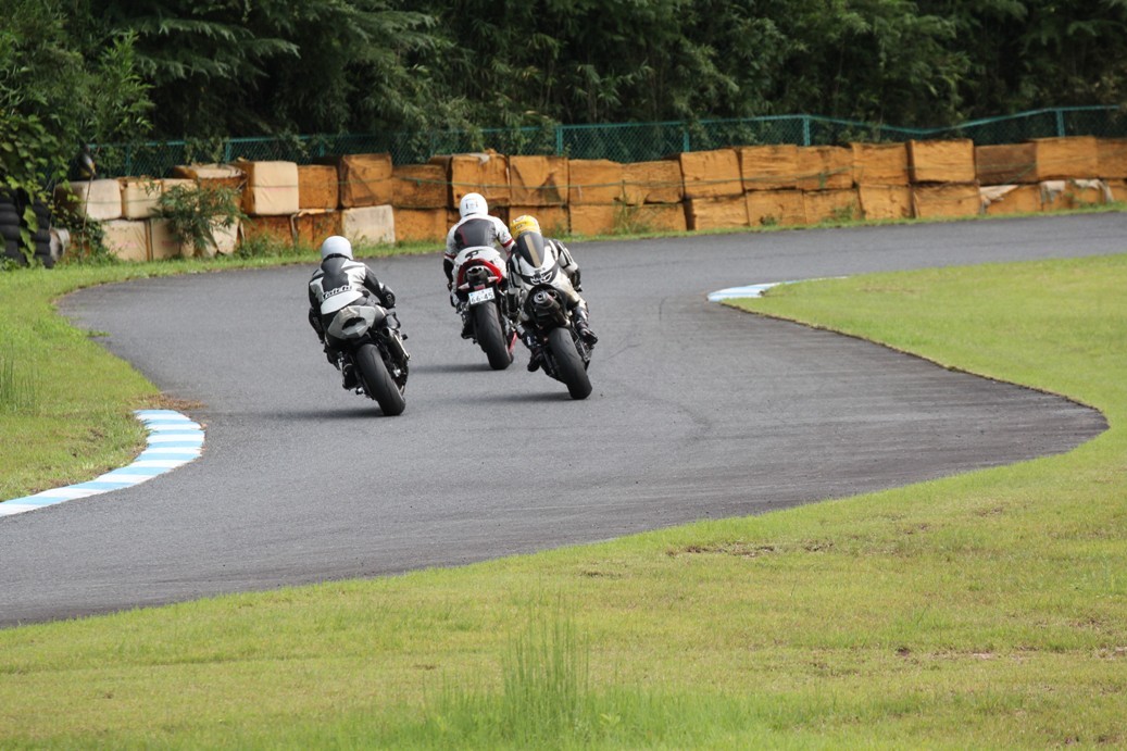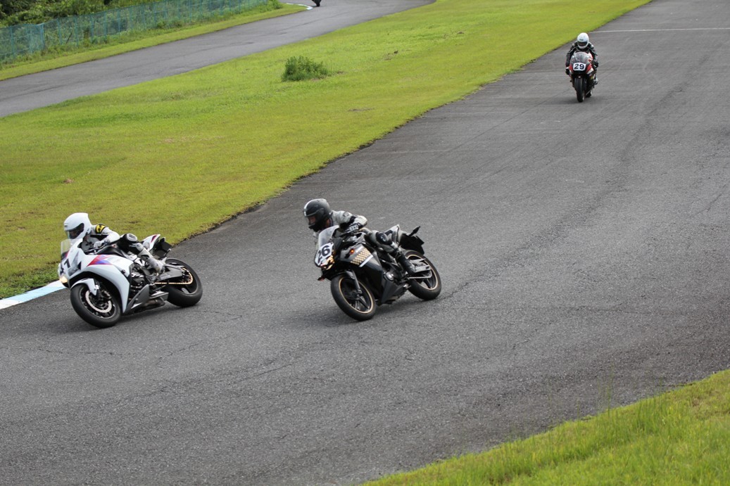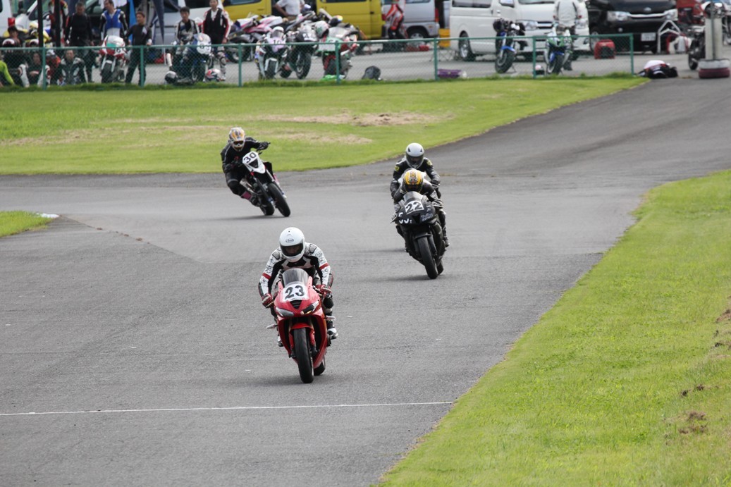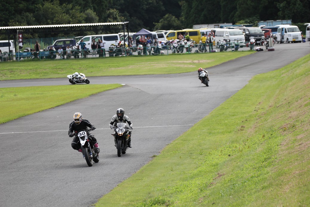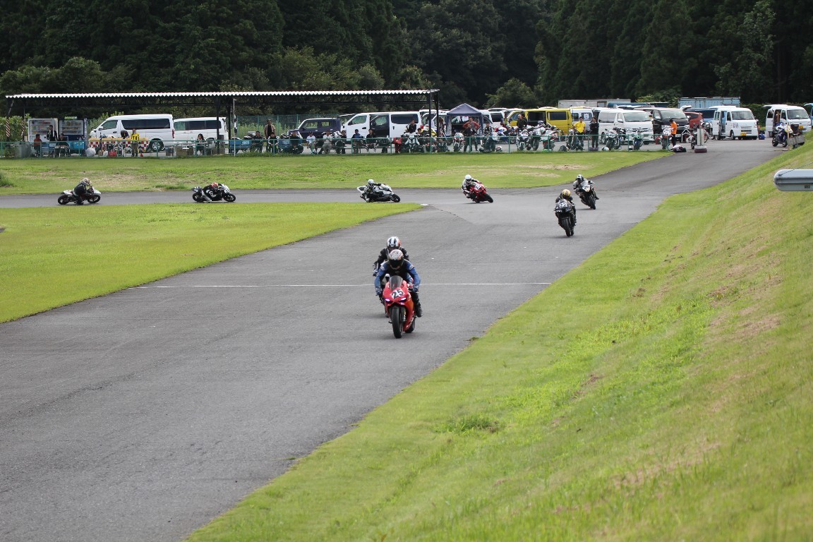 3番手には初参加でセカンドローから出た門間CBR600RR、4番手にやや出遅れた高島デイトナ675、6番手に渡辺CBR250R、7番手に大塚S1000RR、予選4番手から出た松野SMR449は大きく出遅れて8番手、9番手に前田CBR1000RR、そして10番手に安居GSXR750。