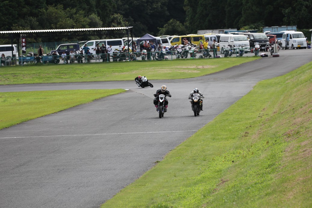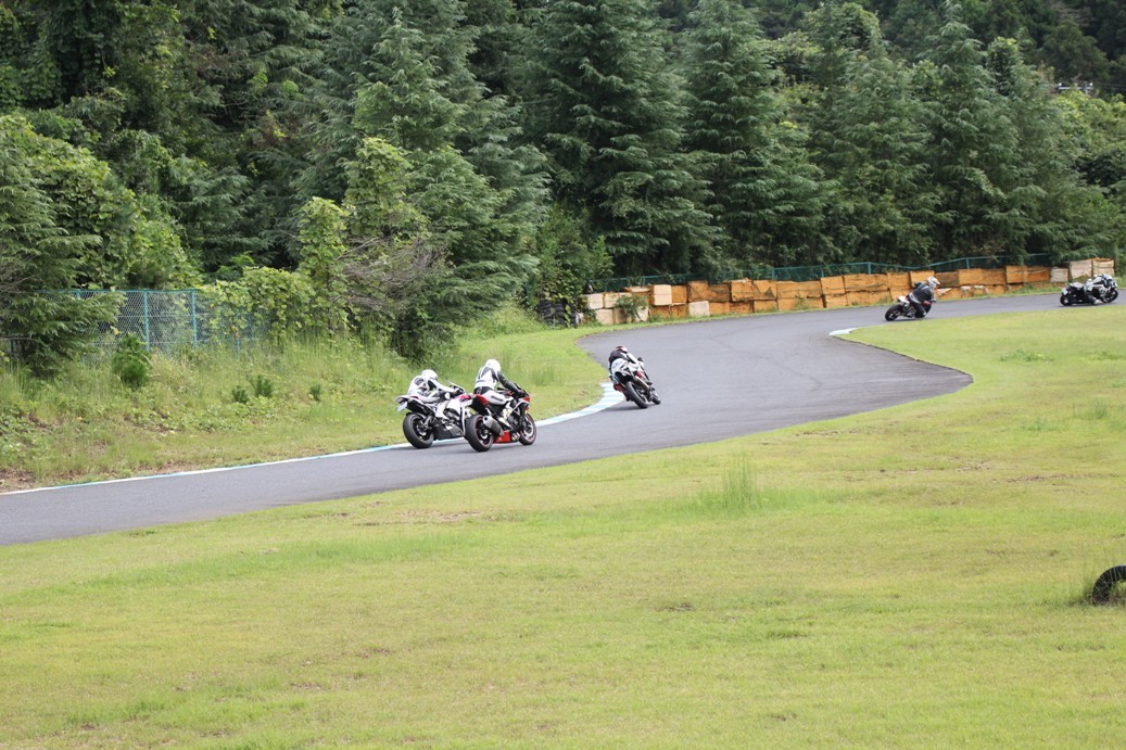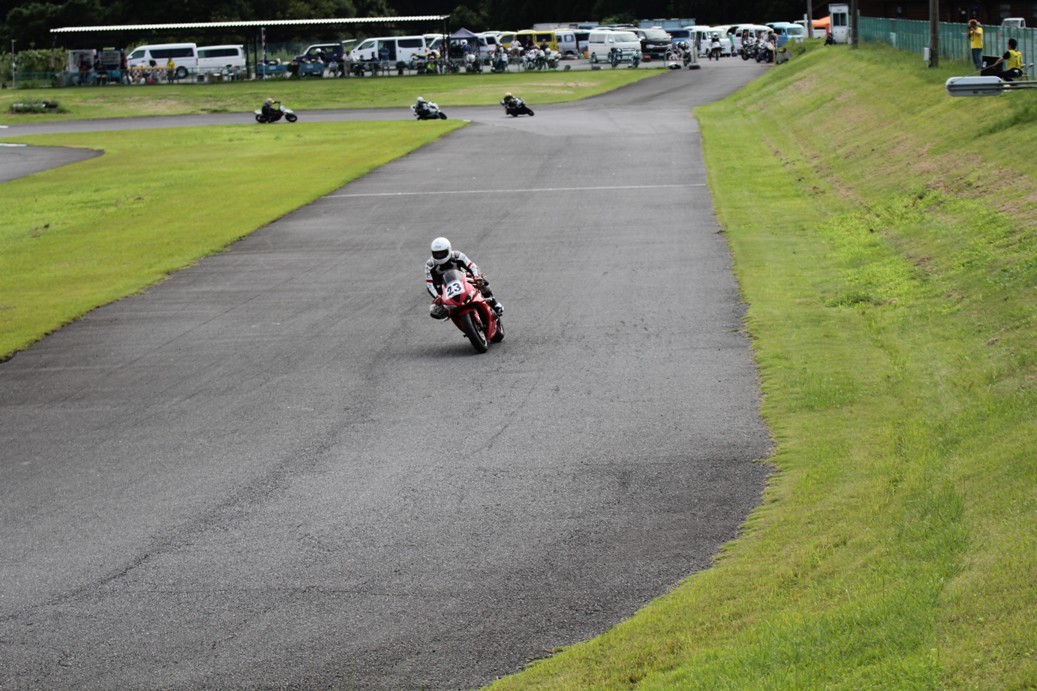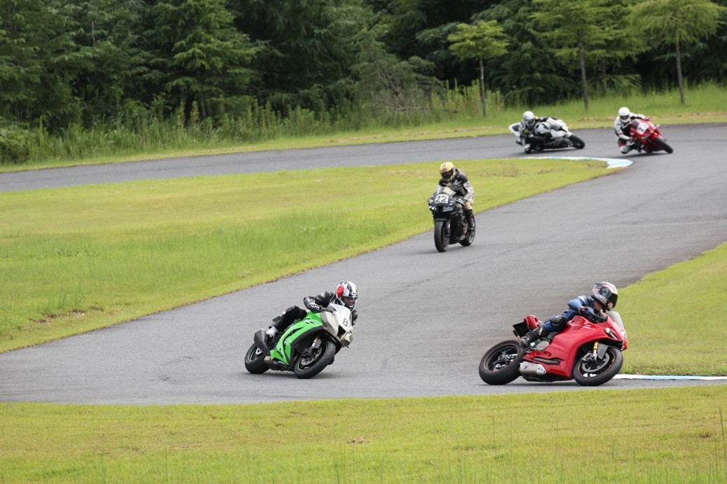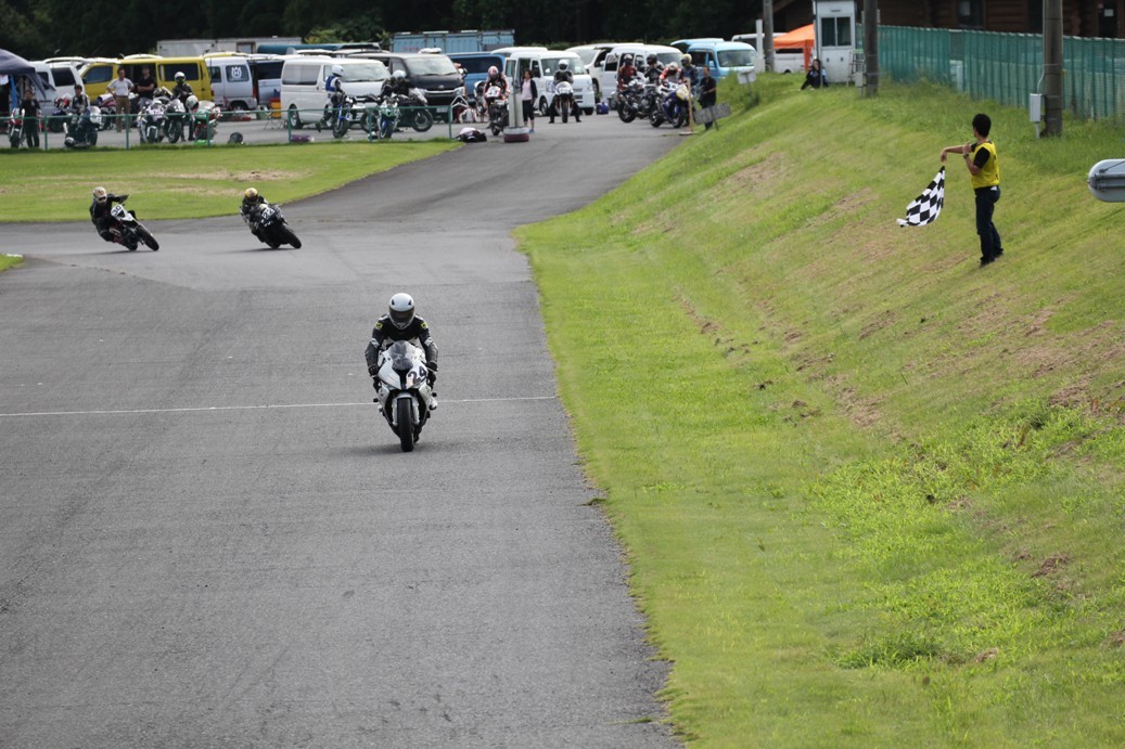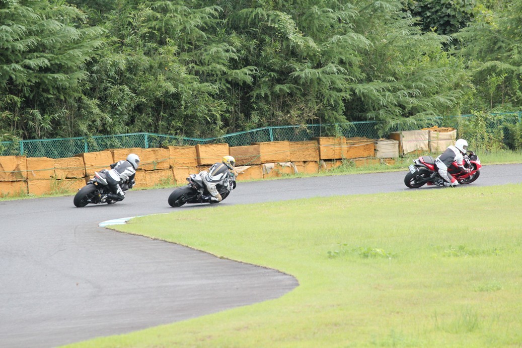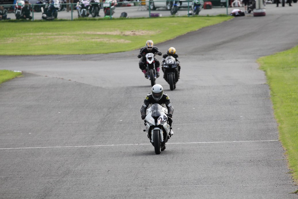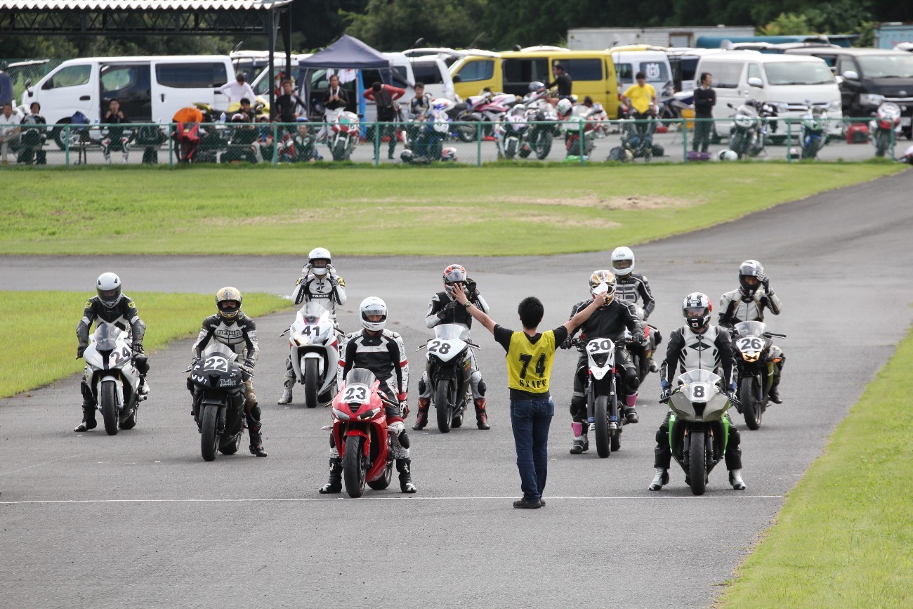 3番手には初参加でセカンドローから出た門間CBR600RR、4番手にやや出遅れた高島デイトナ675、6番手に渡辺CBR250R、7番手に大塚S1000RR、予選4番手から出た松野SMR449は大きく出遅れて8番手、9番手に前田CBR1000RR、そして10番手に安居GSXR750。