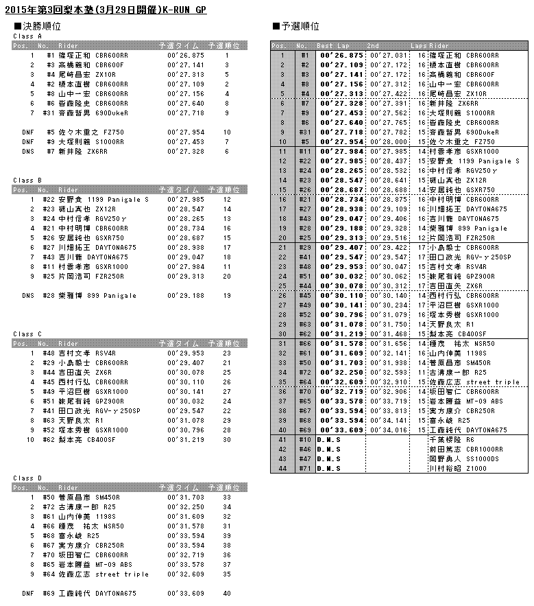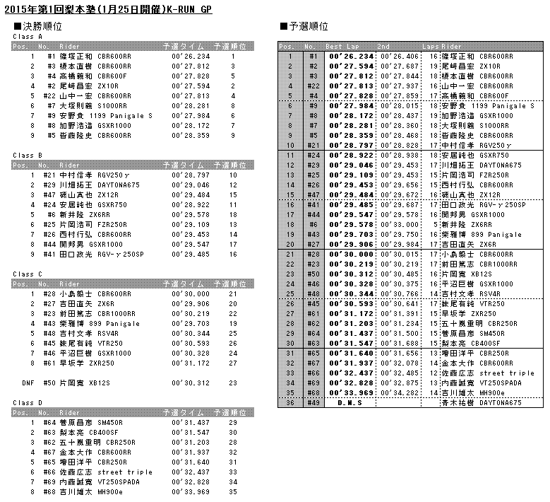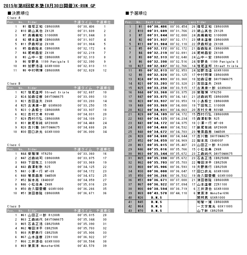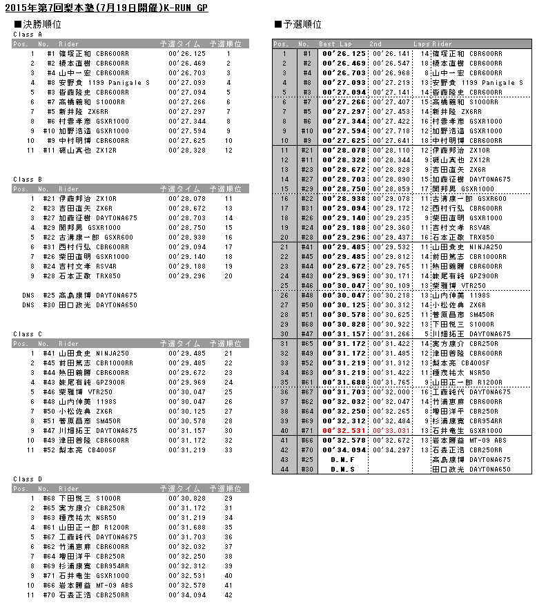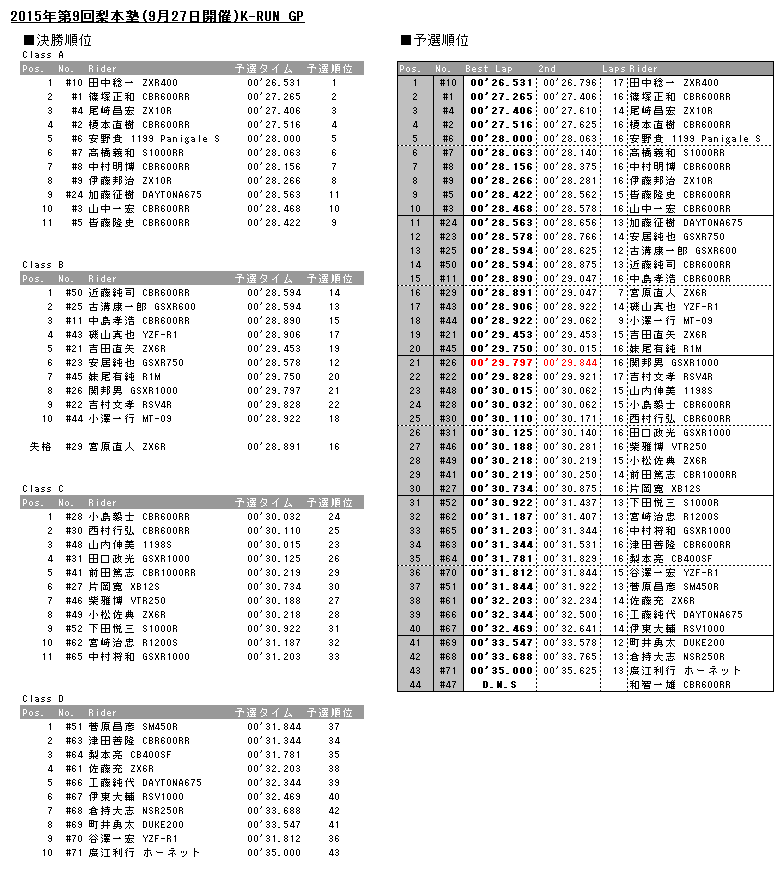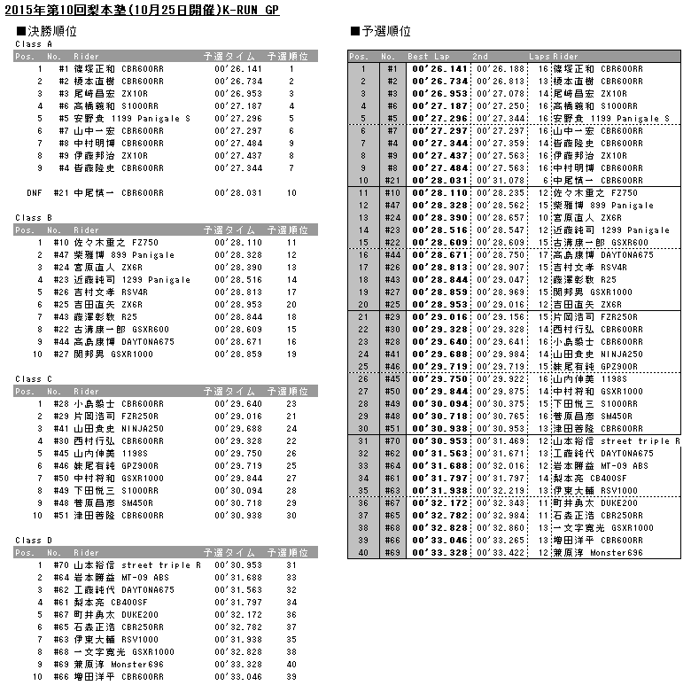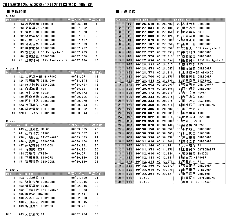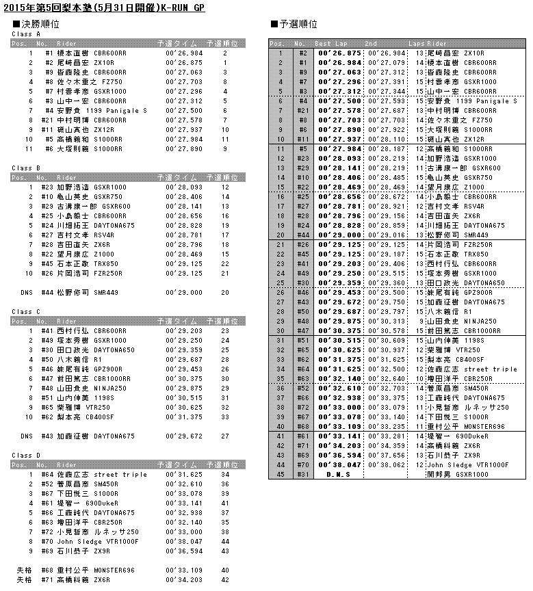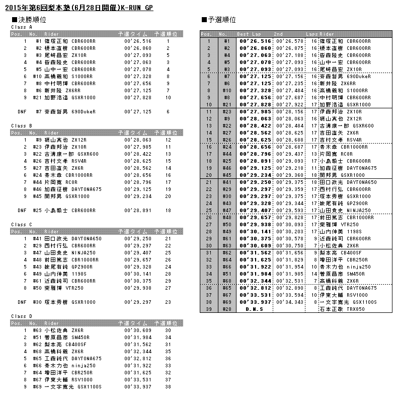 ※ 便宜上予選順位に関しては「タイム順」としたが、決勝リザルトに関しては、エントリークラス内での順位決定とした(K-RUN-GPポポイントも同じ)。