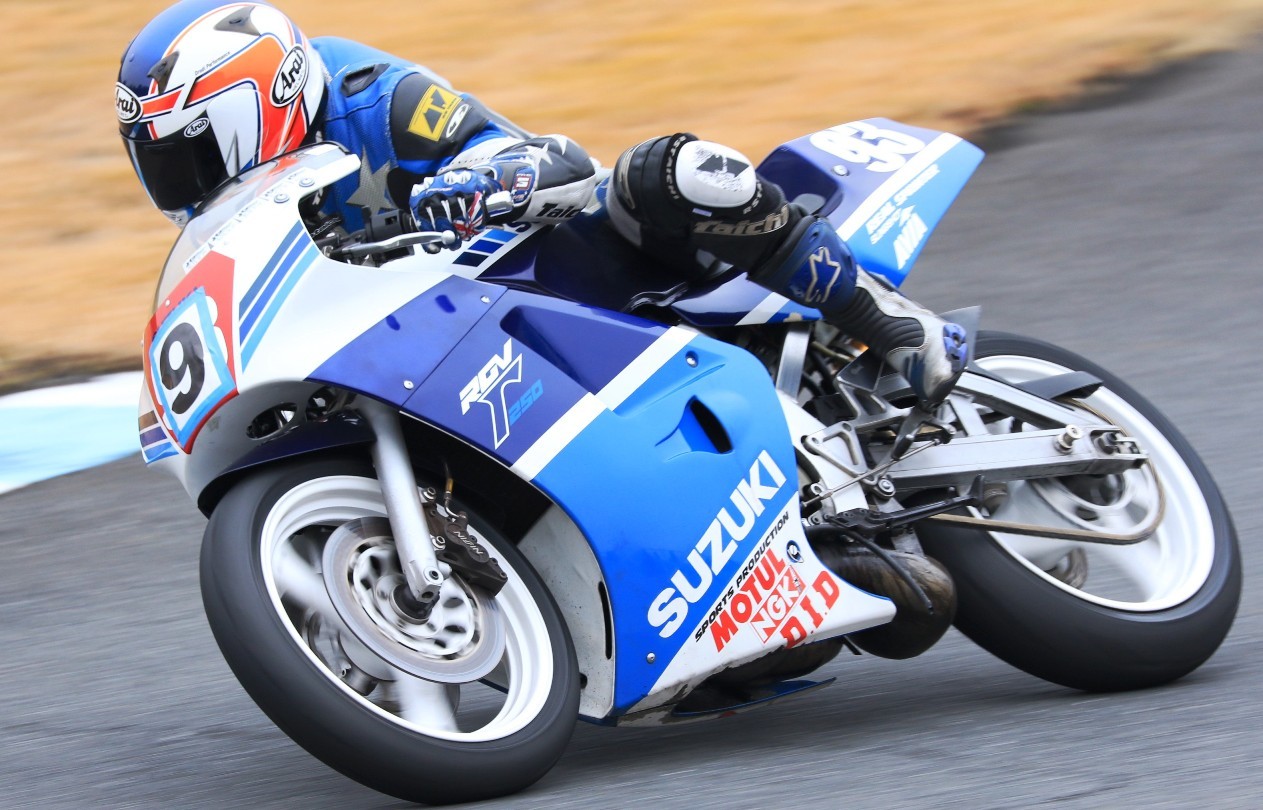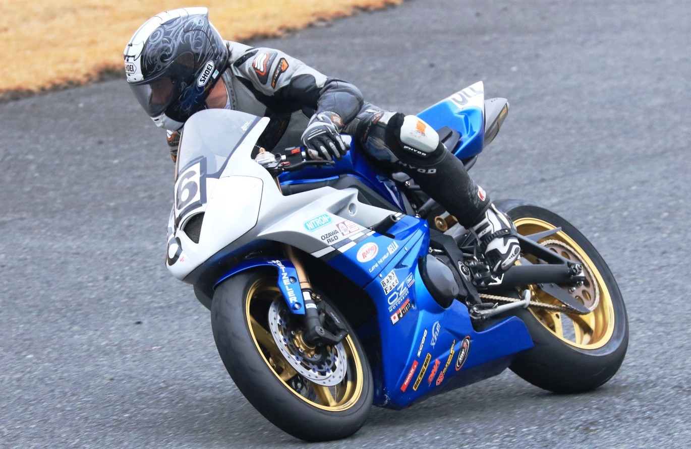 なんとかインをキープ。ホールショットを決める。2番手に大塚、3番手には好スタートを切った磯山ZX12R、4番手に中村RGV-γ。