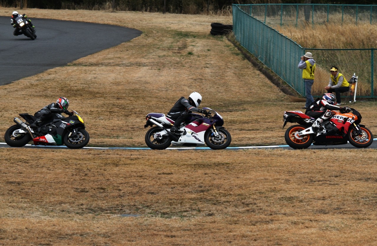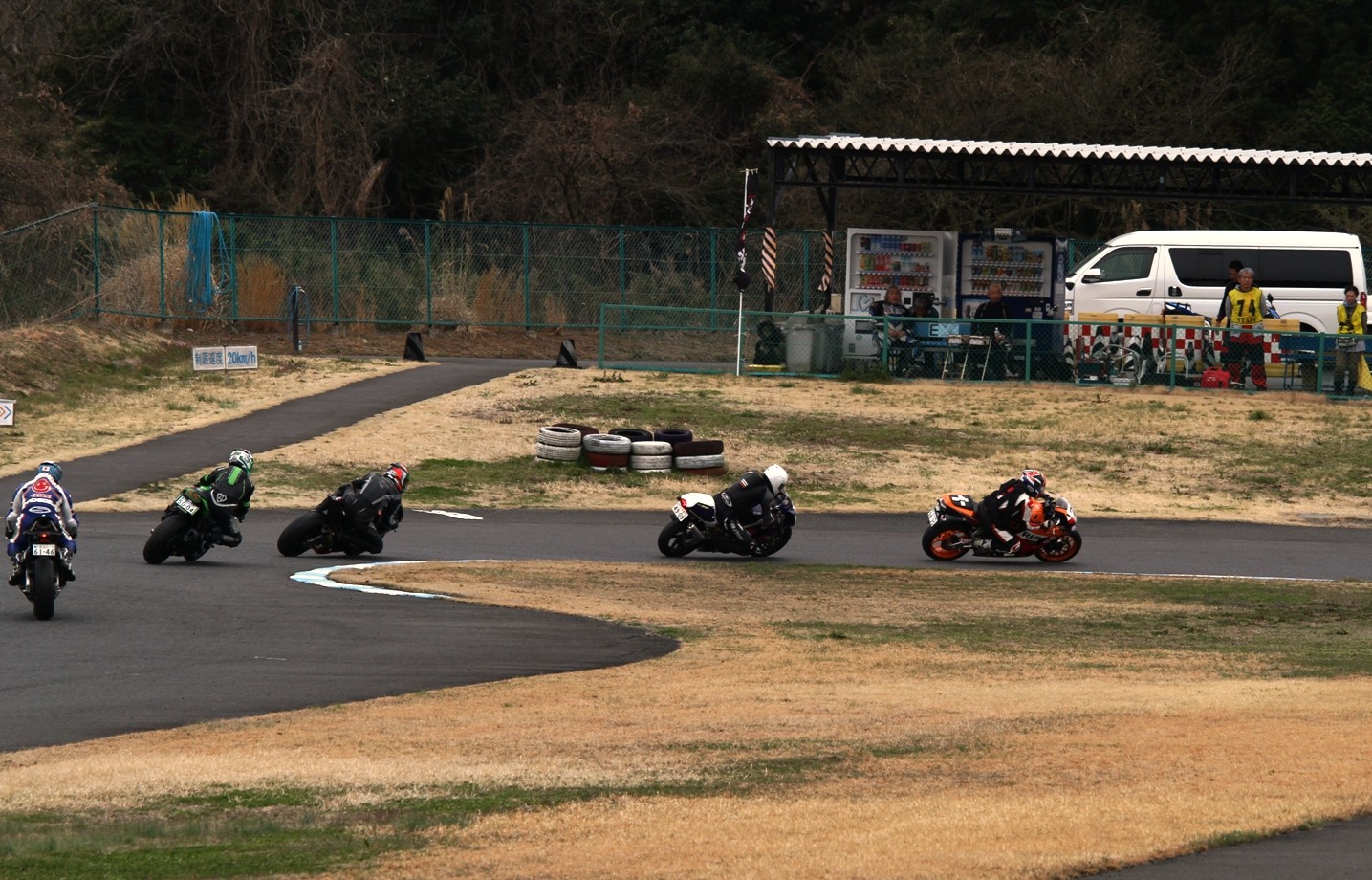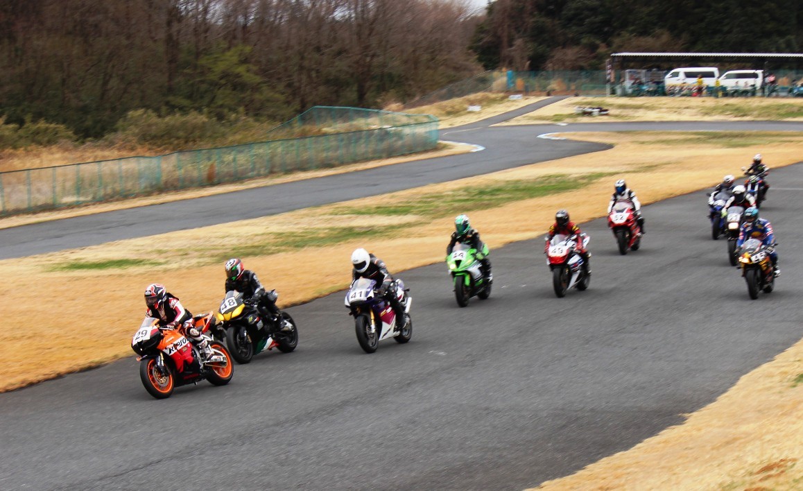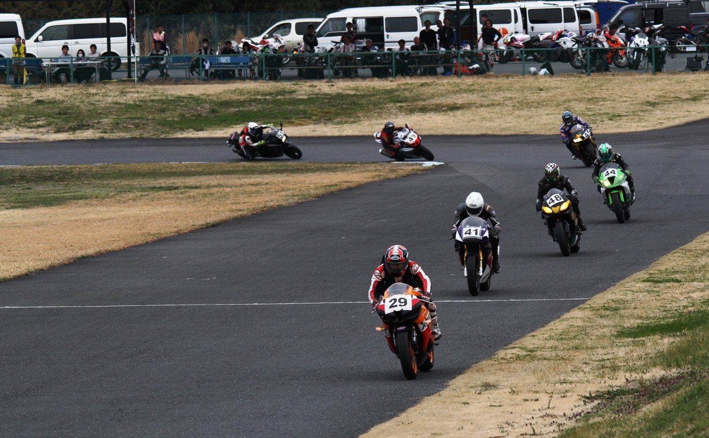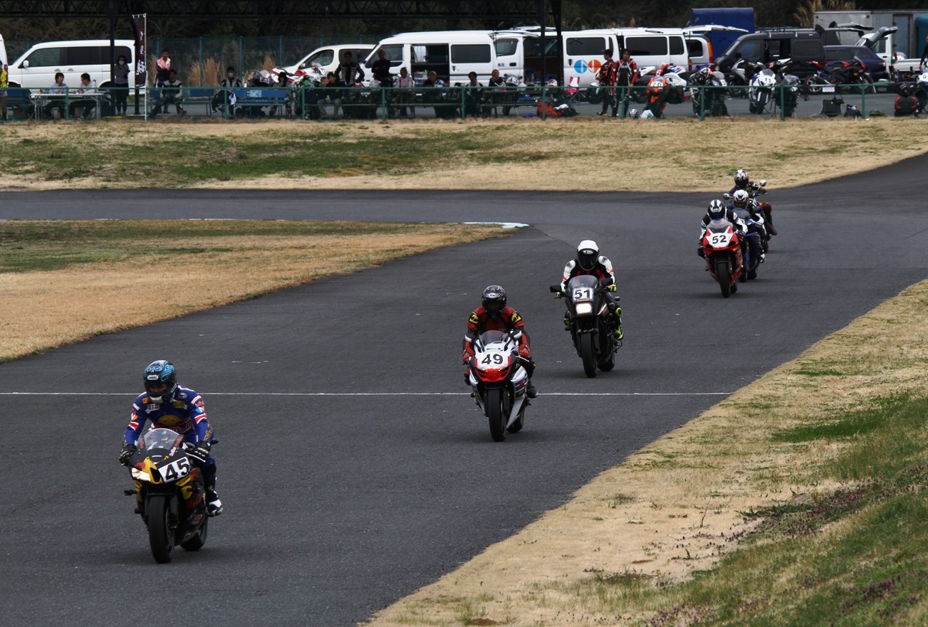 2番手に吉村RSV4R、3番手に田口RGV-γ、4番手に吉田ZX6R、5番手に西村CBR600RR、6番手に平沼GSXR1000、7番手に塚本GSXR1000、8番手に妹尾GPZ900R、9番手に天野R1………