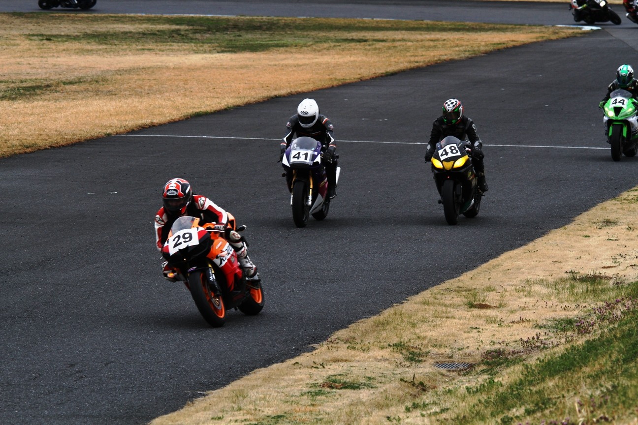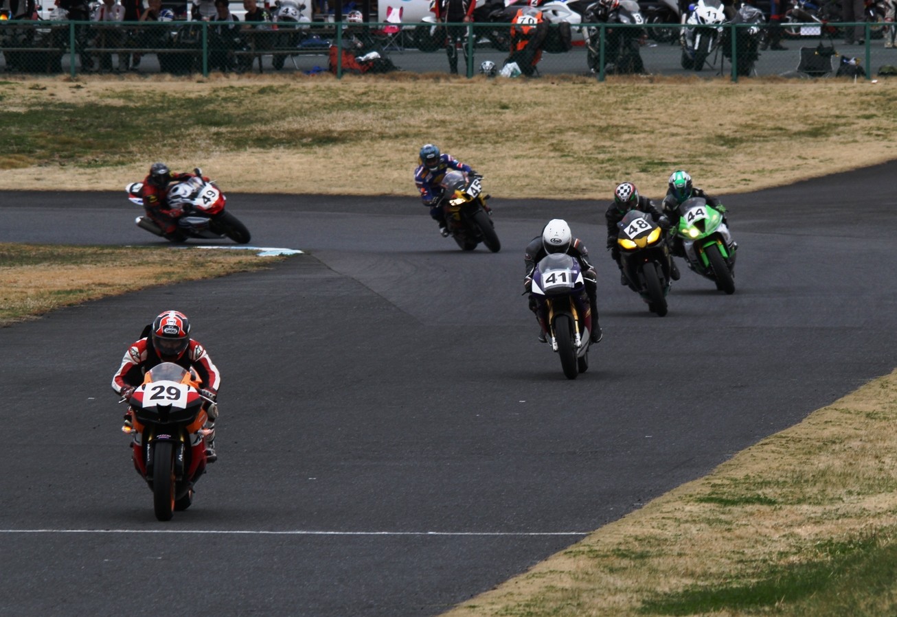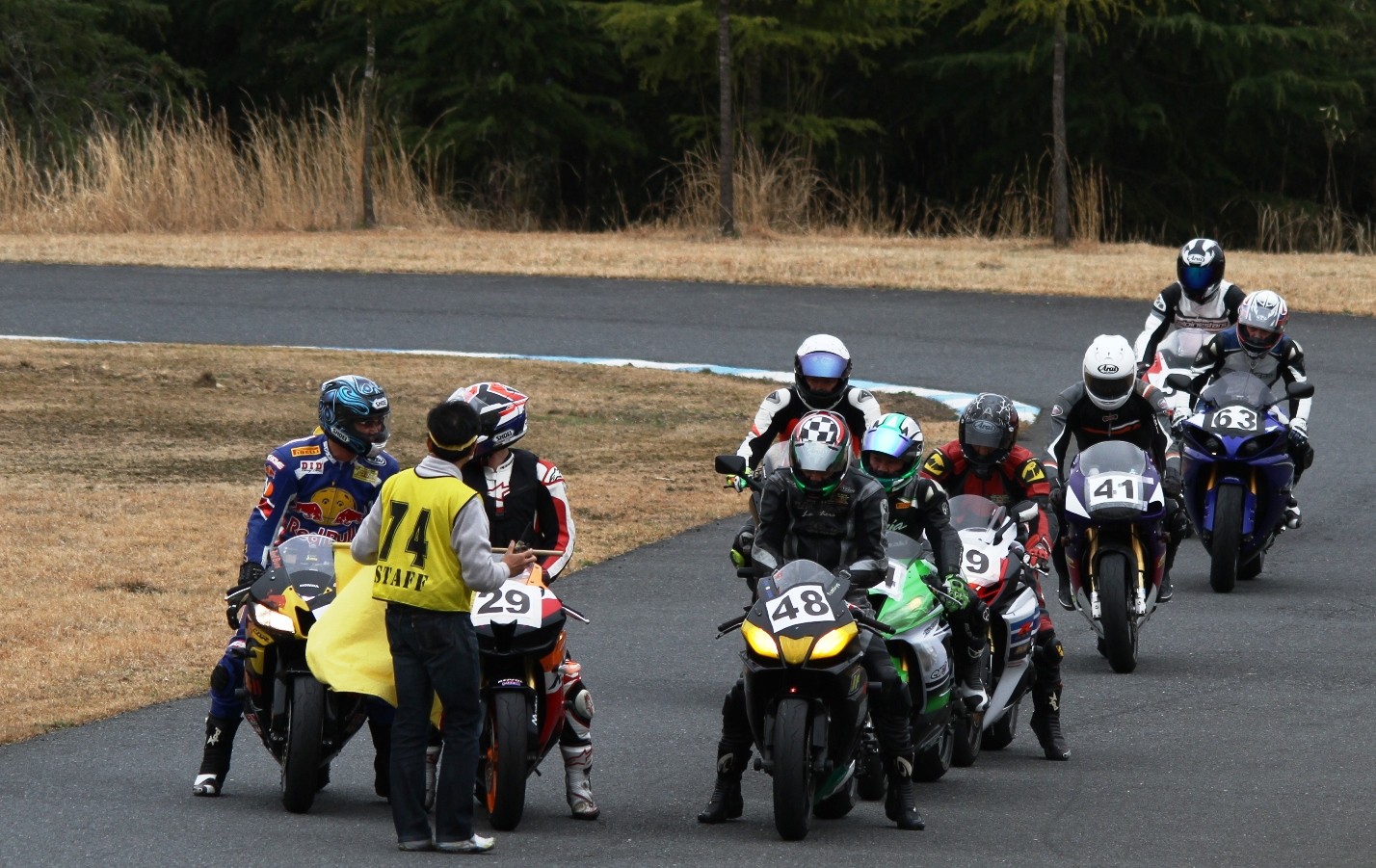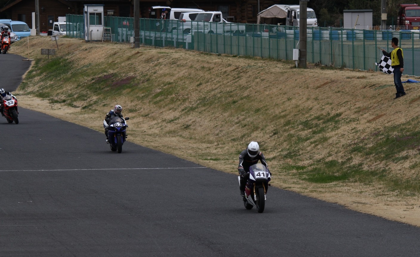 2番手に吉村RSV4R、3番手に田口RGV-γ、4番手に吉田ZX6R、5番手に西村CBR600RR、6番手に平沼GSXR1000、7番手に塚本GSXR1000、8番手に妹尾GPZ900R、9番手に天野R1………