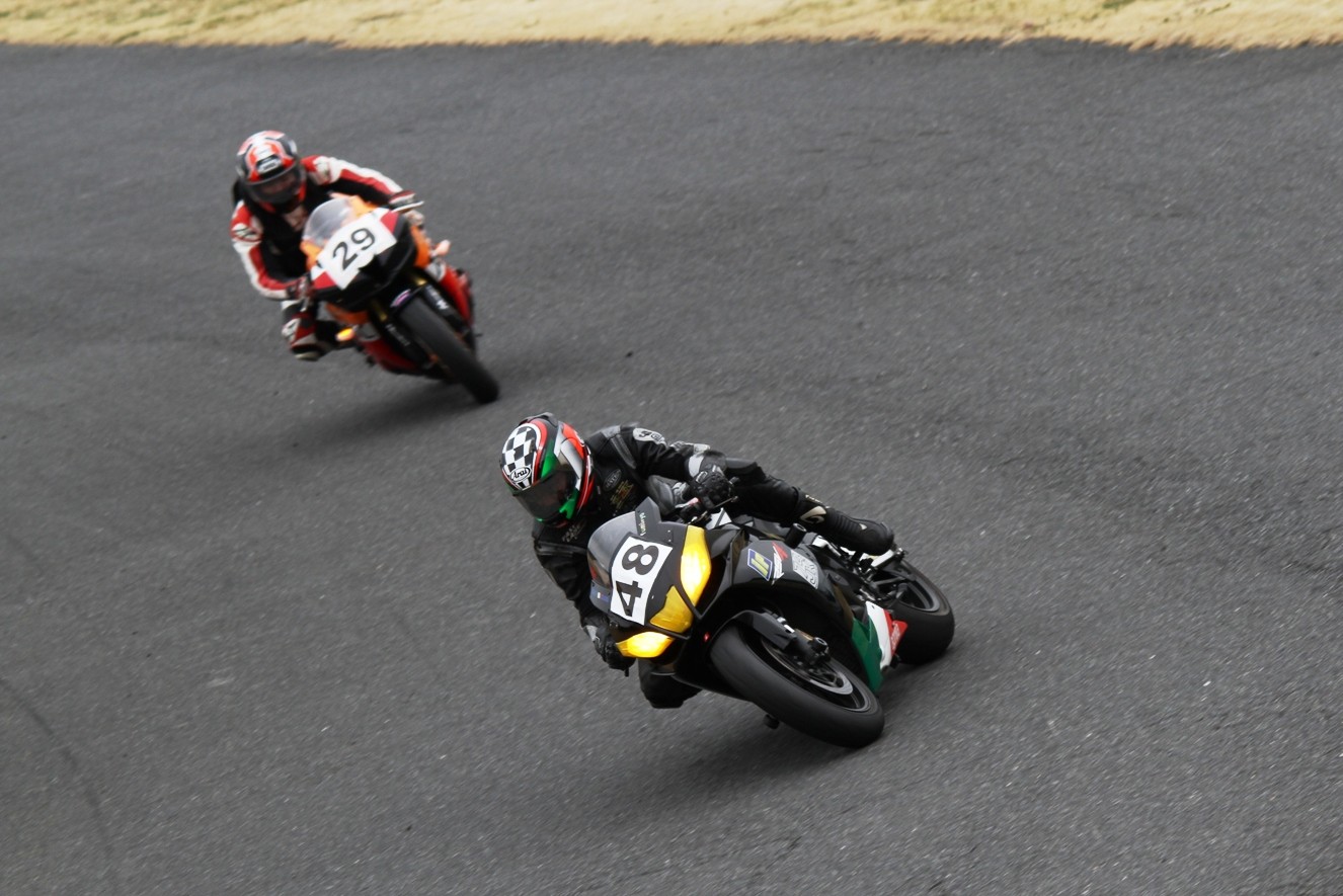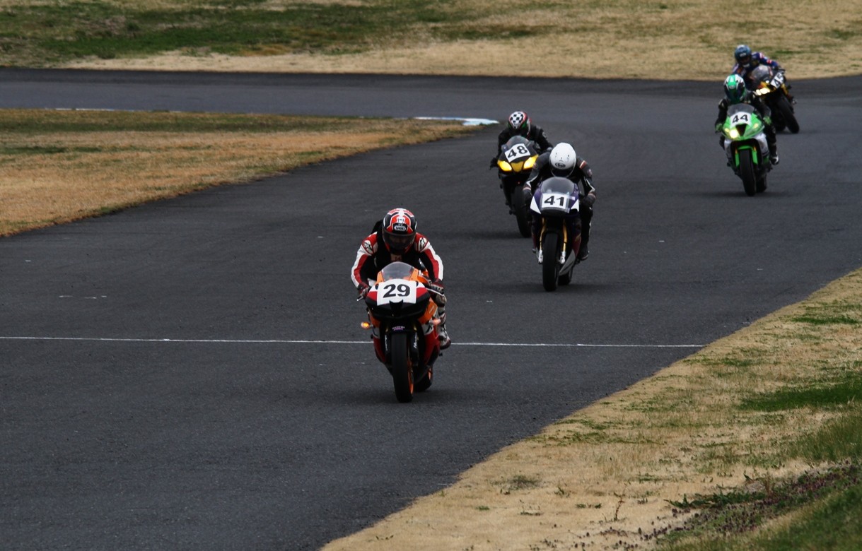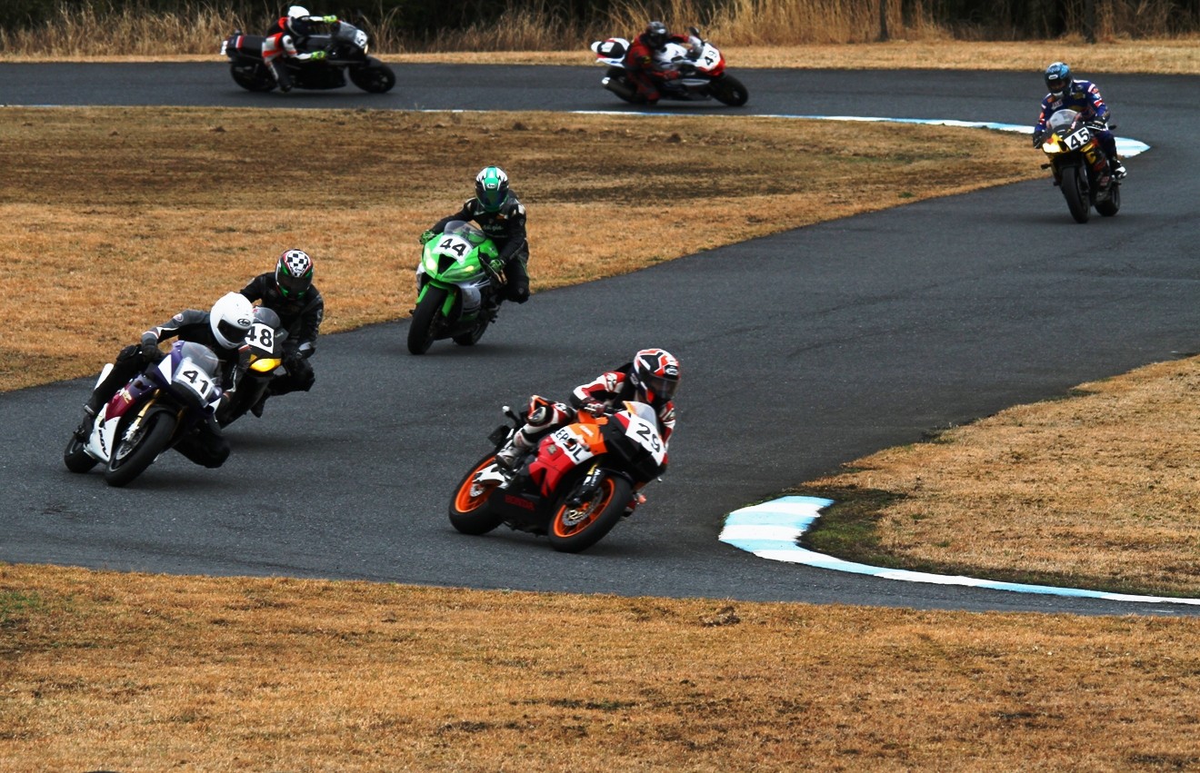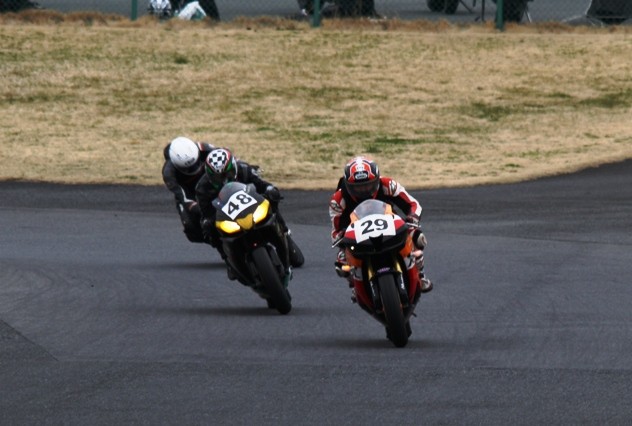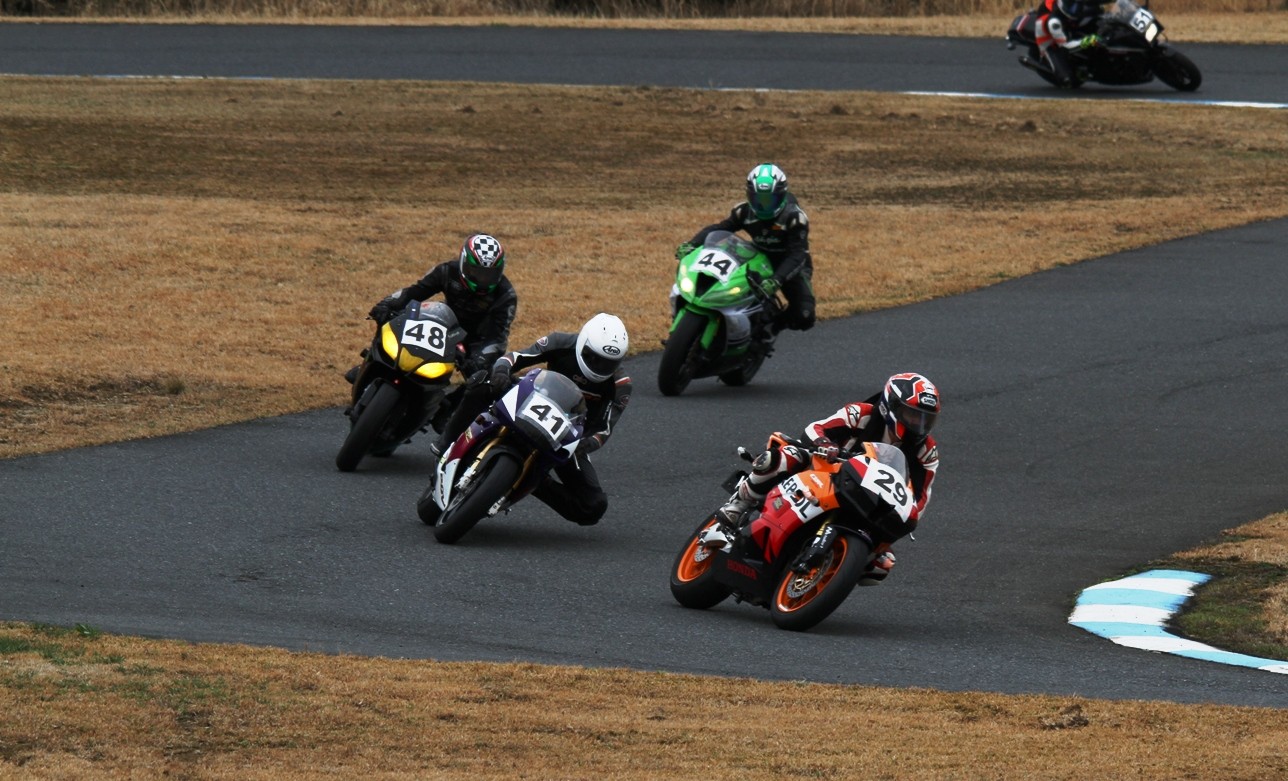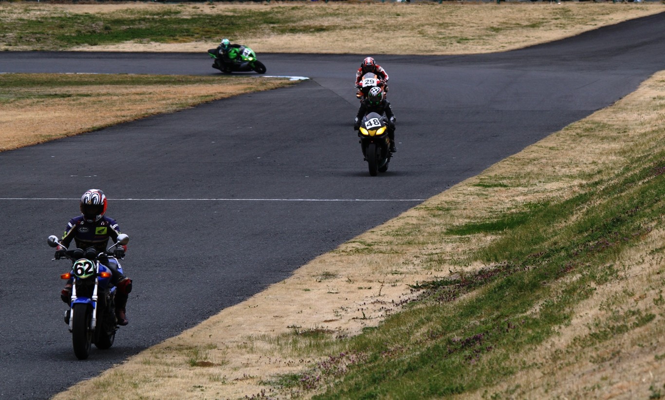 2番手に吉村RSV4R、3番手に田口RGV-γ、4番手に吉田ZX6R、5番手に西村CBR600RR、6番手に平沼GSXR1000、7番手に塚本GSXR1000、8番手に妹尾GPZ900R、9番手に天野R1………