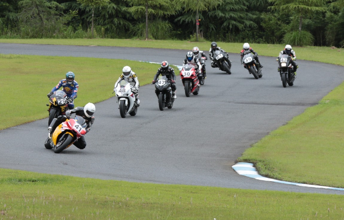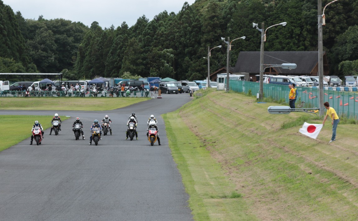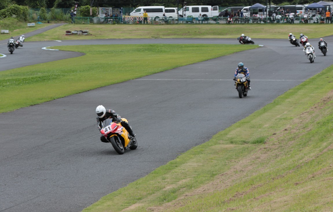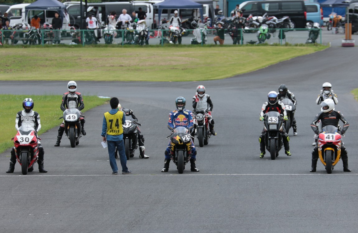 2番手に西村CBR600RRで、3番手にはサードグリッドからジャンプアップを果たした前田CBR1000RR、4番手に塚本GSXR1000、5番手に山田Ninja250、6番手に妹尾GPZ900R、7番手に山内1198S、8番手に柴VTR250、9番手に近藤CBR600RR。