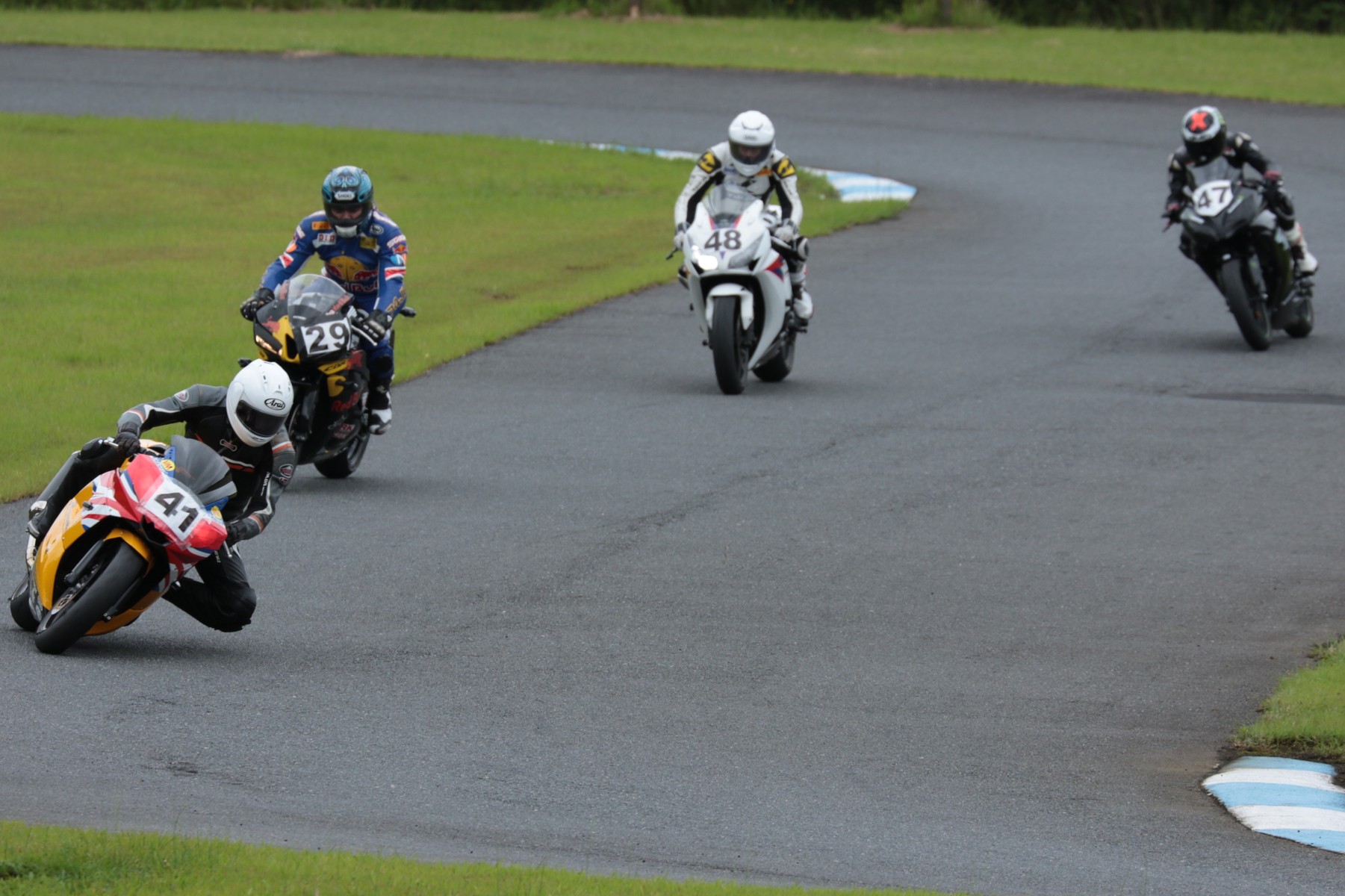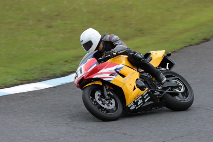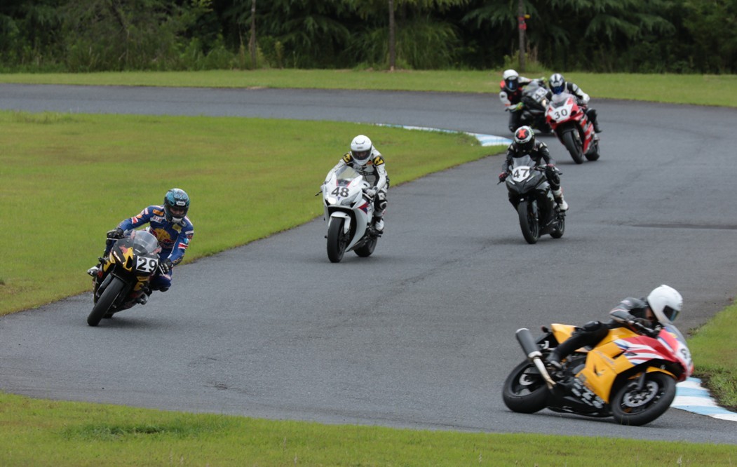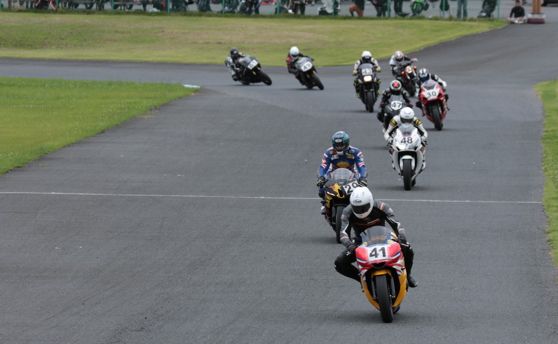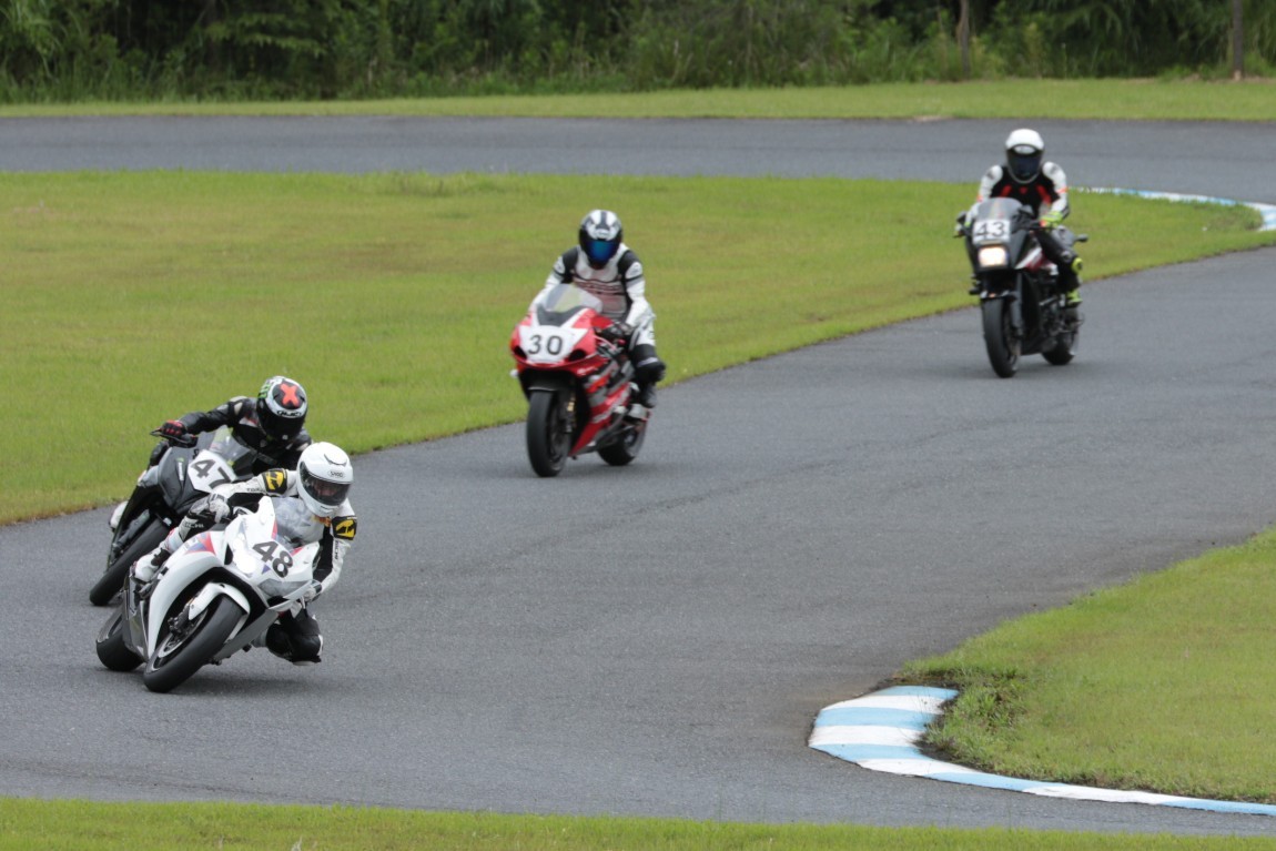 2番手に西村CBR600RRで、3番手にはサードグリッドからジャンプアップを果たした前田CBR1000RR、4番手に塚本GSXR1000、5番手に山田Ninja250、6番手に妹尾GPZ900R、7番手に山内1198S、8番手に柴VTR250、9番手に近藤CBR600RR。