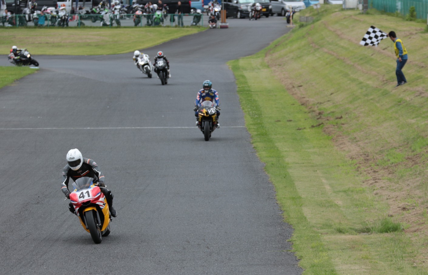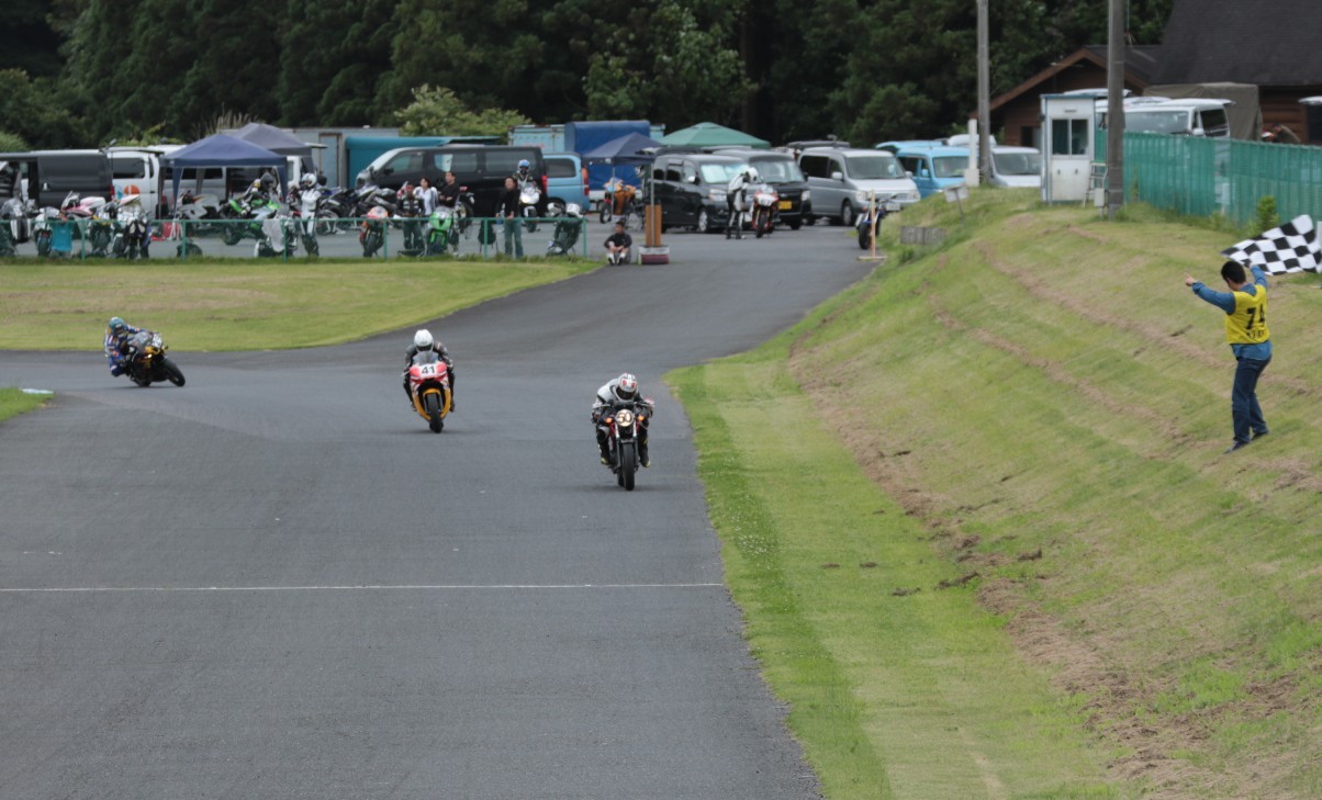 後続を引き離してトップチェッカーへ。2位には西村。