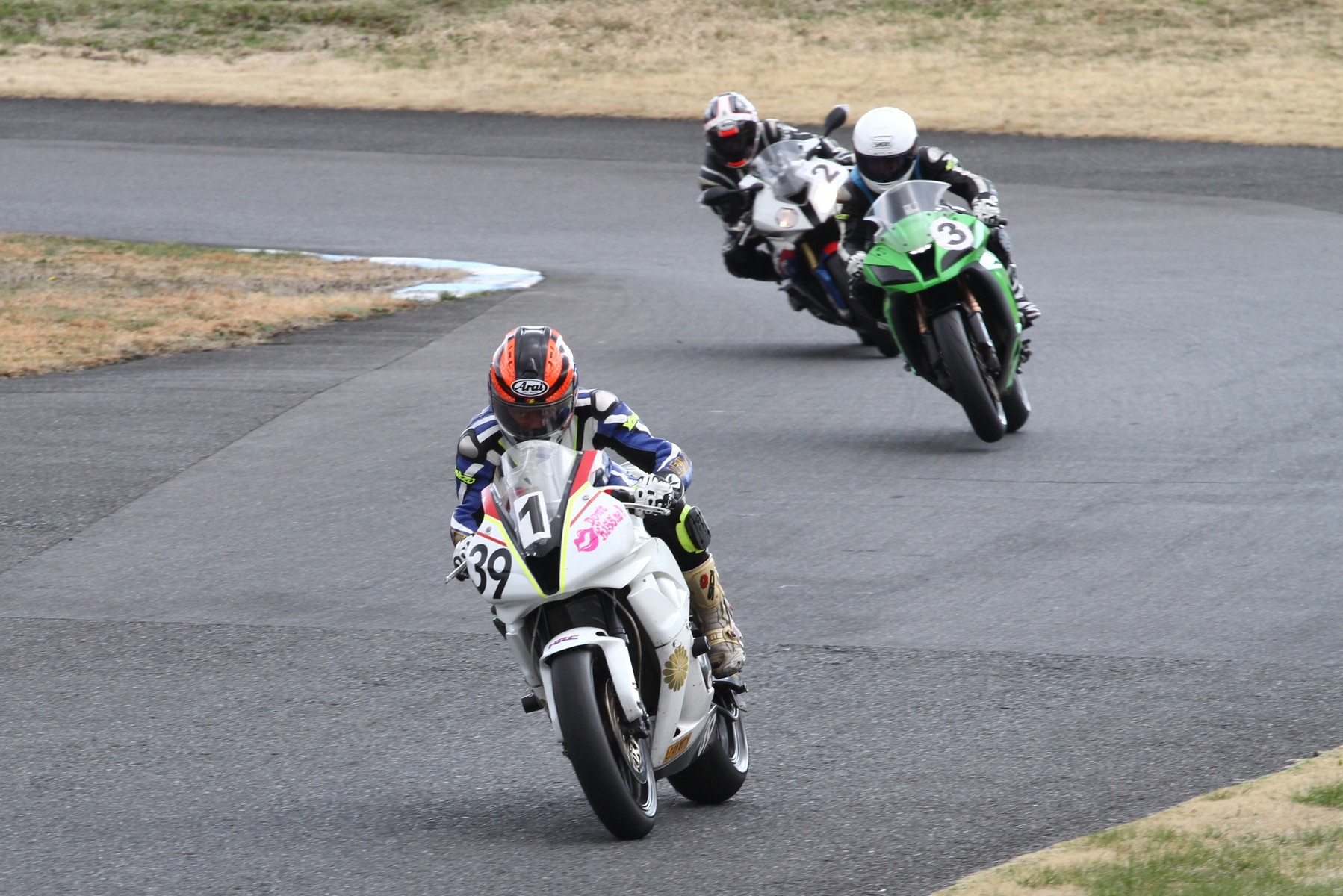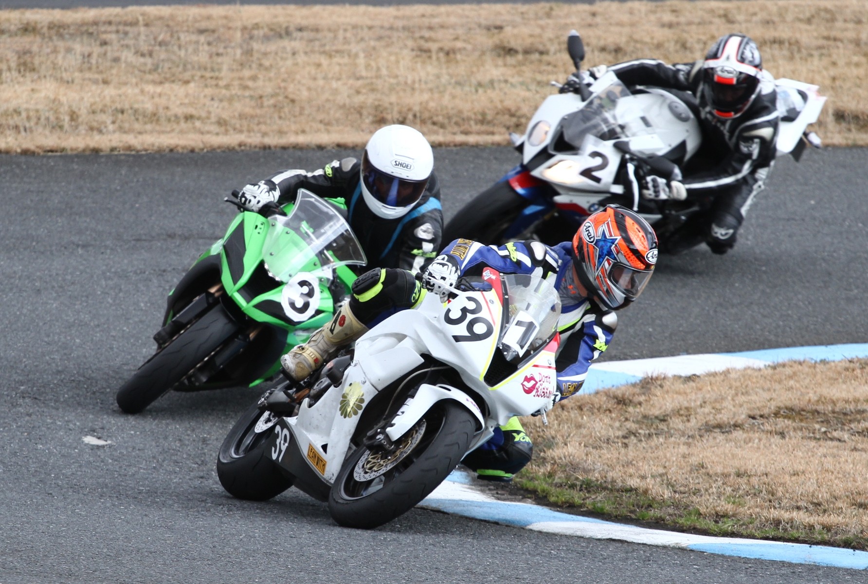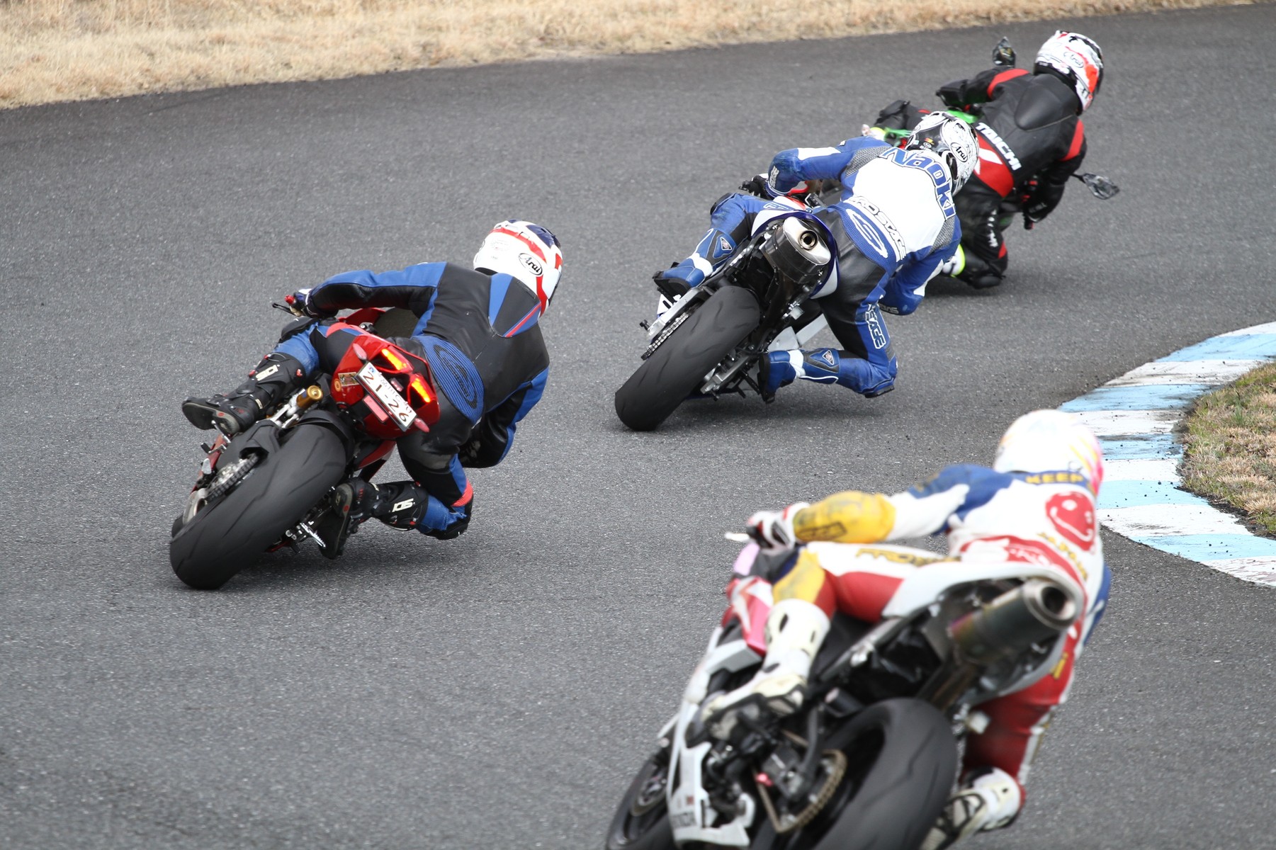 溜まらずラインブレイク。3番手には高橋S1000RR、4位争いは………