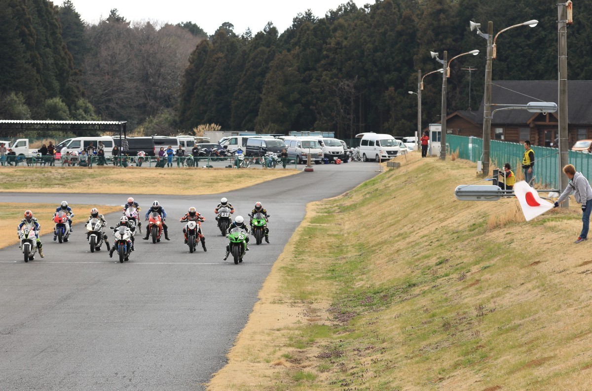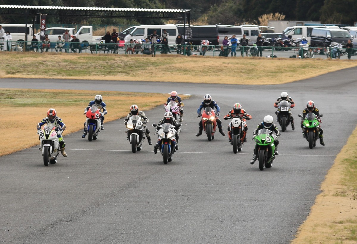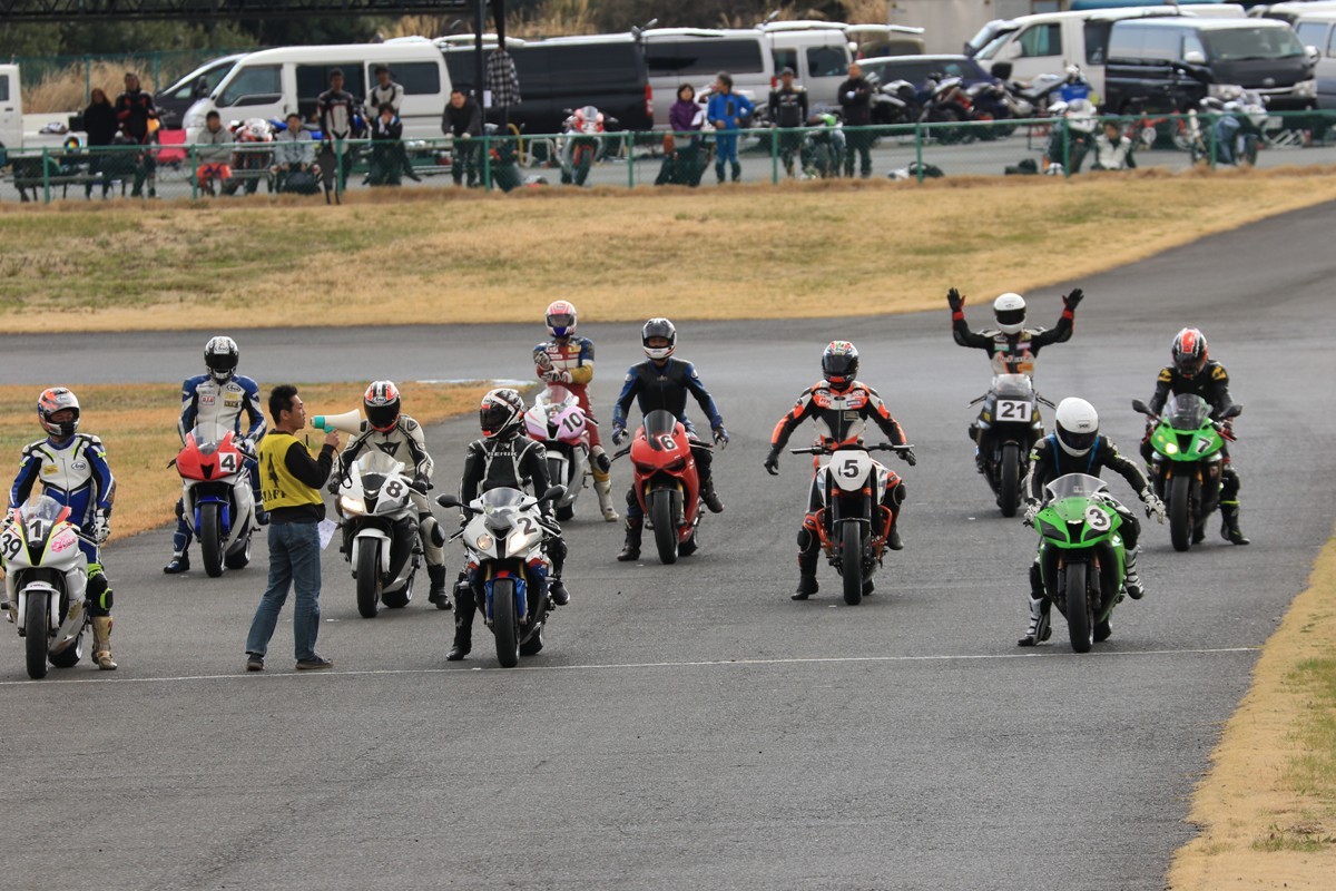 グリッドに整列。フロントローにはZX10R、S1000RR、そしてCBR600RRが並ぶ。ポールポジションから4番手までの差は、僅かに0.094秒ほど。誰がトップに立ってもおかしくない。