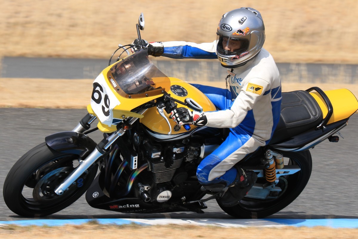 モト3クラスなみに伏せてフル加速するのは、この四月に喜寿を迎えた#50梨本亮CB400SF。