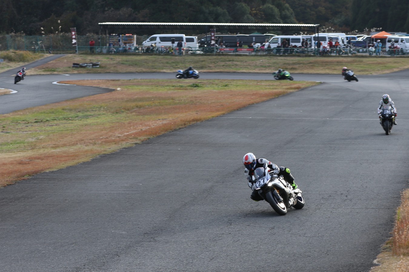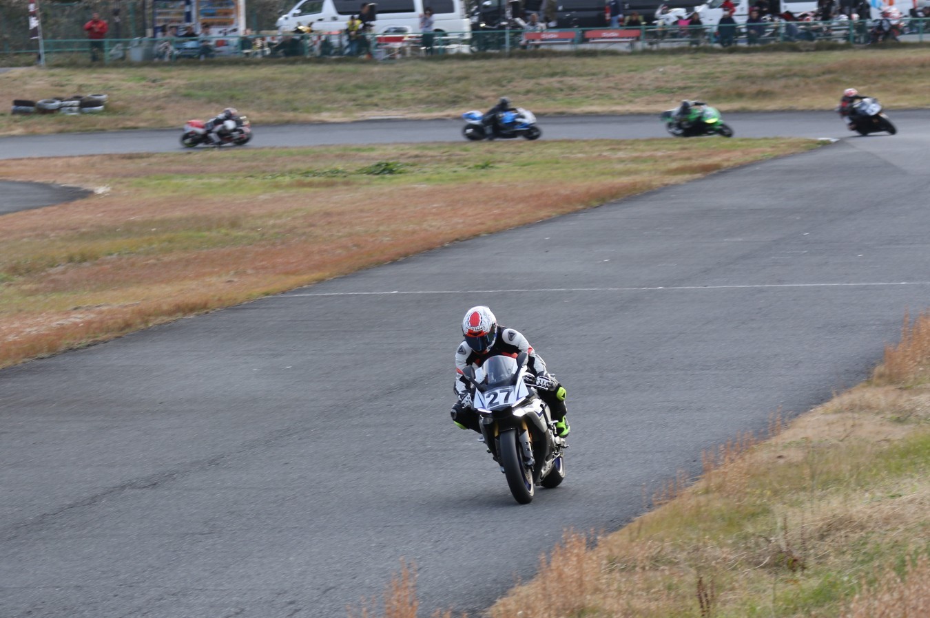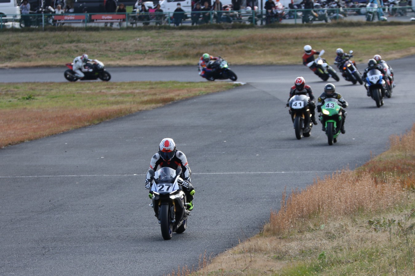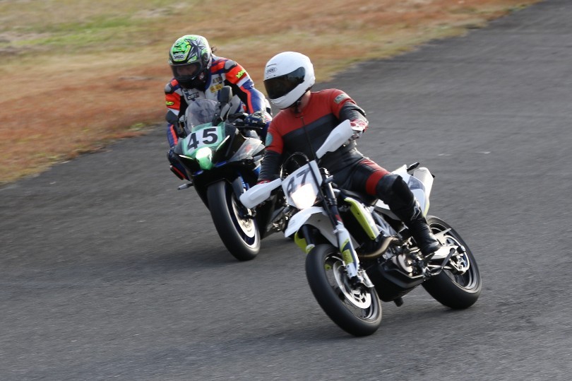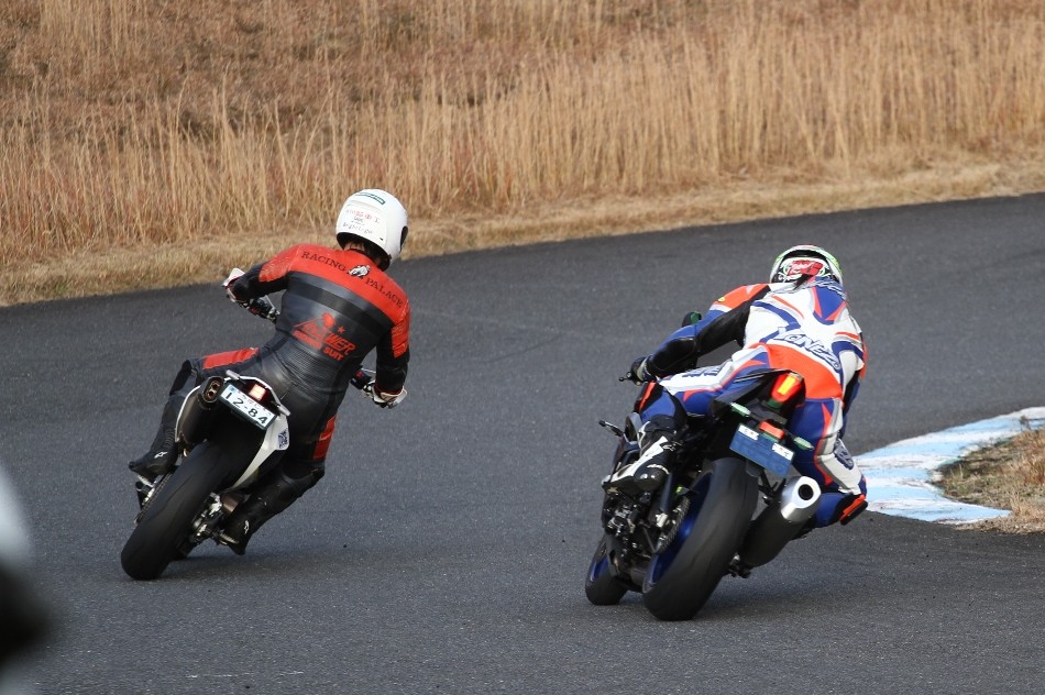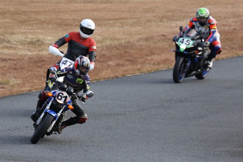 2番手に伊藤Ninja250、3番手には二列目からジャンプアップした山内1198S、4番手に山田GSXR1000、5番手に喜多TZR250R、6番手に梨本亮CB400SF、7番手に菅原701スーパーモト、8番手に古溝GSXR1000R、9番手に吉村RSV4Rと続く。