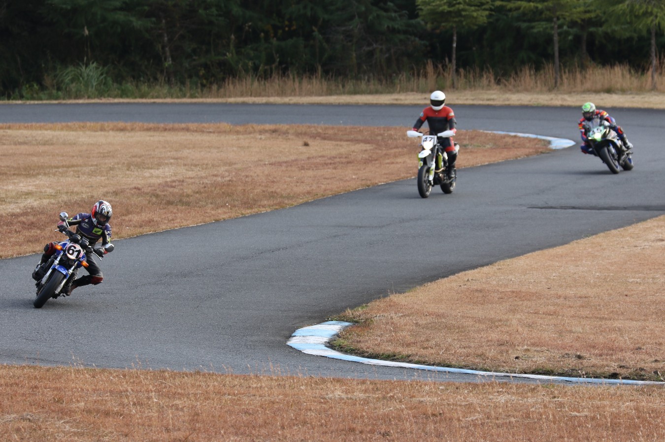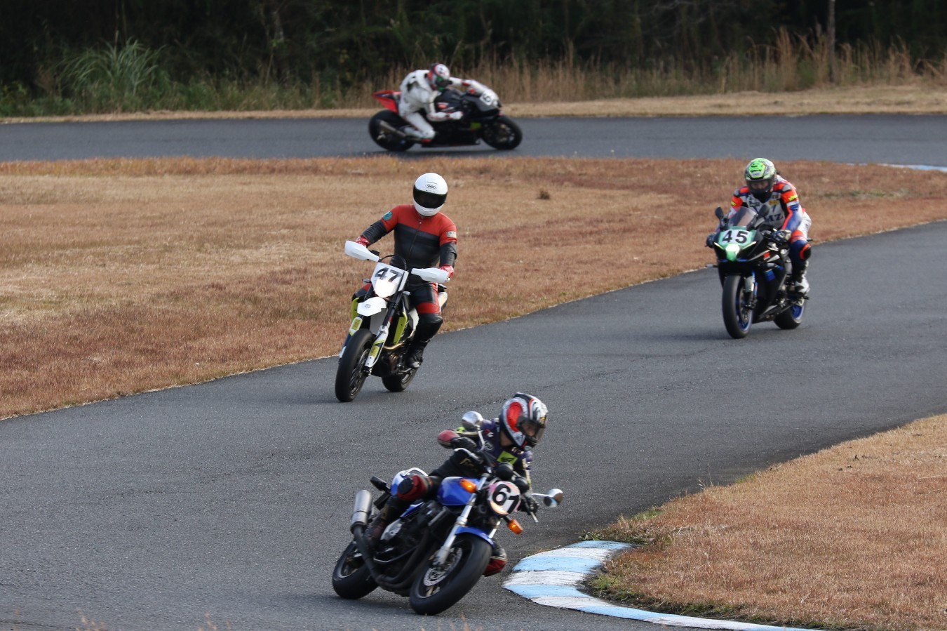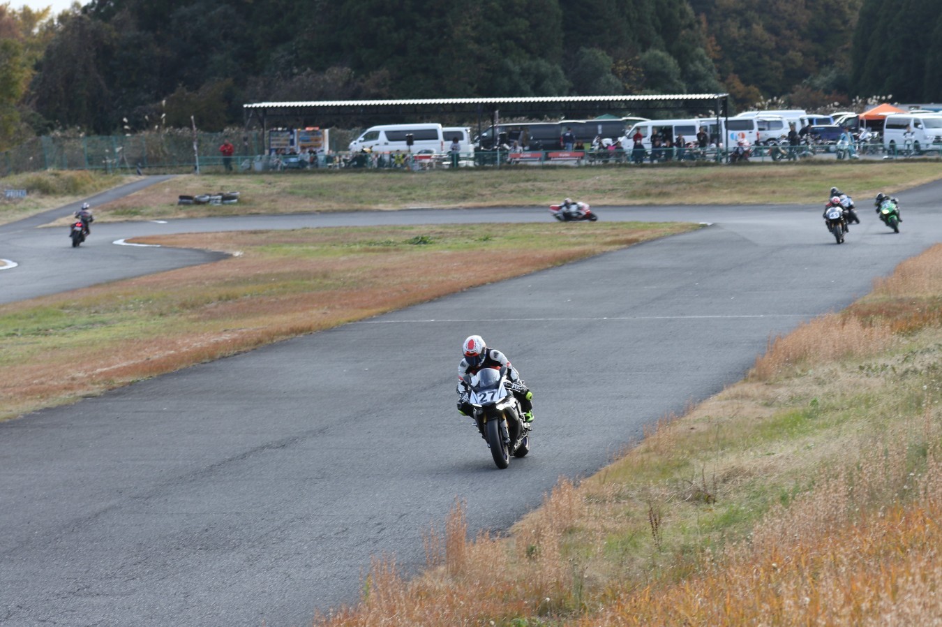 2番手に伊藤Ninja250、3番手には二列目からジャンプアップした山内1198S、4番手に山田GSXR1000、5番手に喜多TZR250R、6番手に梨本亮CB400SF、7番手に菅原701スーパーモト、8番手に古溝GSXR1000R、9番手に吉村RSV4Rと続く。