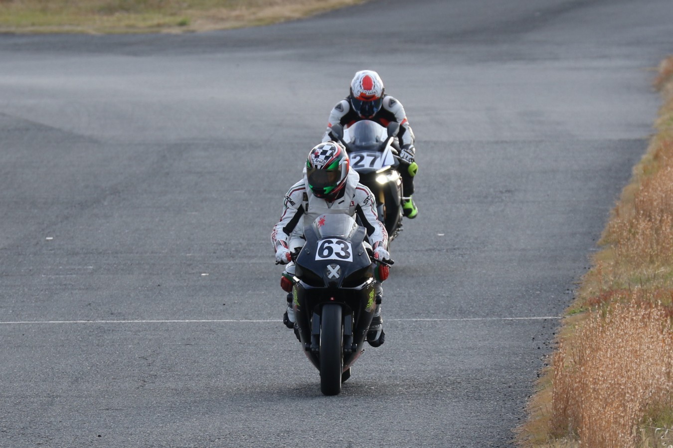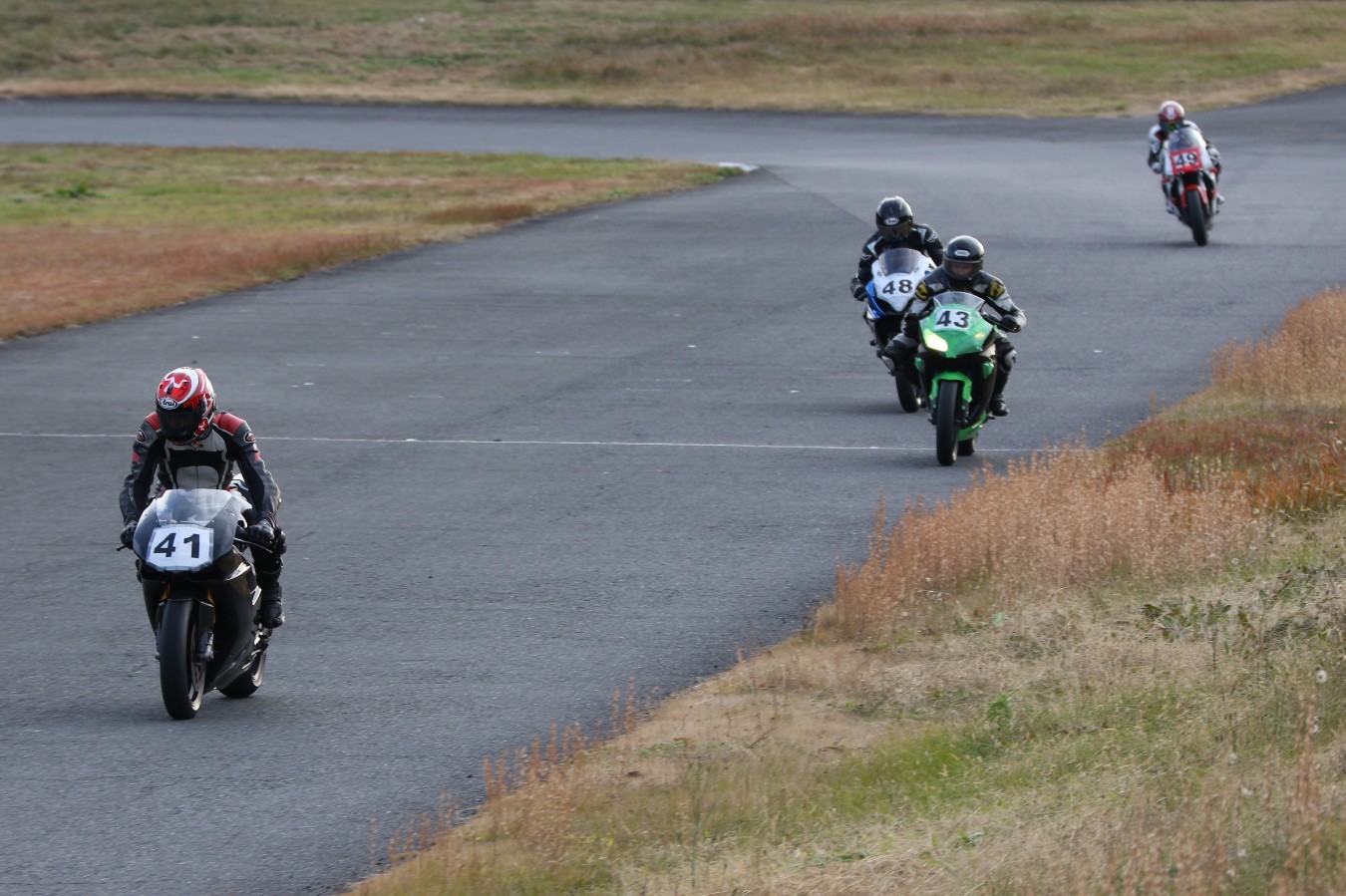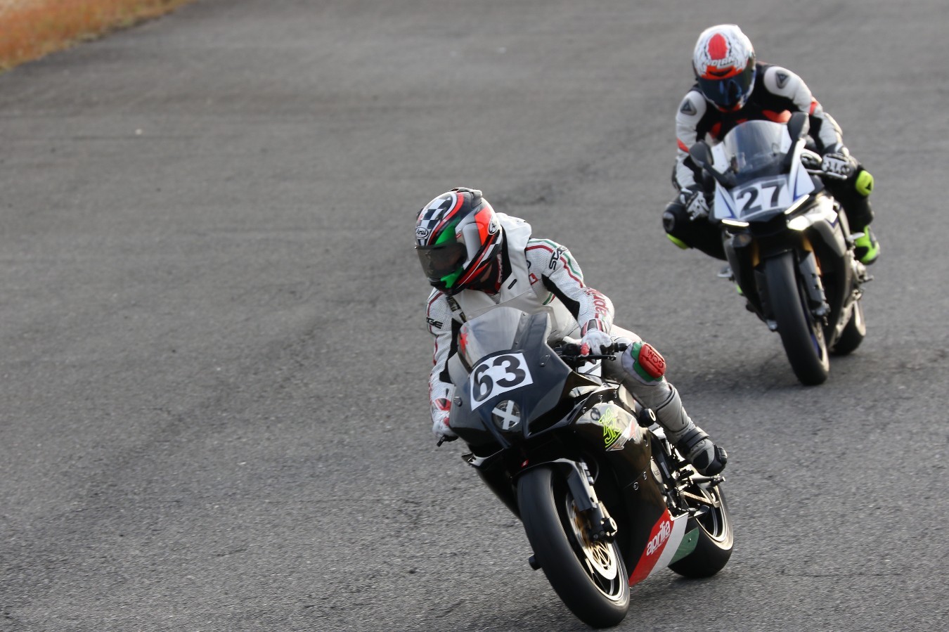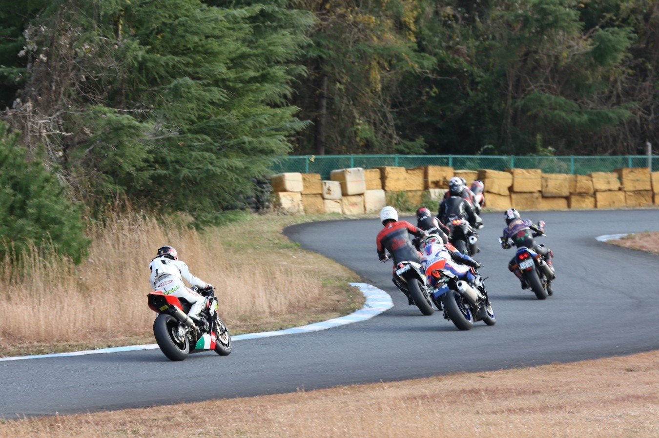 2番手に伊藤Ninja250、3番手には二列目からジャンプアップした山内1198S、4番手に山田GSXR1000、5番手に喜多TZR250R、6番手に梨本亮CB400SF、7番手に菅原701スーパーモト、8番手に古溝GSXR1000R、9番手に吉村RSV4Rと続く。