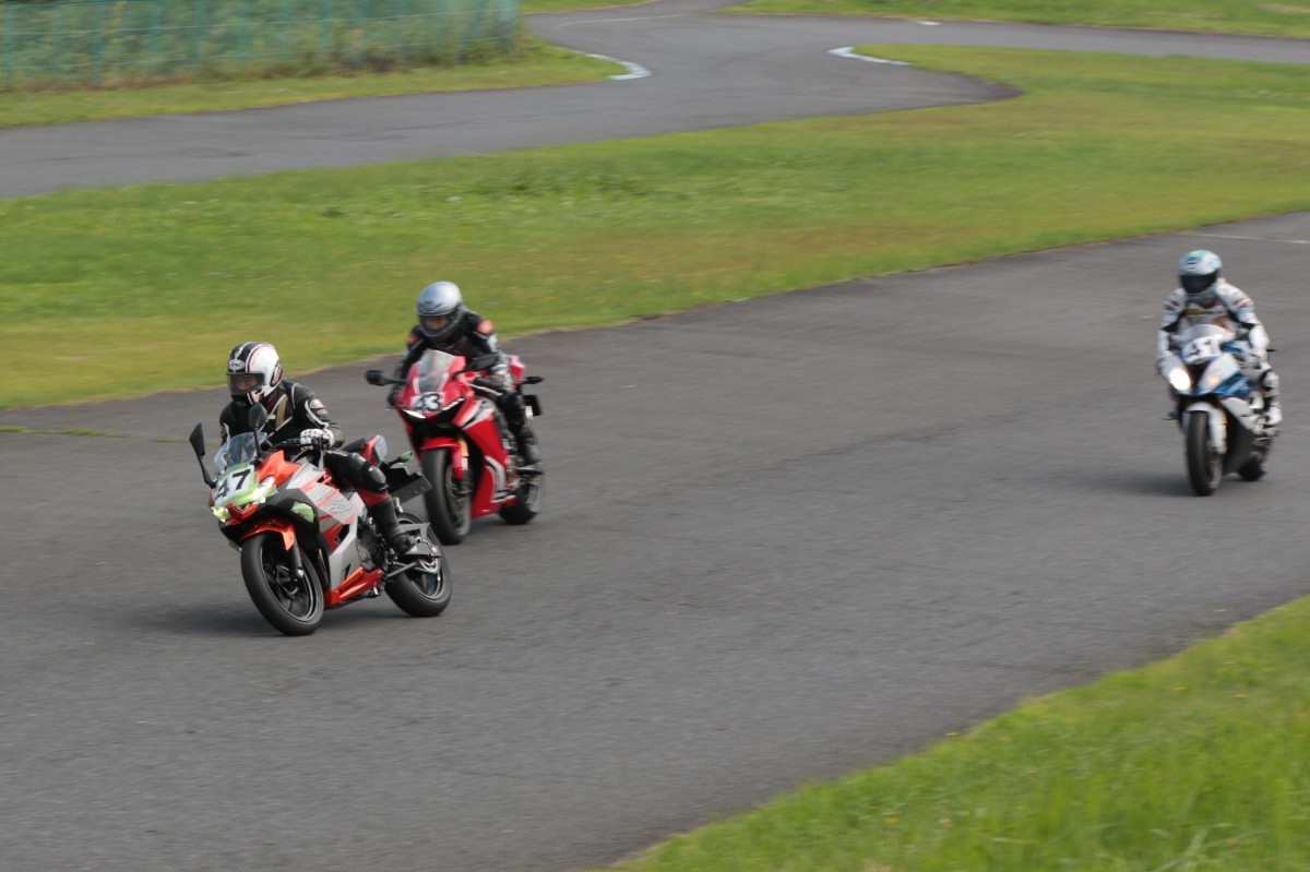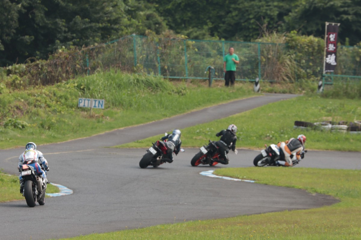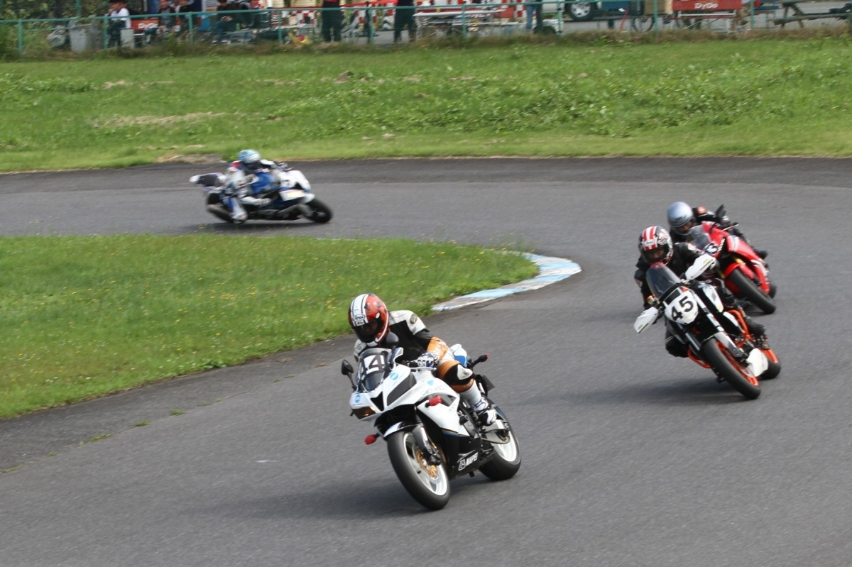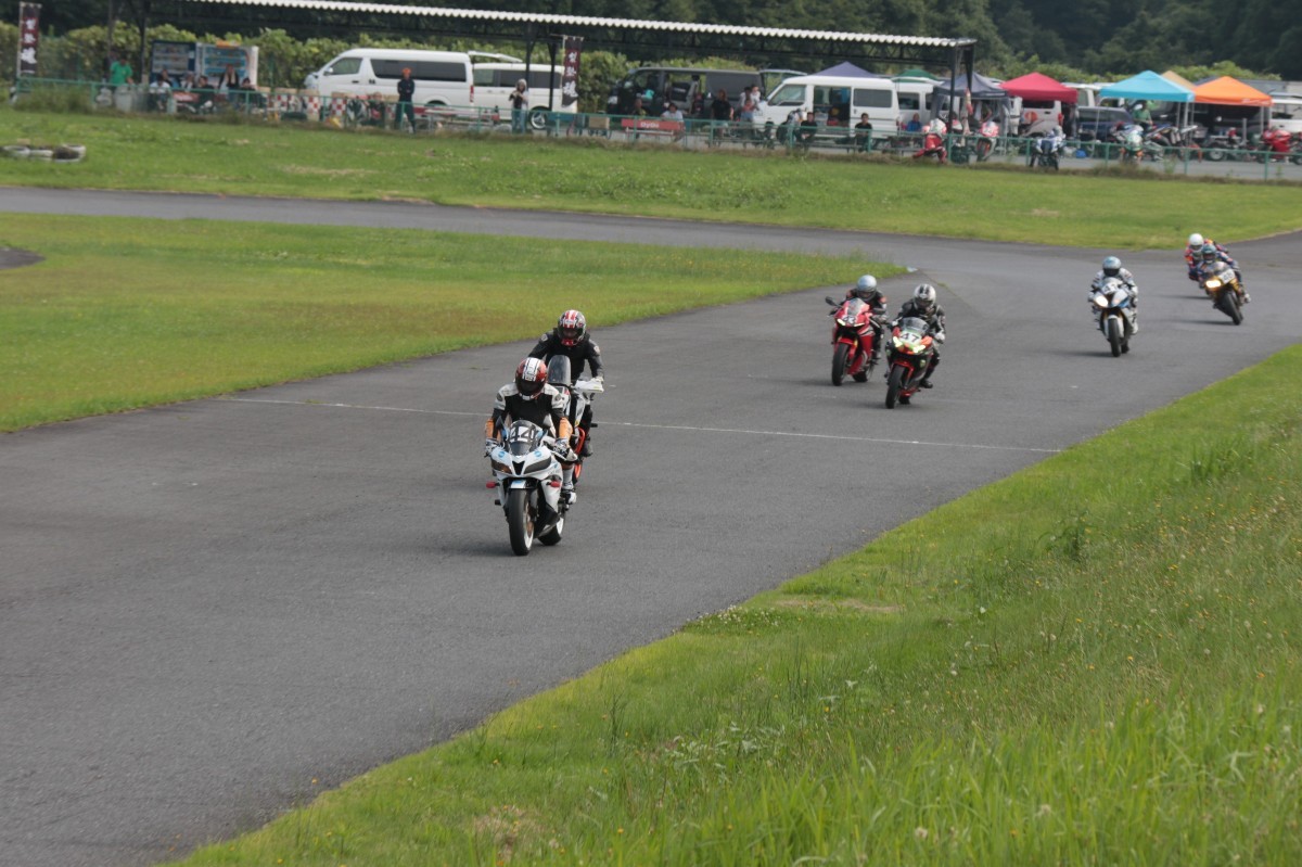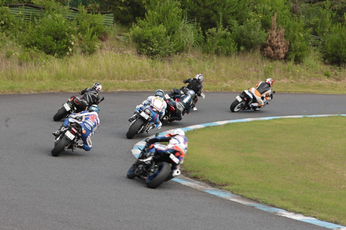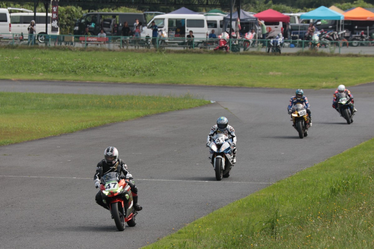 そのすぐ背後にはポールポジションからスタートとした#45坂平。更に今月からNinja400に乗り換えた嶋村、鈴木CBR1000RRと続く。