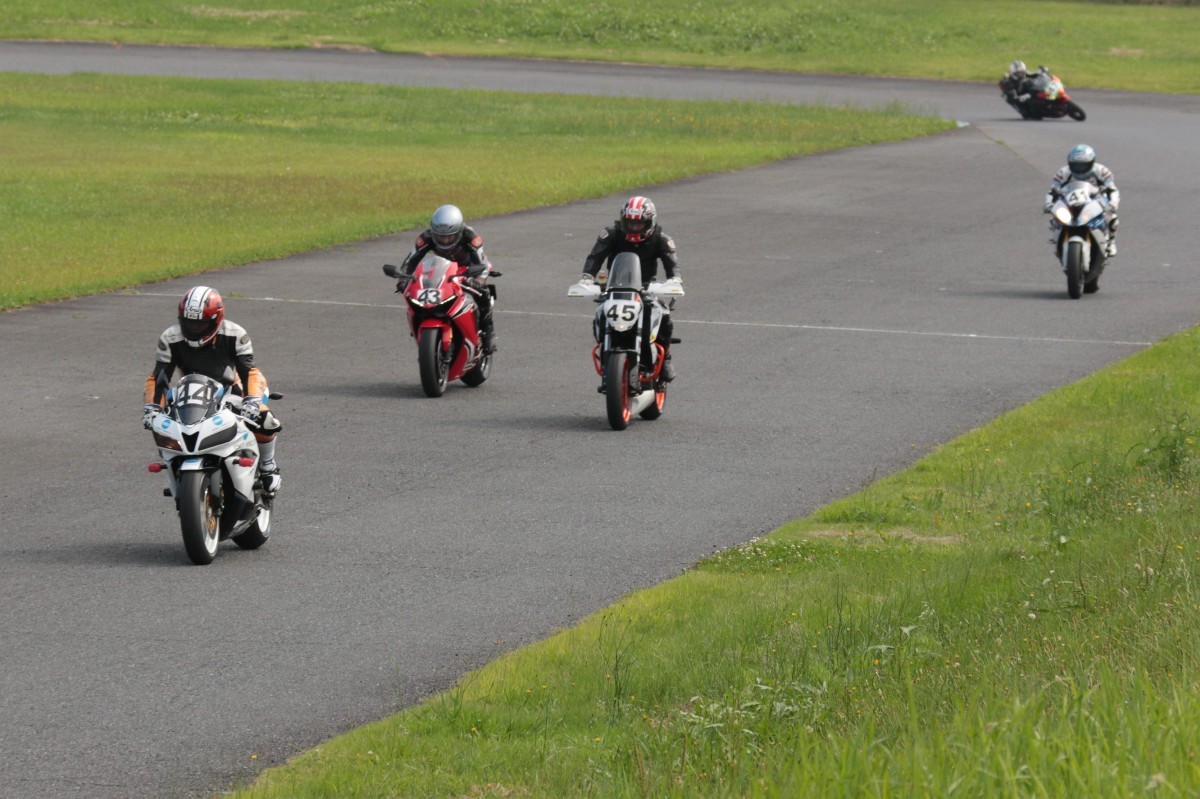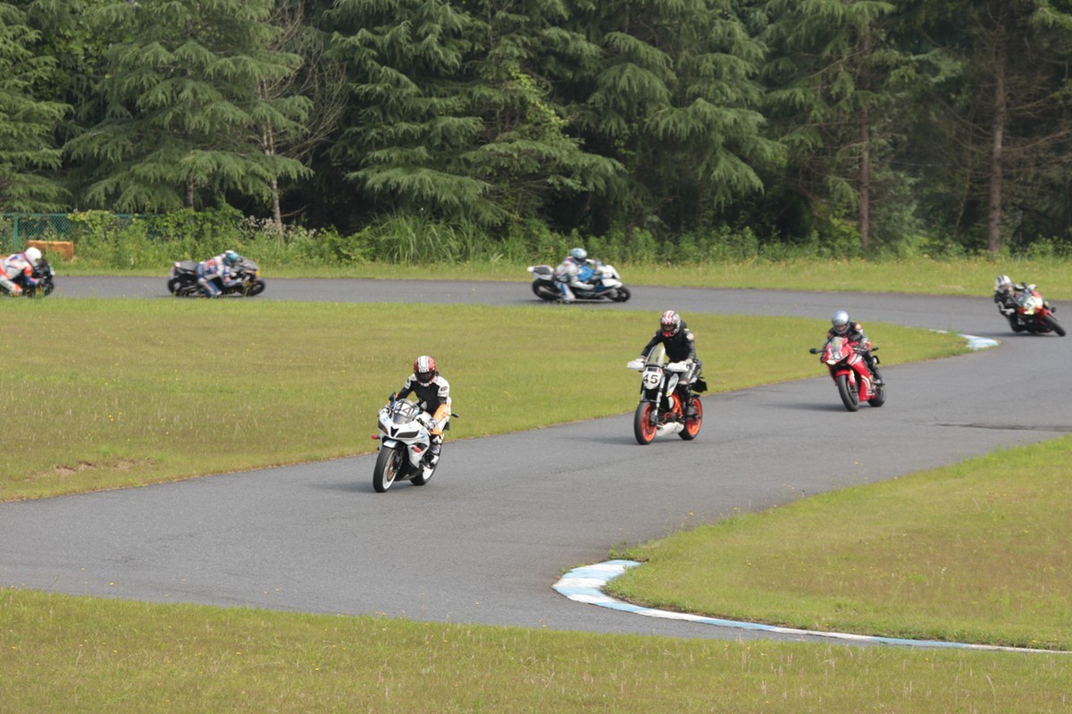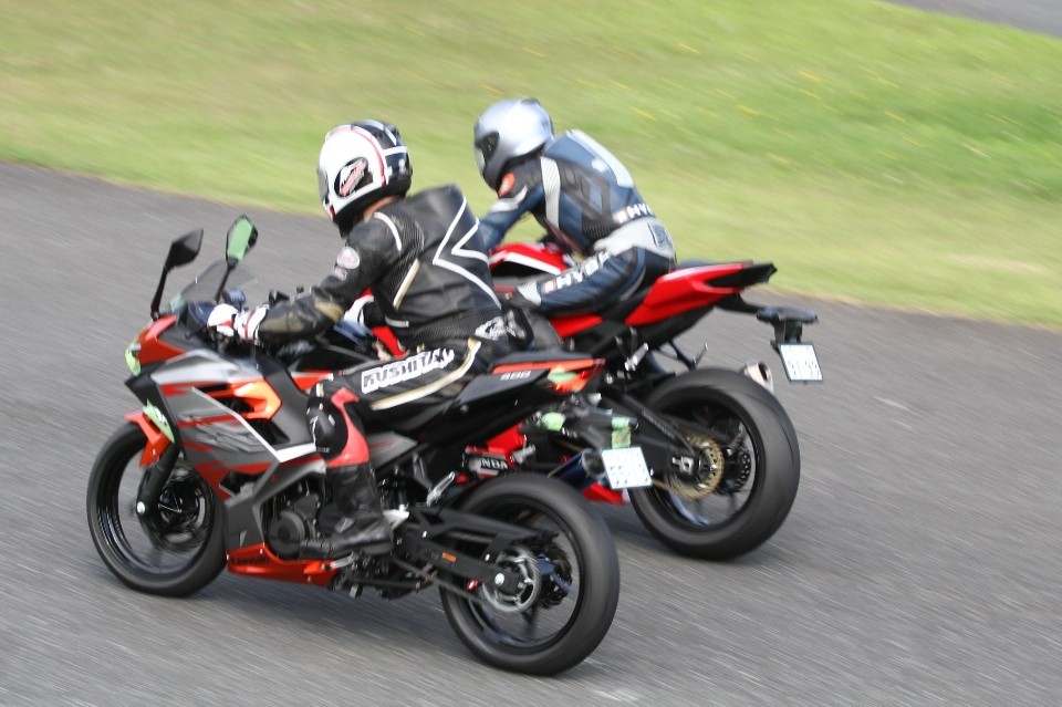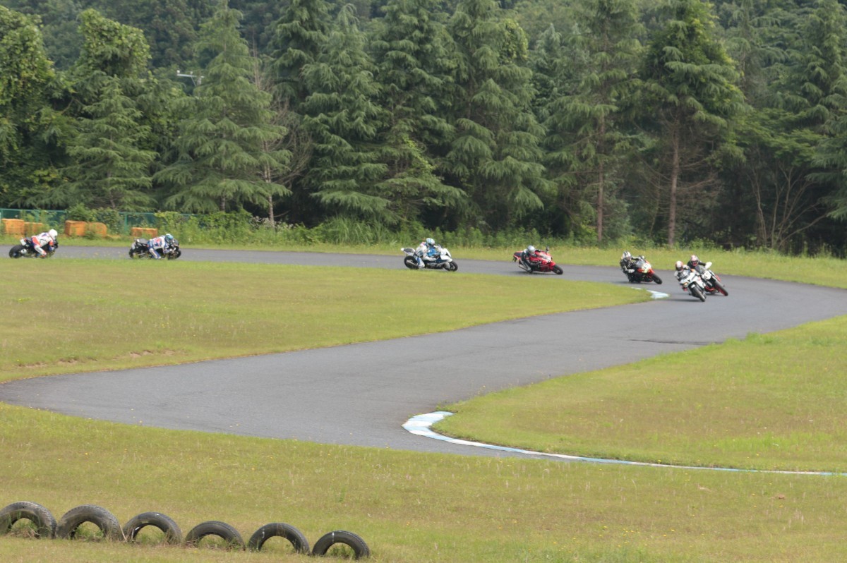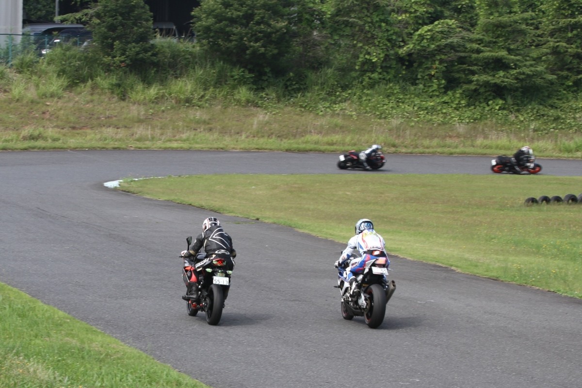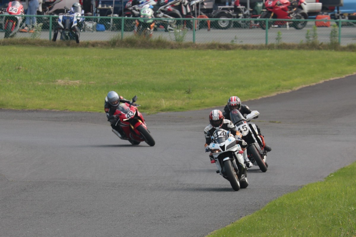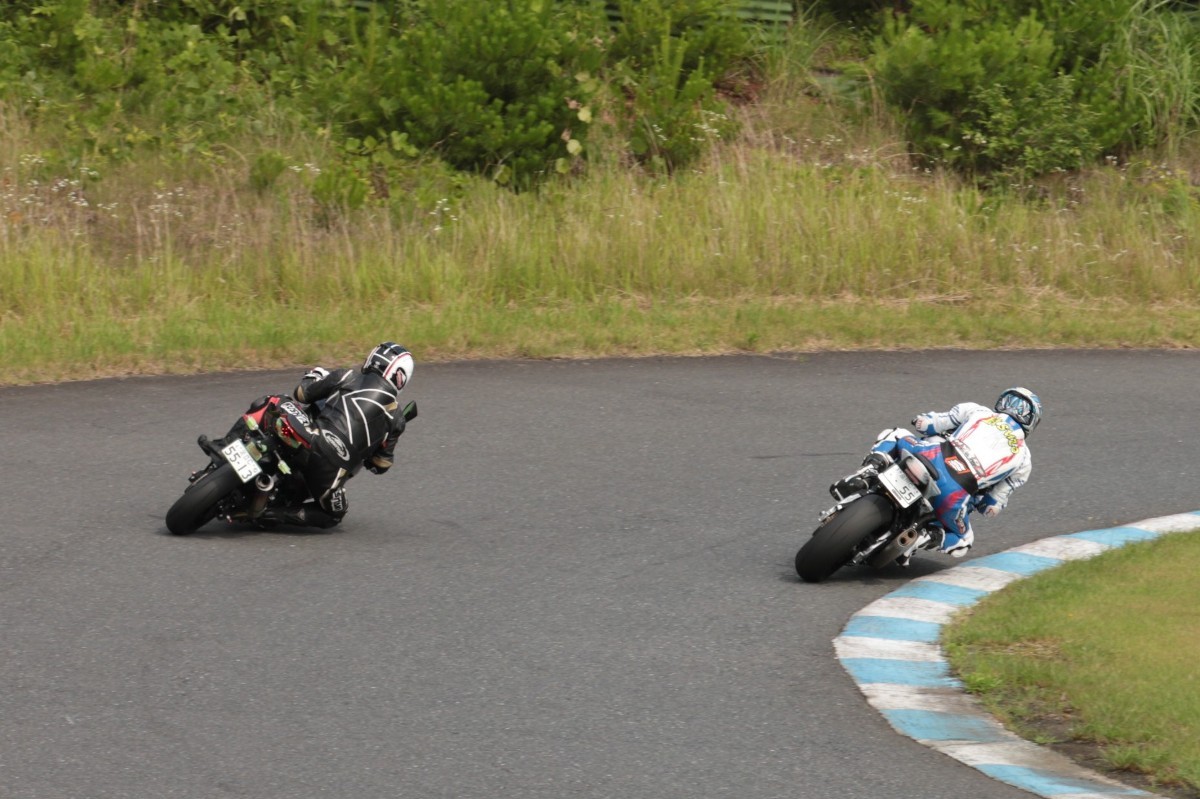 そのすぐ背後にはポールポジションからスタートとした#45坂平。更に今月からNinja400に乗り換えた嶋村、鈴木CBR1000RRと続く。
