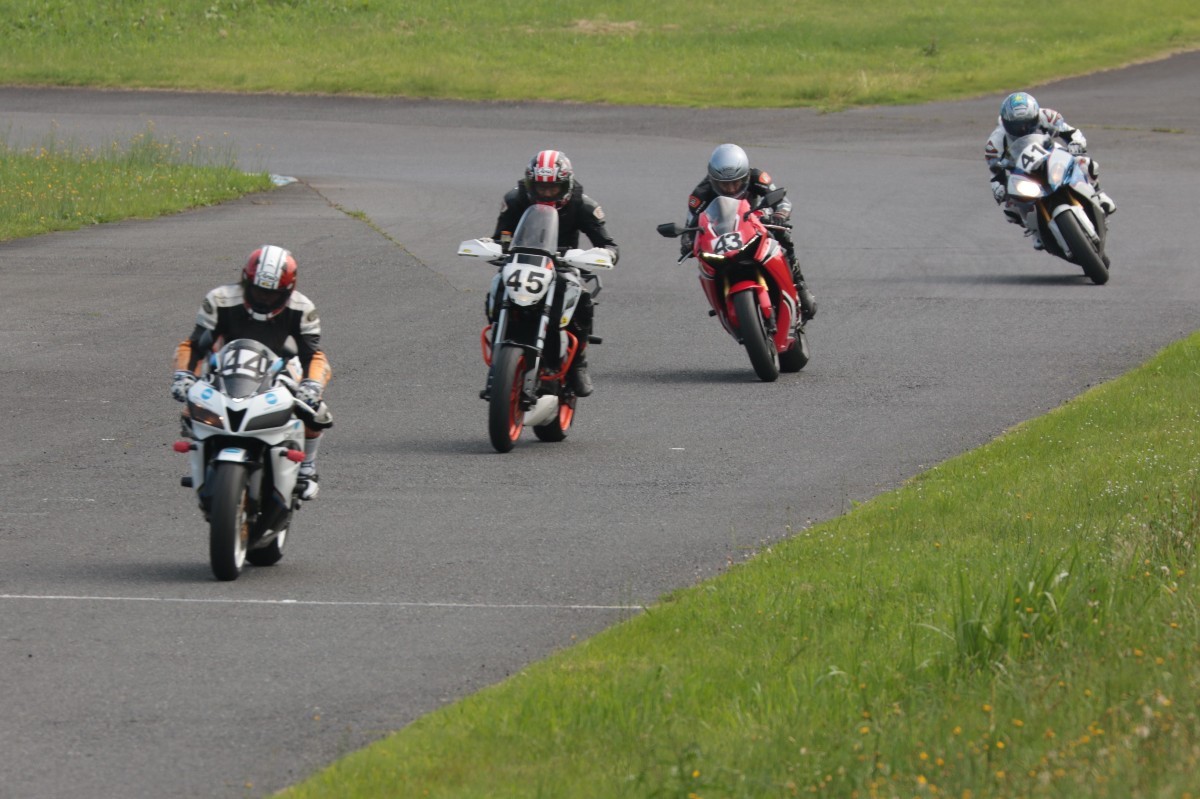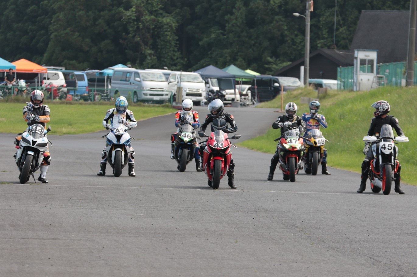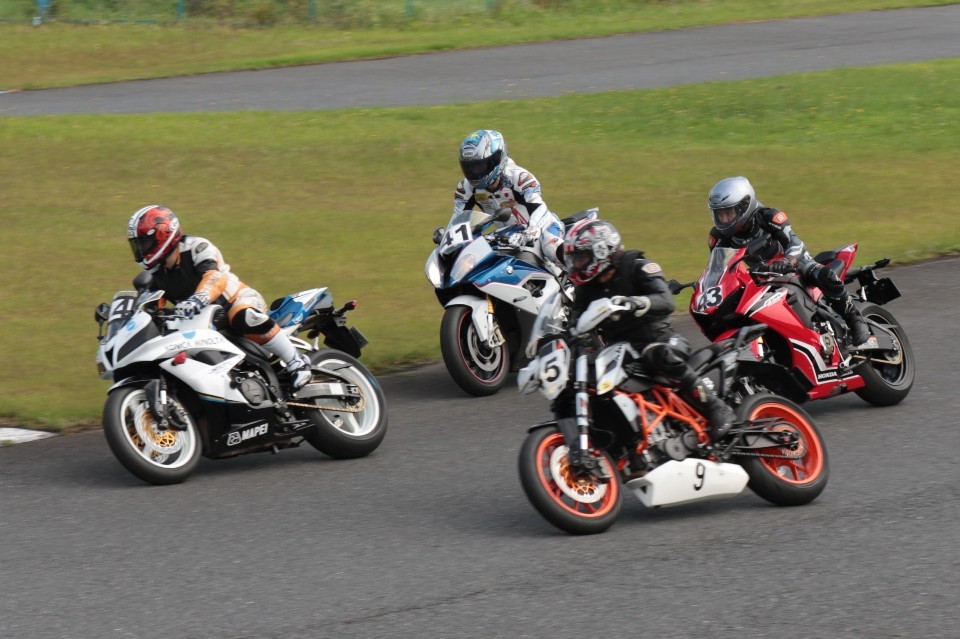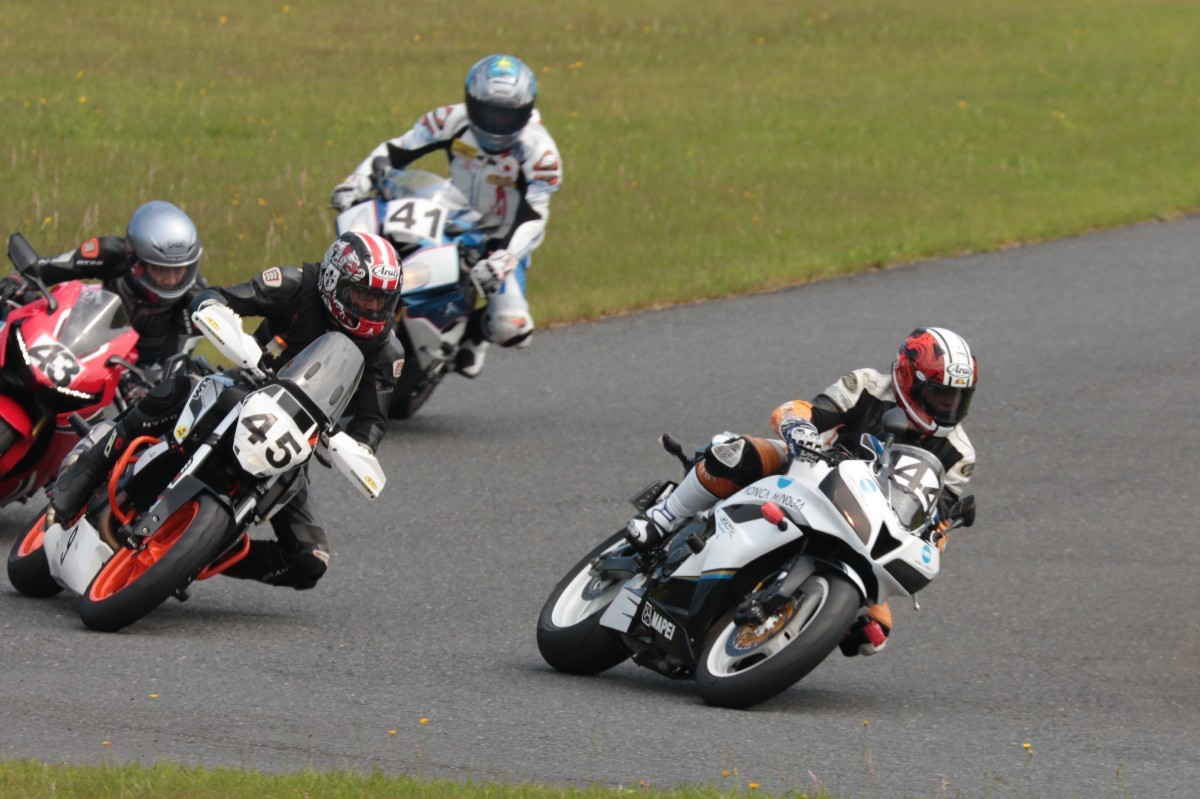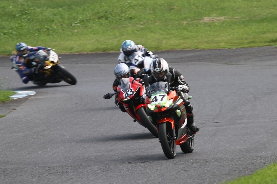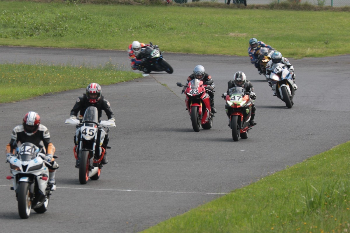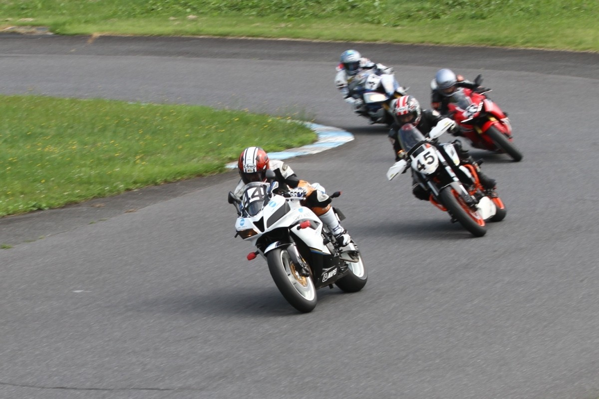 そのすぐ背後にはポールポジションからスタートとした#45坂平。更に今月からNinja400に乗り換えた嶋村、鈴木CBR1000RRと続く。