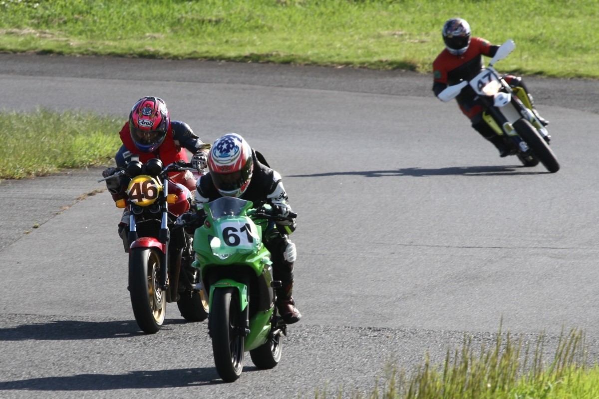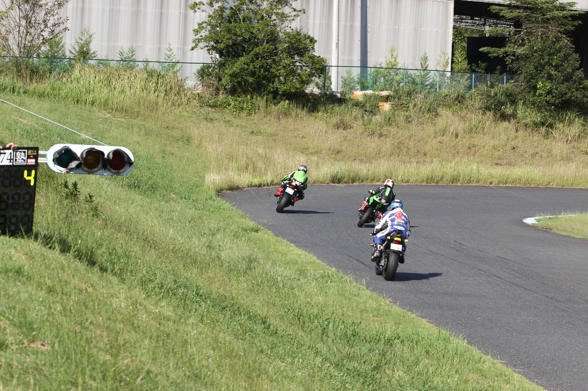 2番手に西村、3番手に皆藤CB400SF、4番手に喜多TZR250R、5番手に初参加の安田Ninja250SL、6番手に菅原701スーパーモト、7番手に斎藤S1000RR。ここから帝王コーナーまでの間に………