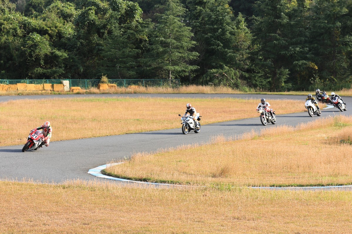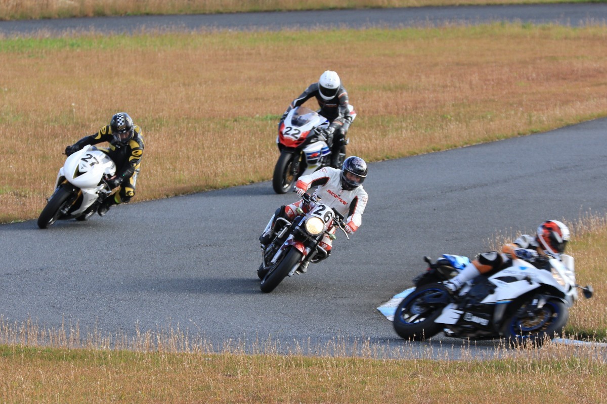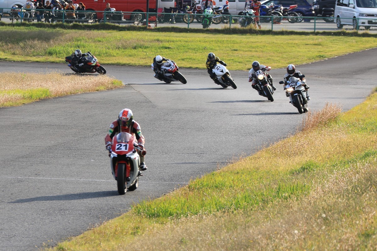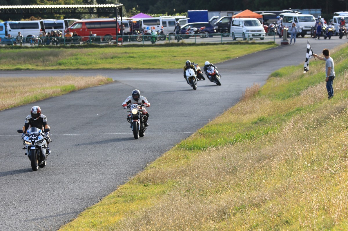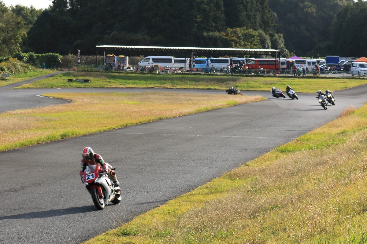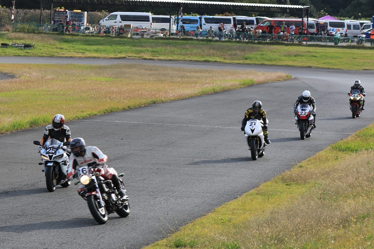そのままホールショットを奪う。2番手には高坂SV650、3番手には二列目からジャンプアップした富永CBR600RR、4番手に川畑デイトナ675R、5番手に田口GSXR1000、6番手に嶋村Ninja400と続く。