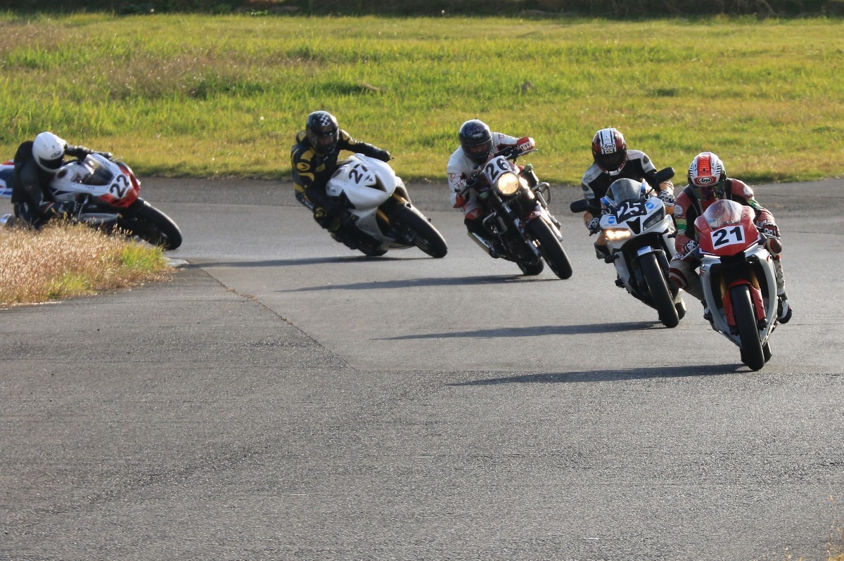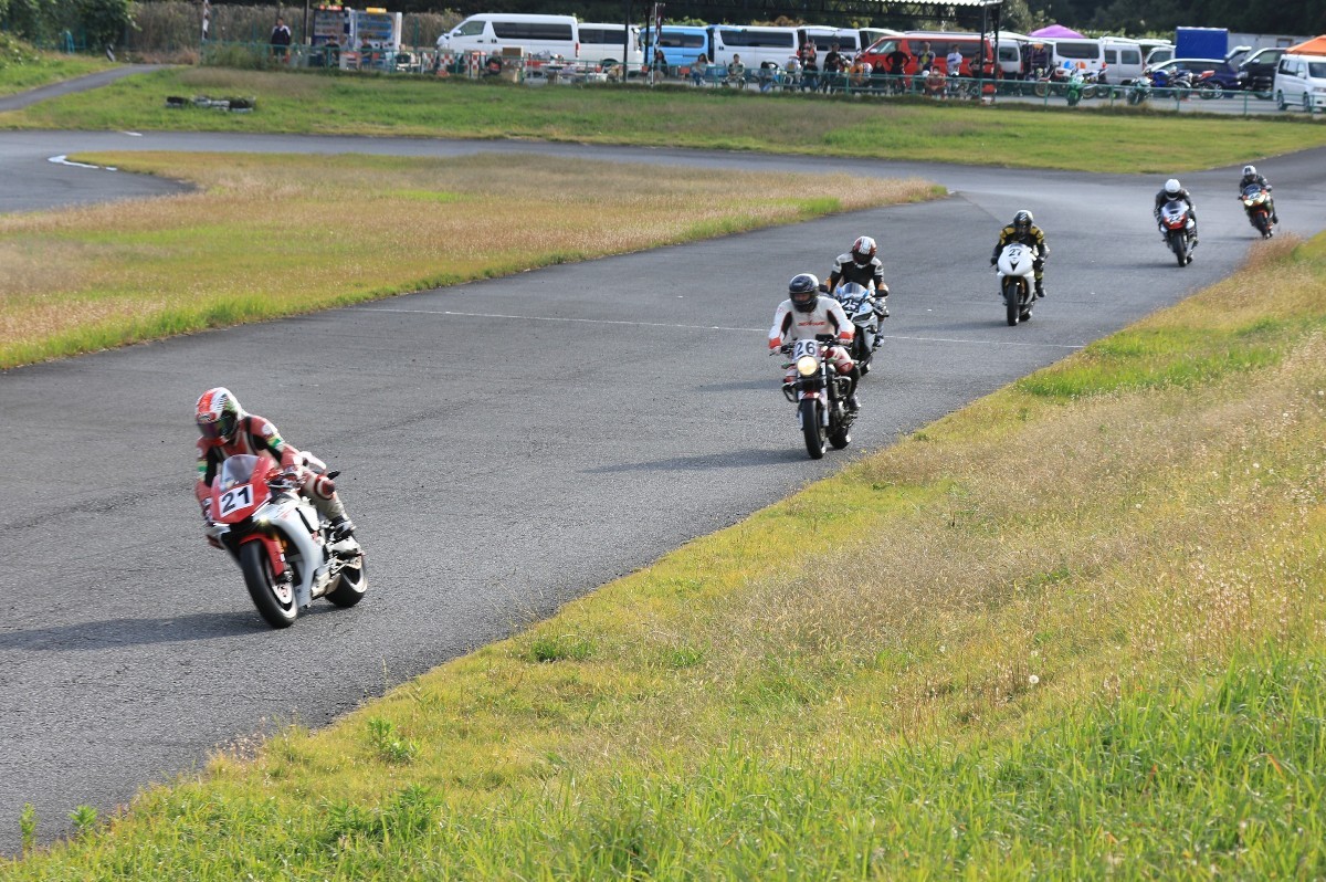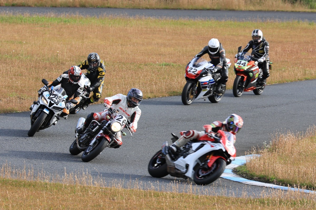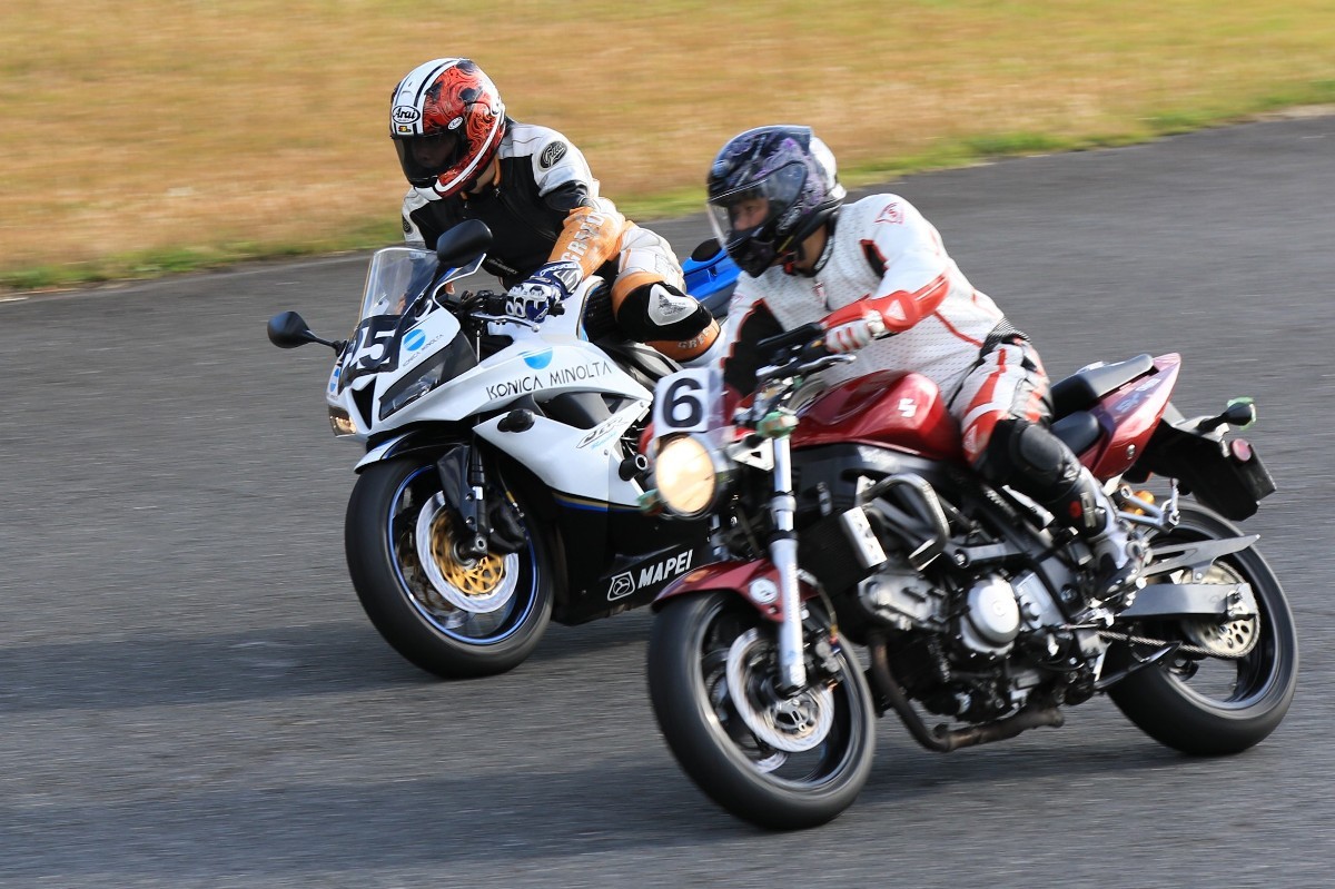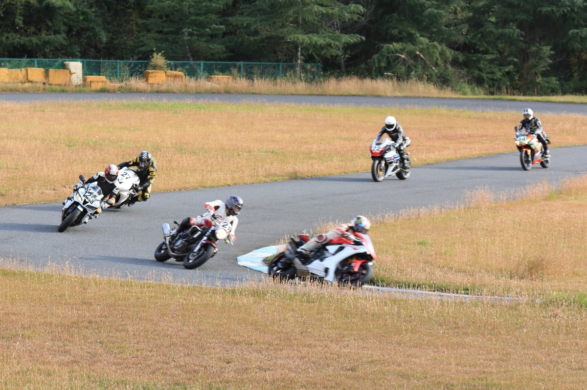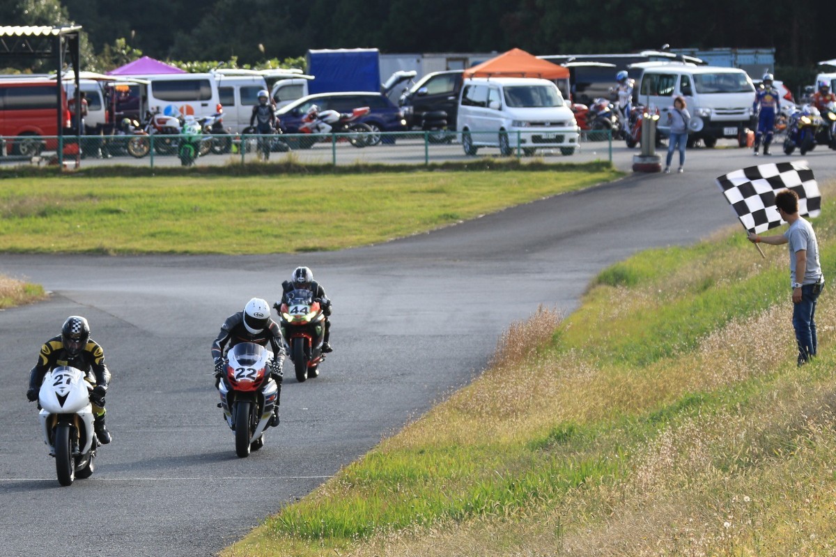 そのままホールショットを奪う。2番手には高坂SV650、3番手には二列目からジャンプアップした富永CBR600RR、4番手に川畑デイトナ675R、5番手に田口GSXR1000、6番手に嶋村Ninja400と続く。
