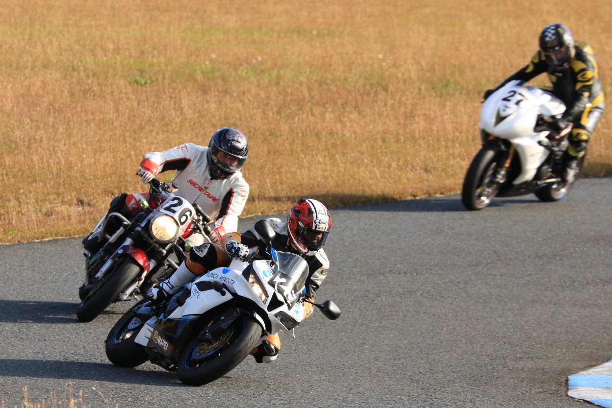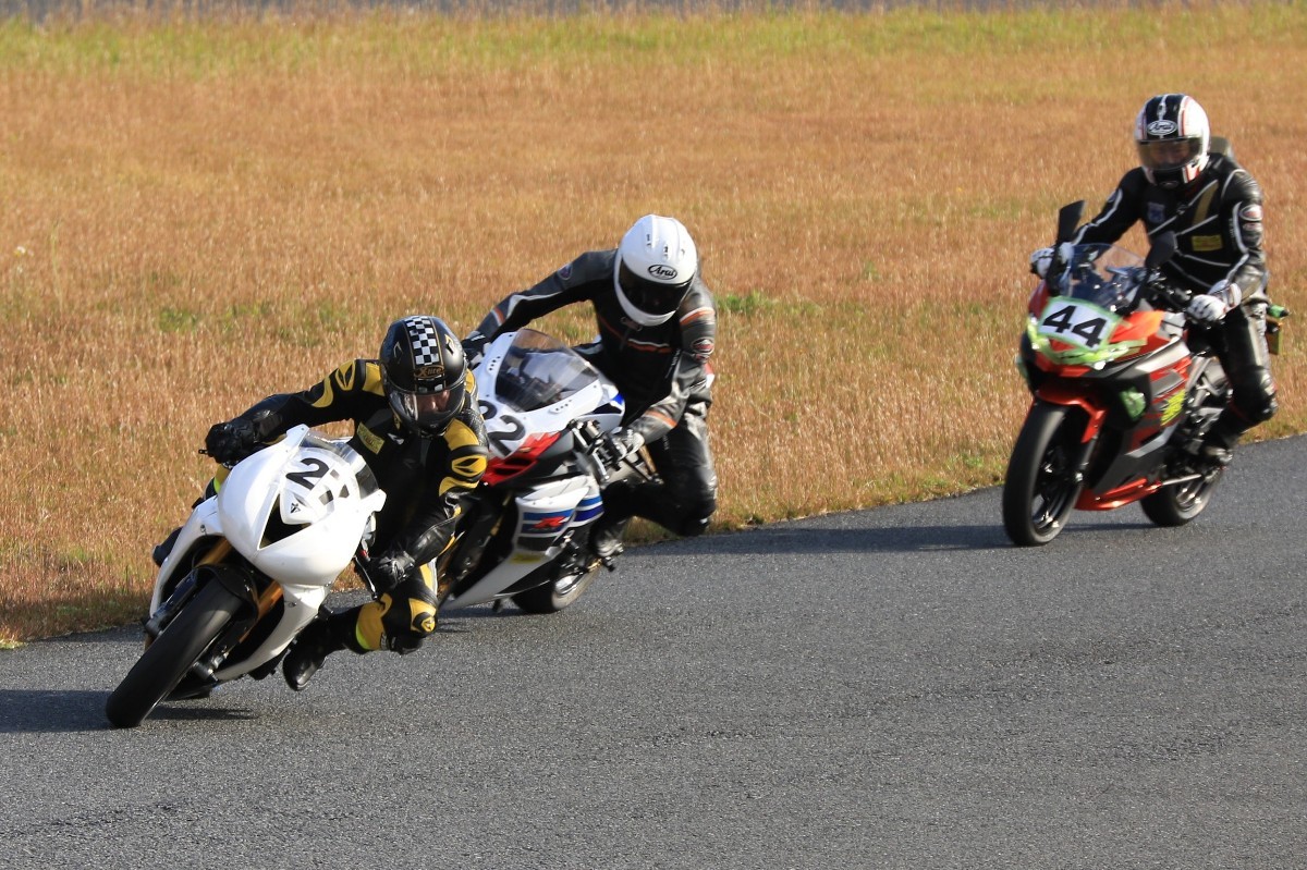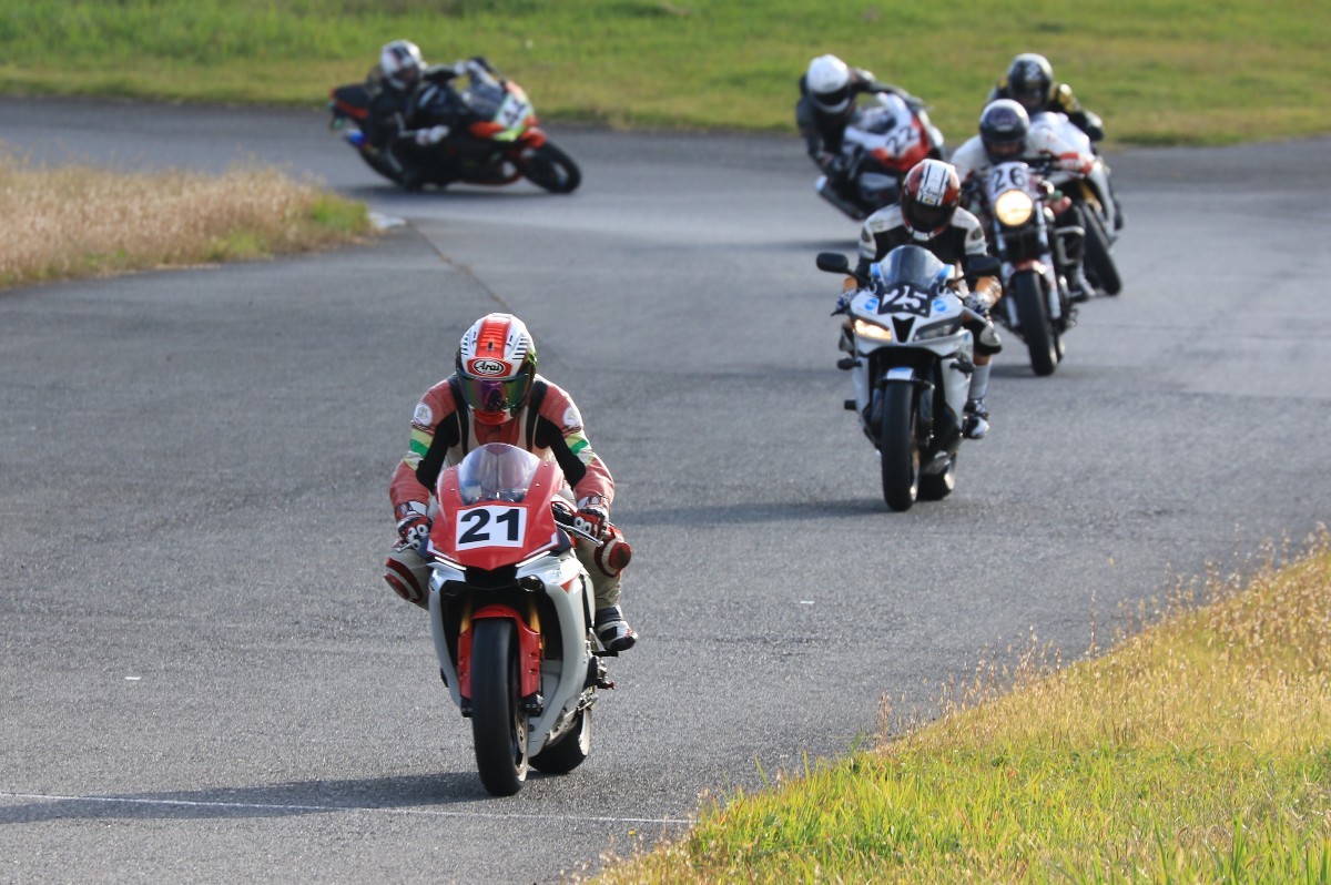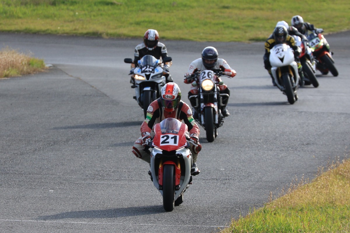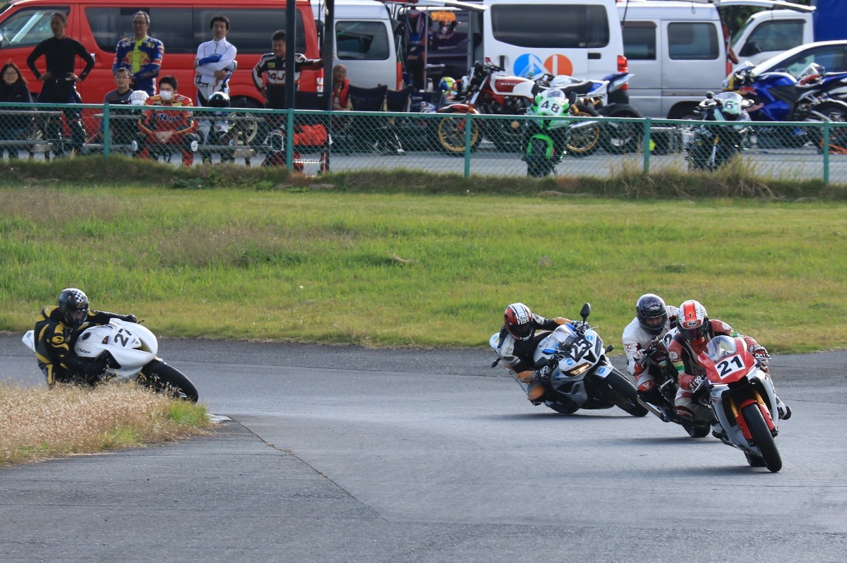 そのままホールショットを奪う。2番手には高坂SV650、3番手には二列目からジャンプアップした富永CBR600RR、4番手に川畑デイトナ675R、5番手に田口GSXR1000、6番手に嶋村Ninja400と続く。
