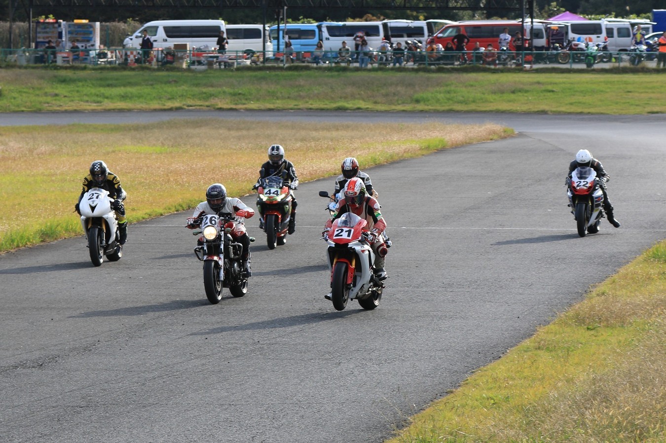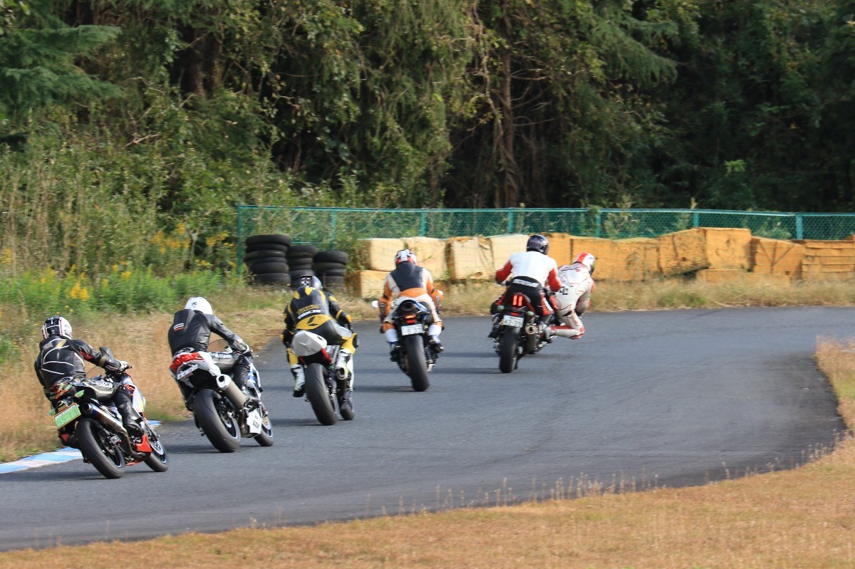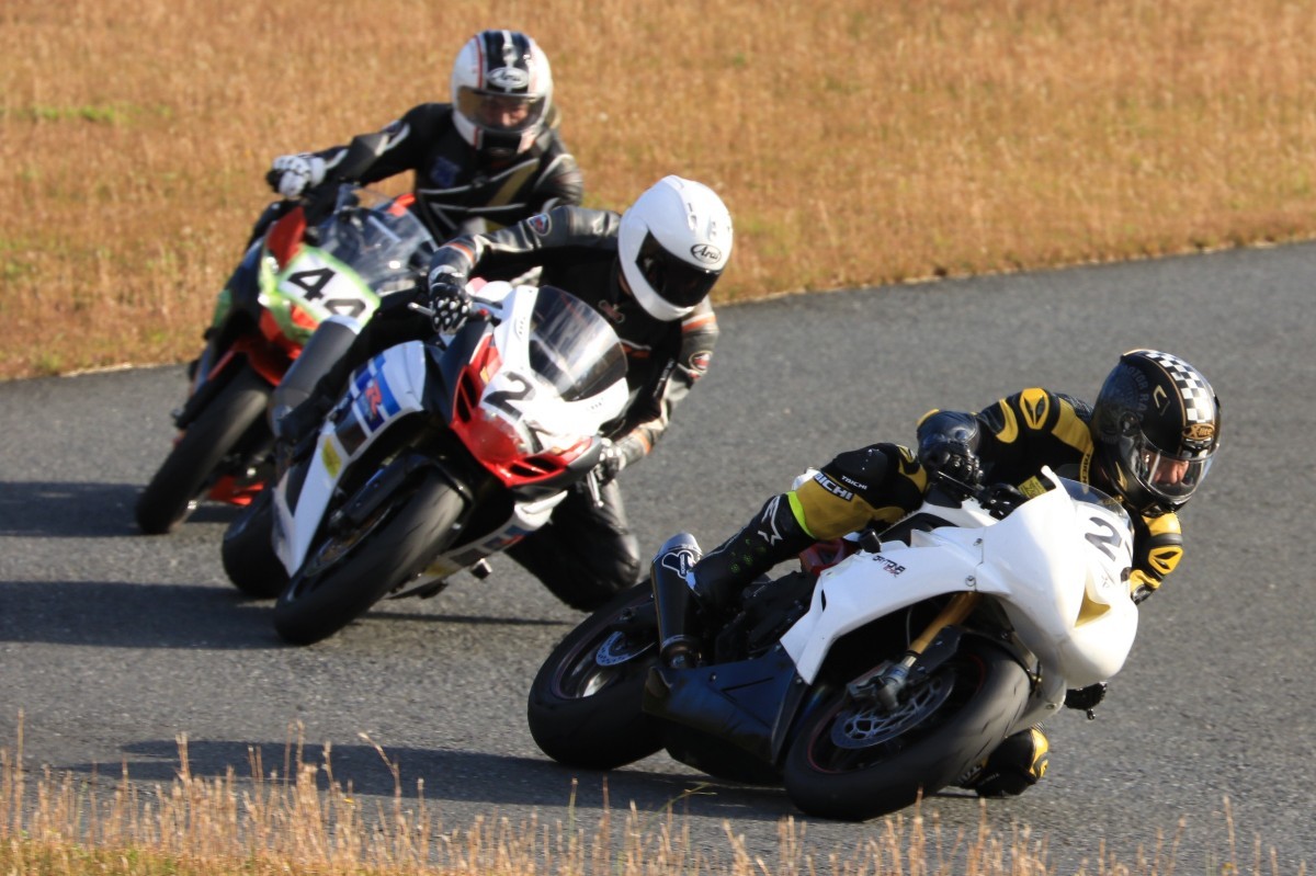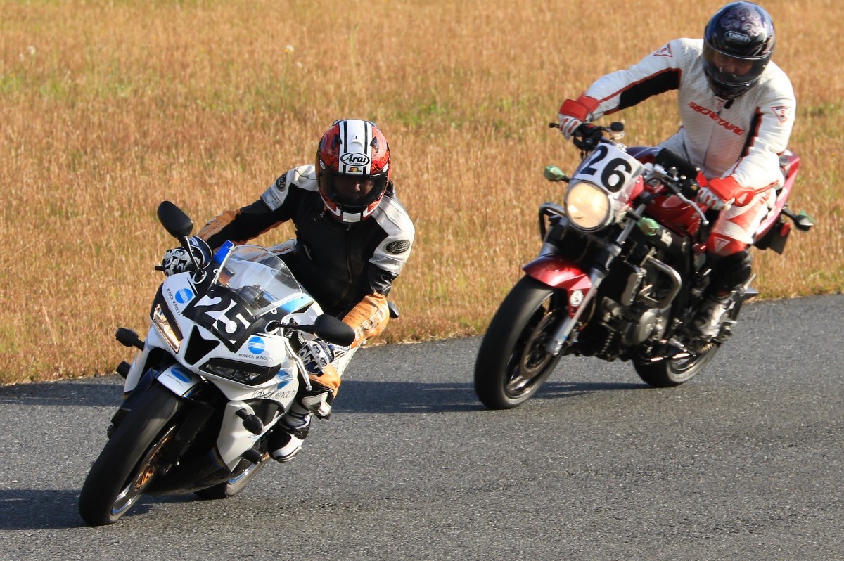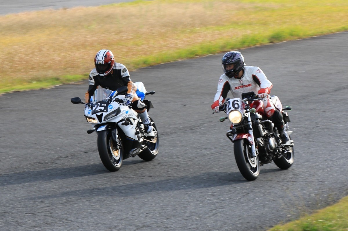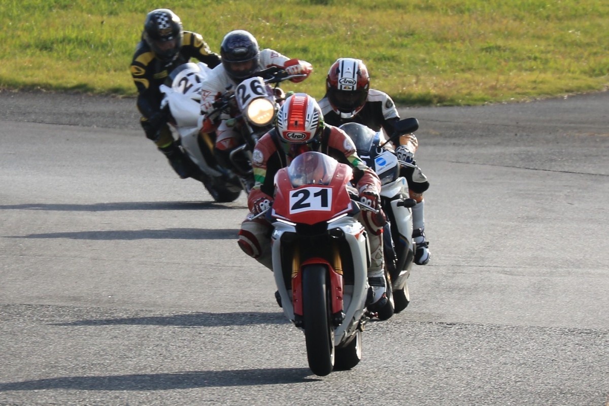 そのままホールショットを奪う。2番手には高坂SV650、3番手には二列目からジャンプアップした富永CBR600RR、4番手に川畑デイトナ675R、5番手に田口GSXR1000、6番手に嶋村Ninja400と続く。