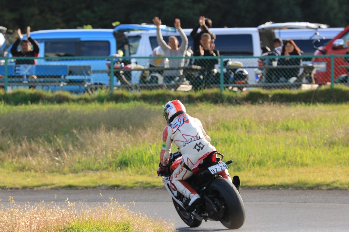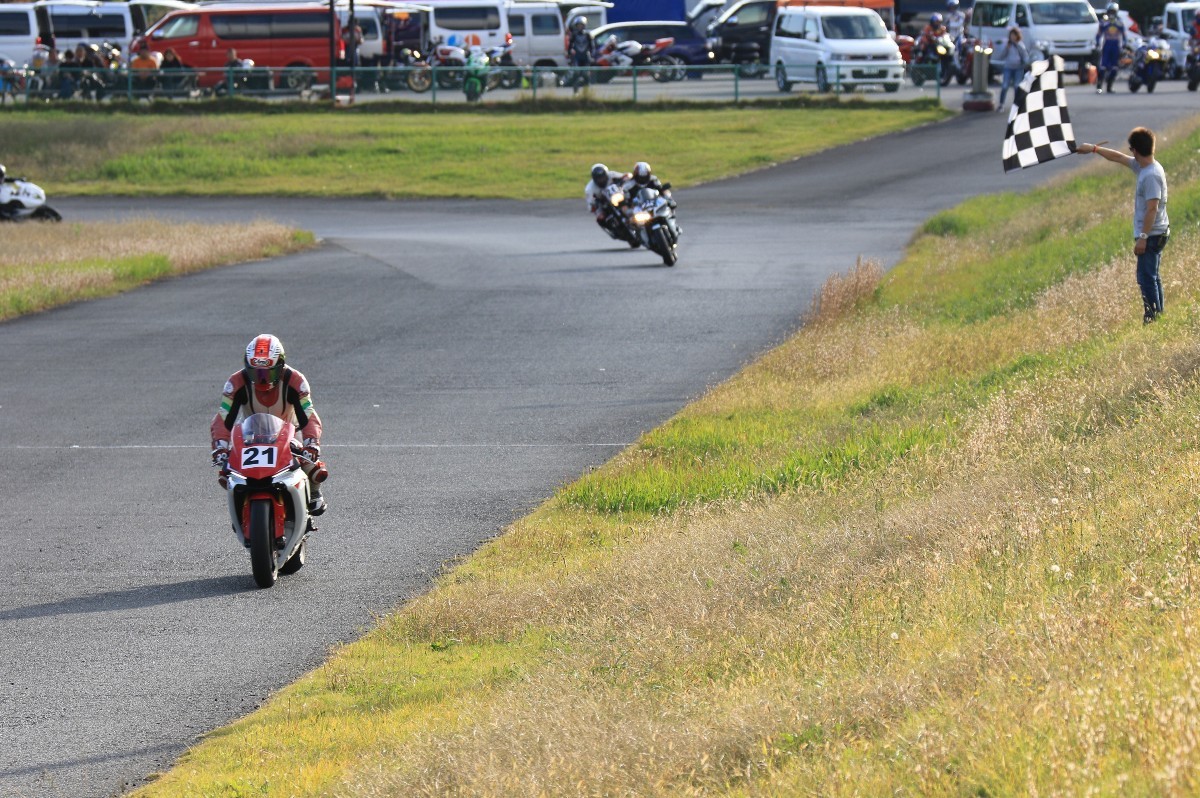 チェッカーへ。一位は磯山………
