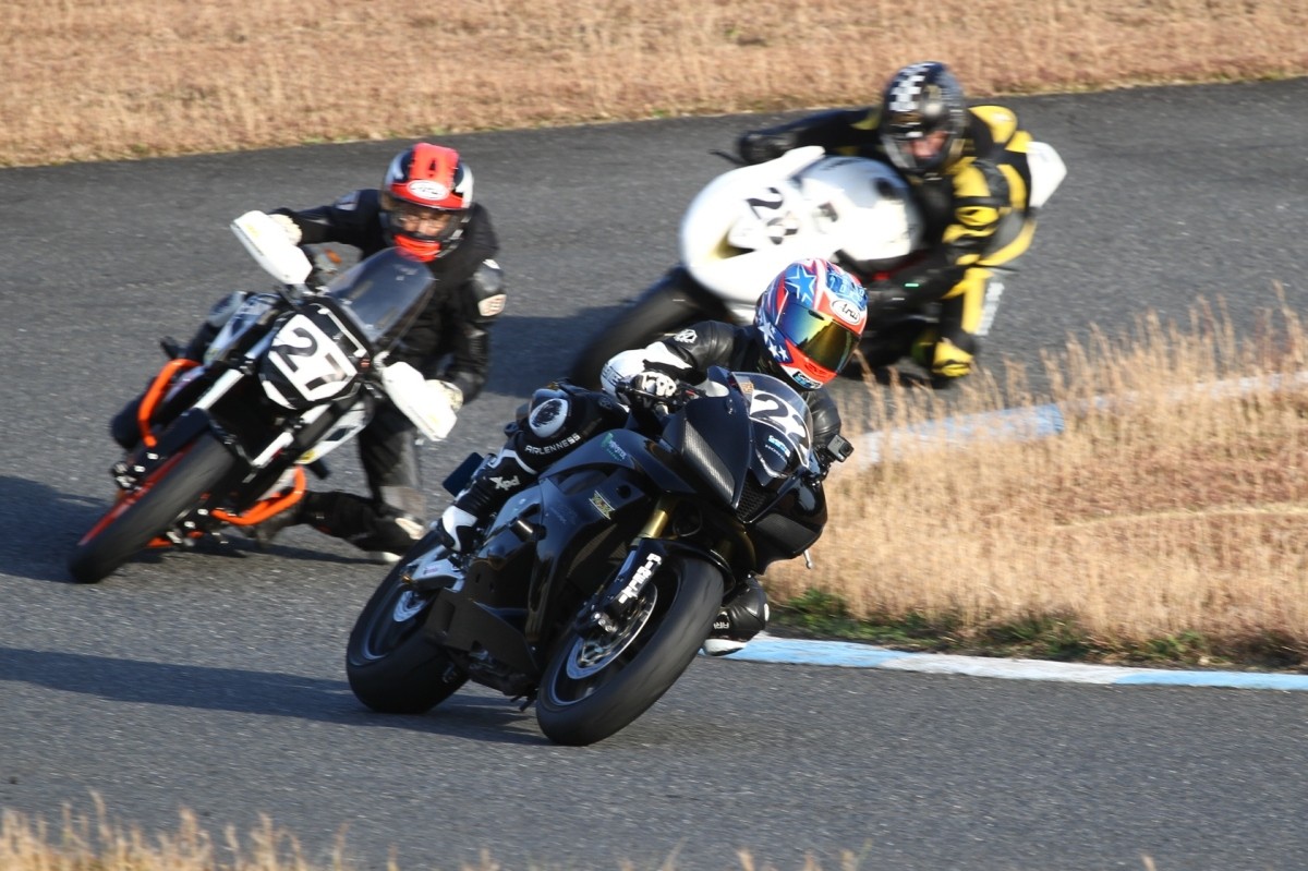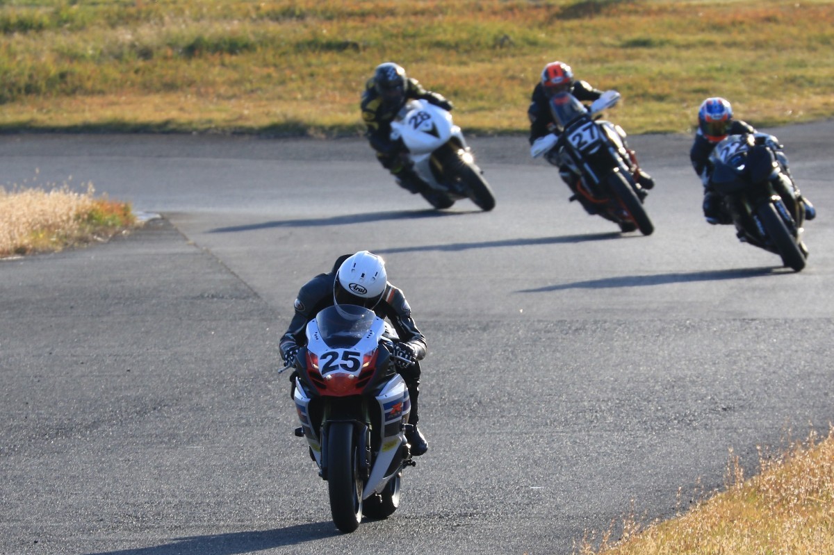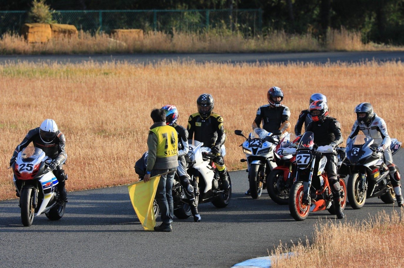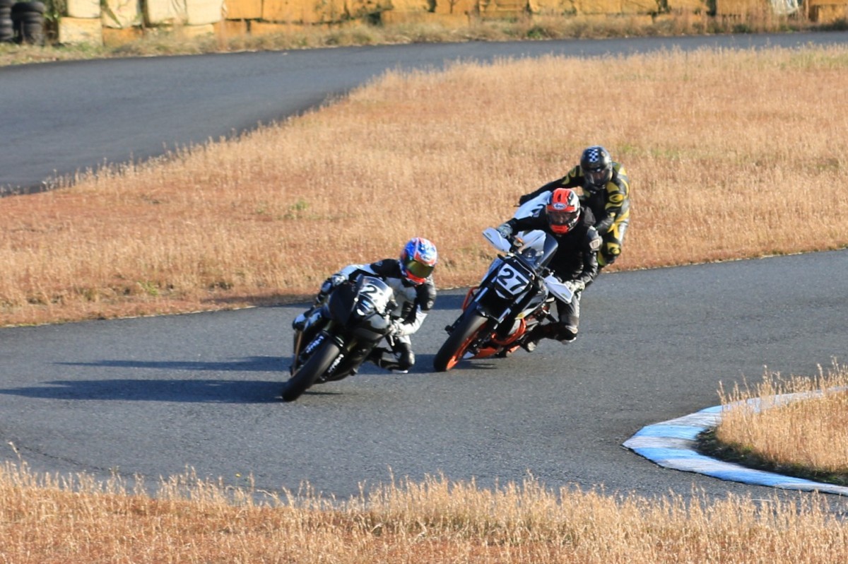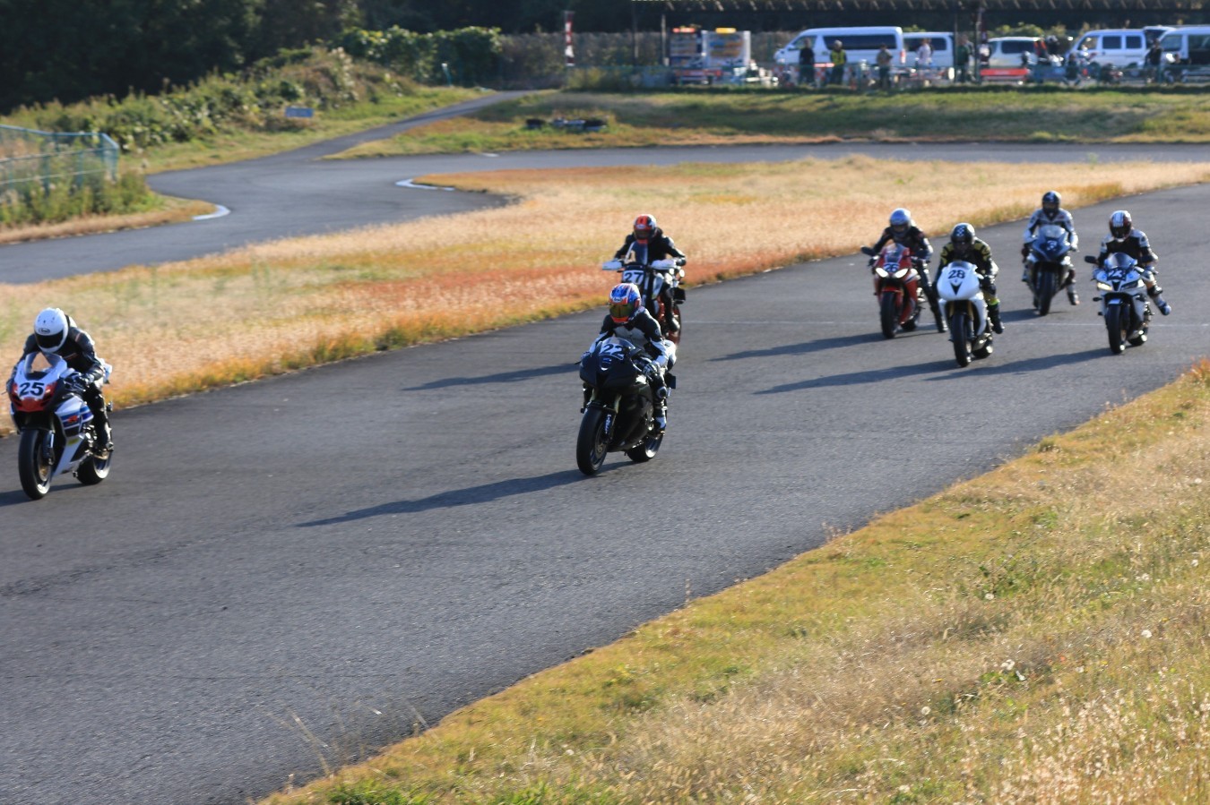 ホールショットを奪ったのは3番手から出た田口GSXR1000。2番手には松貝CBR600RR、3番手に坂平690DUKE R、4番手に川畑デイトナ675R、5番手に富永CBR600RR、6番手に渡辺GSXR1000と続く。