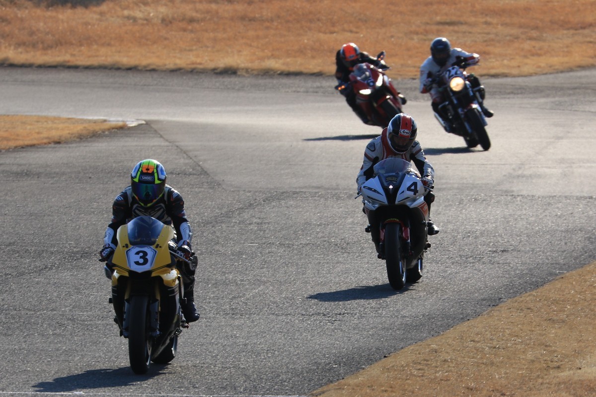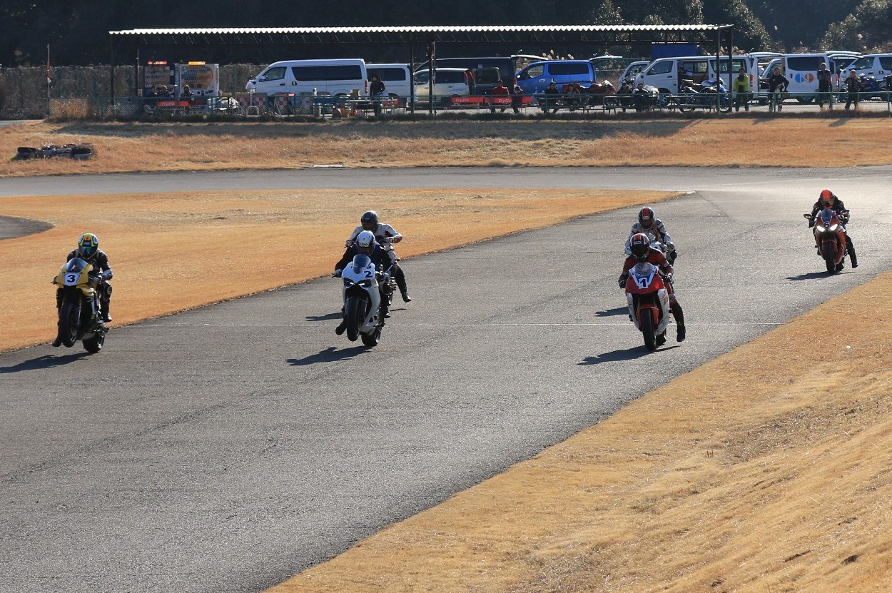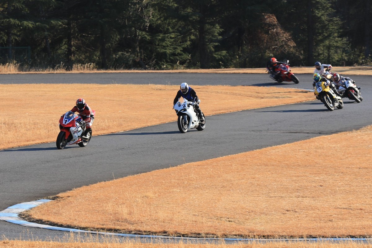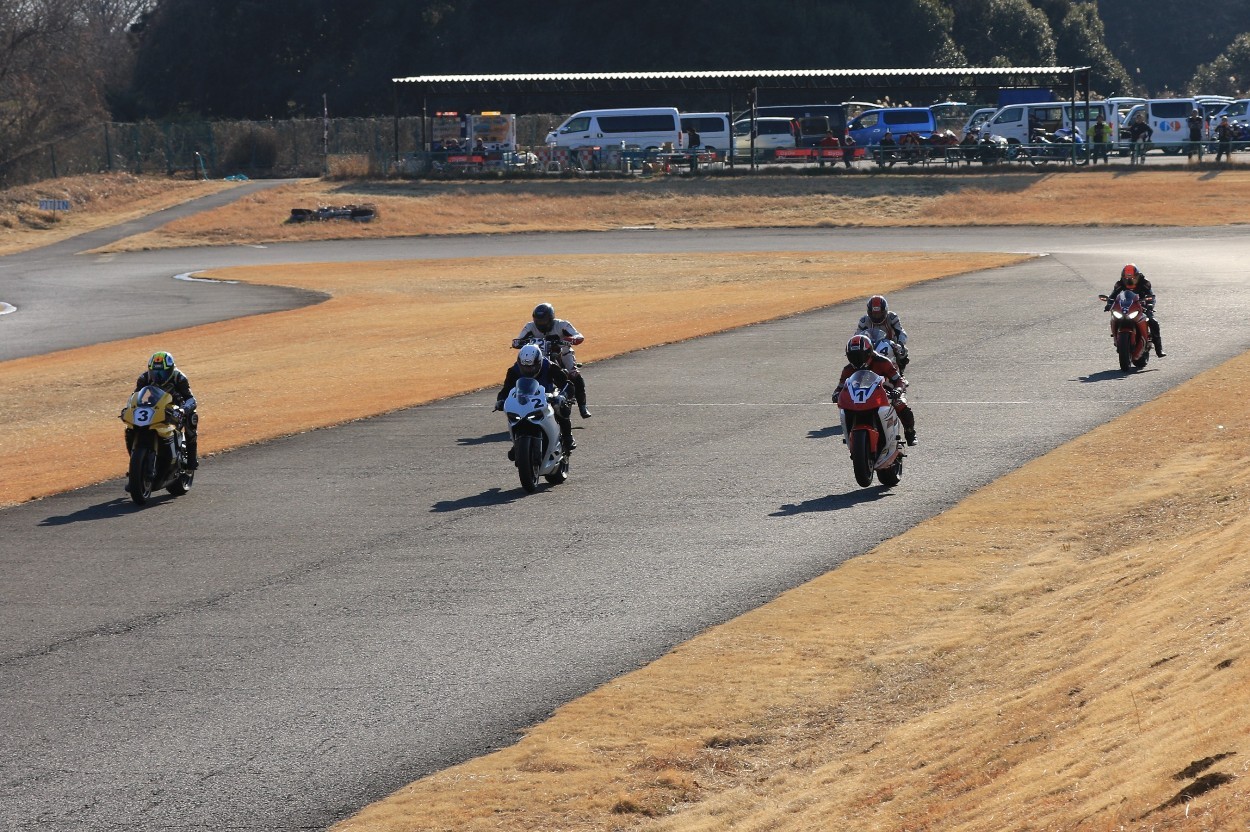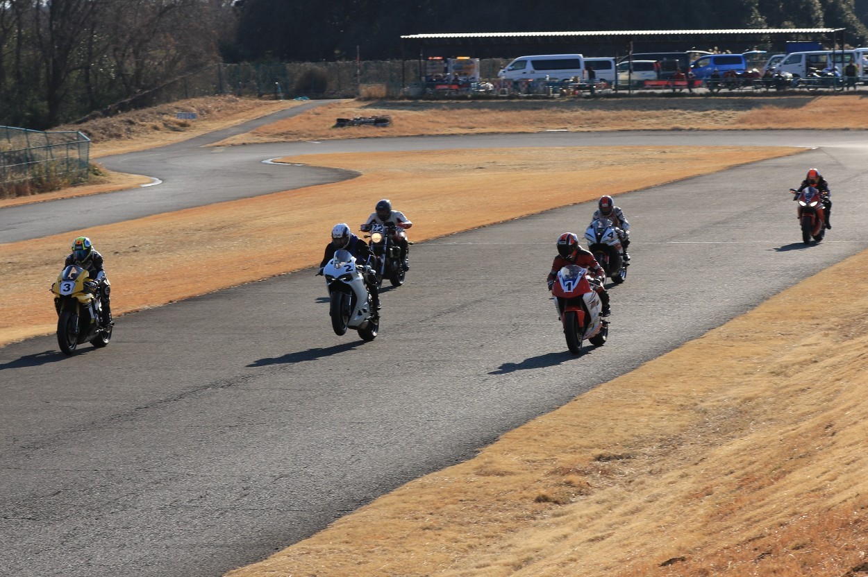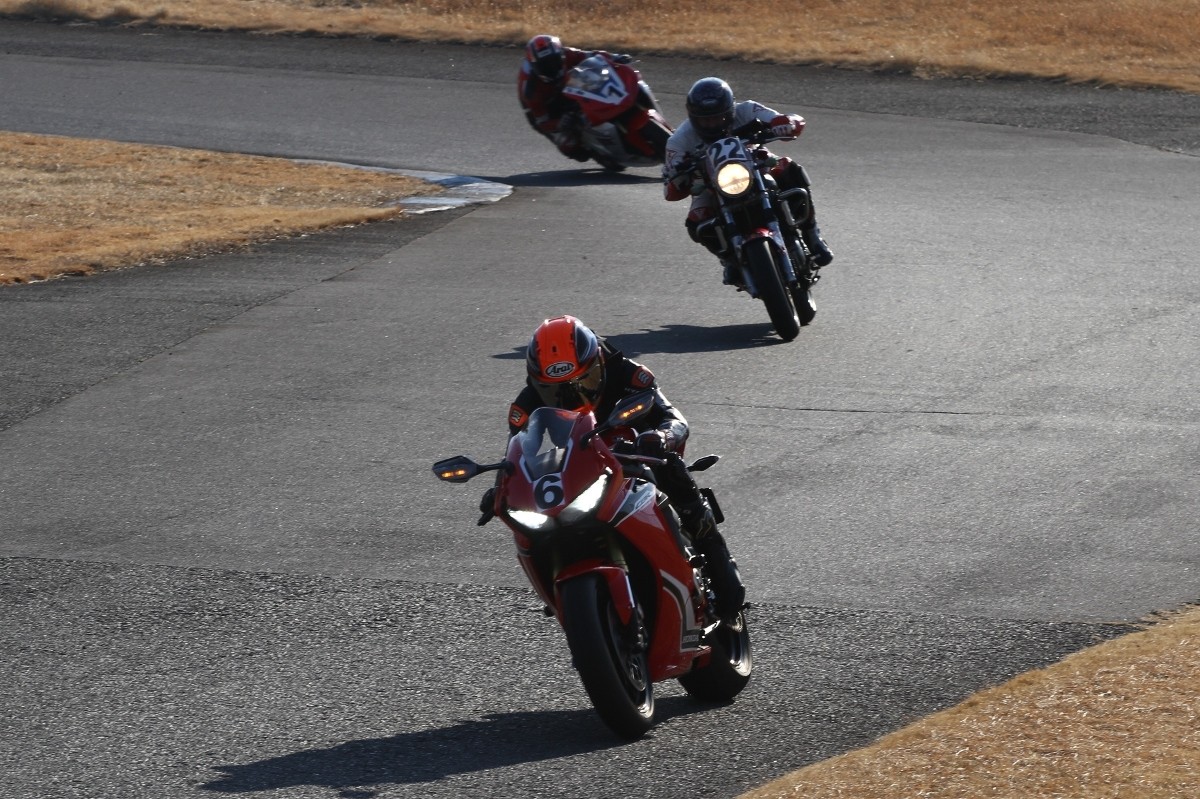 2番手に柴899パニガーレ、3番手に駒澤R1M、4番手に片岡R6、5番手に初めてのAクラス出走となった高坂SV650、6番手に鈴木CBR1000RRと続く。