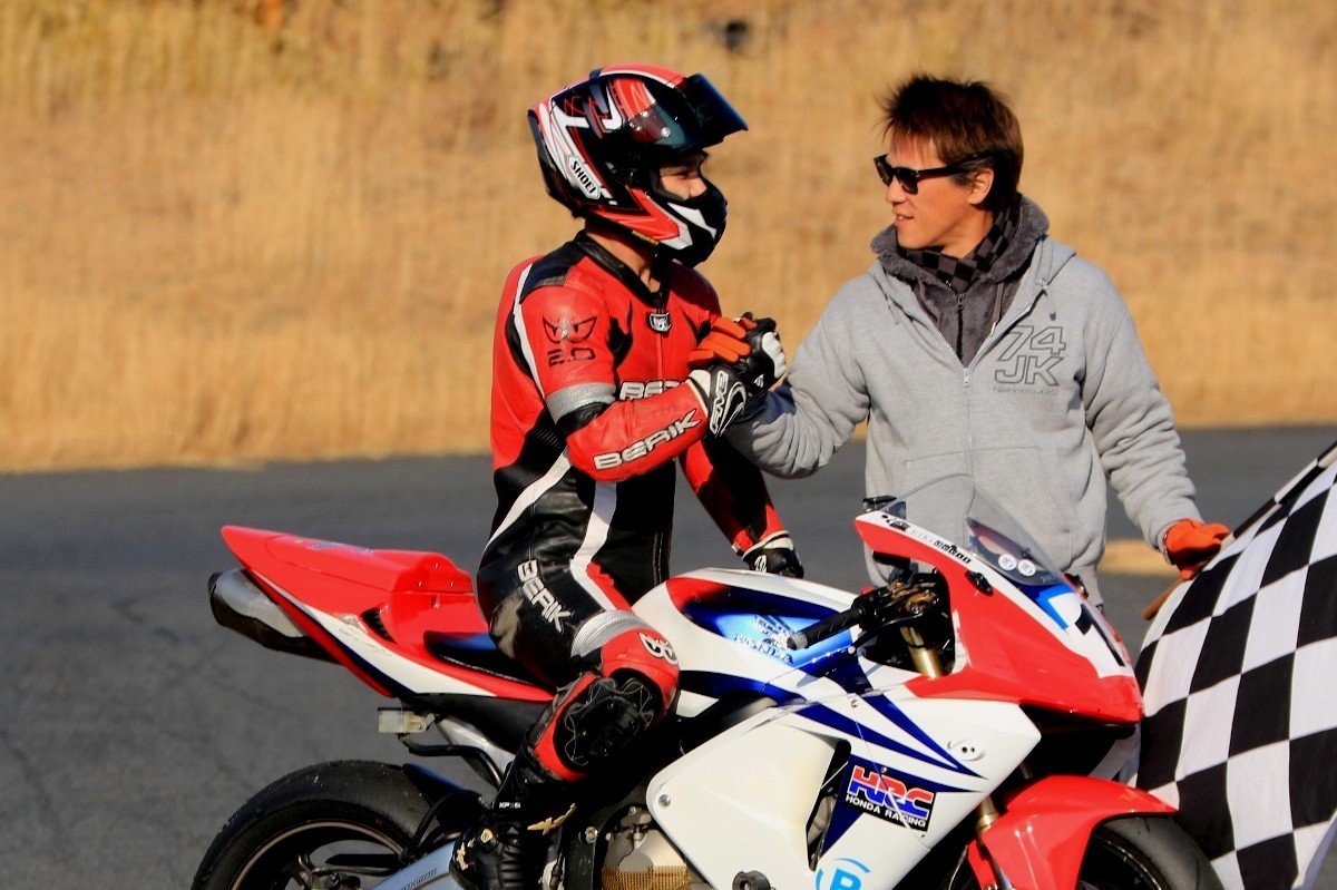 圧倒的な速さで勝利した川崎を他のライダーが祝福。