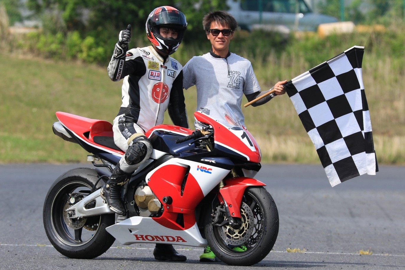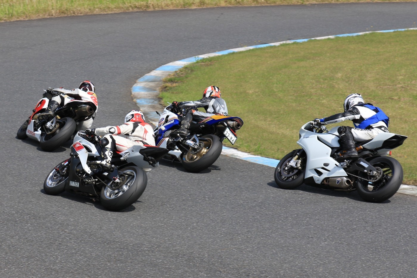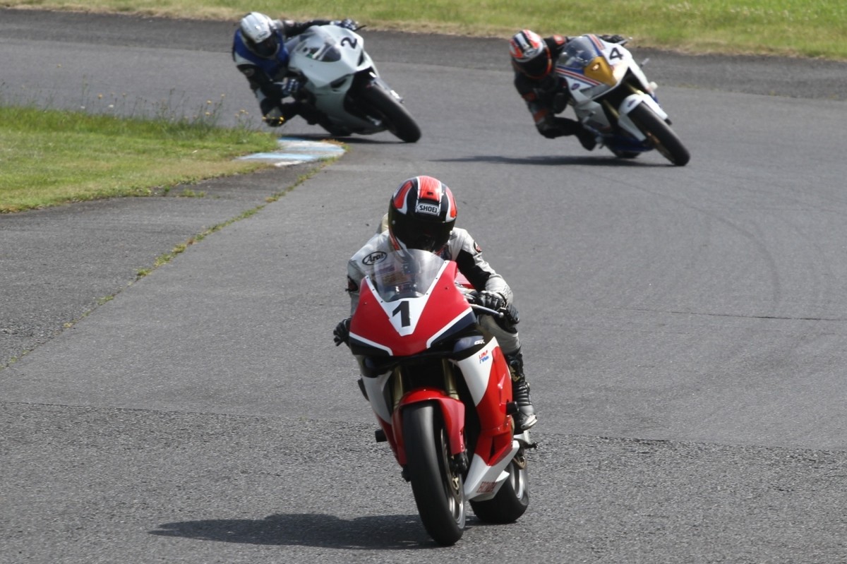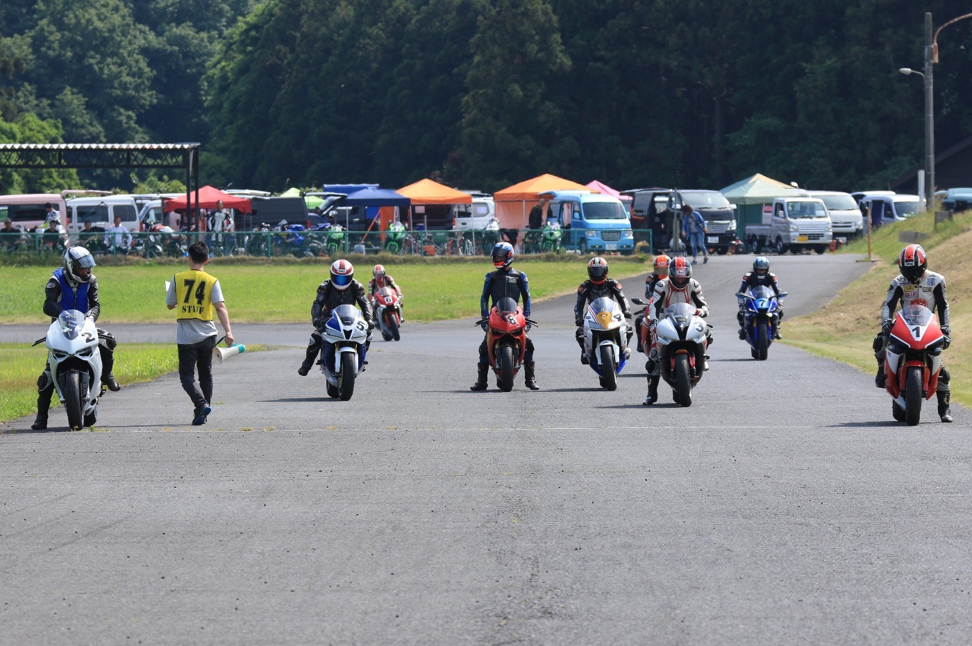 梨本塾の花形、K-RUN-GP Aクラスがグリッドに整列。フロントローには二台のPC37、CBR600RRと、899パニガーレ。