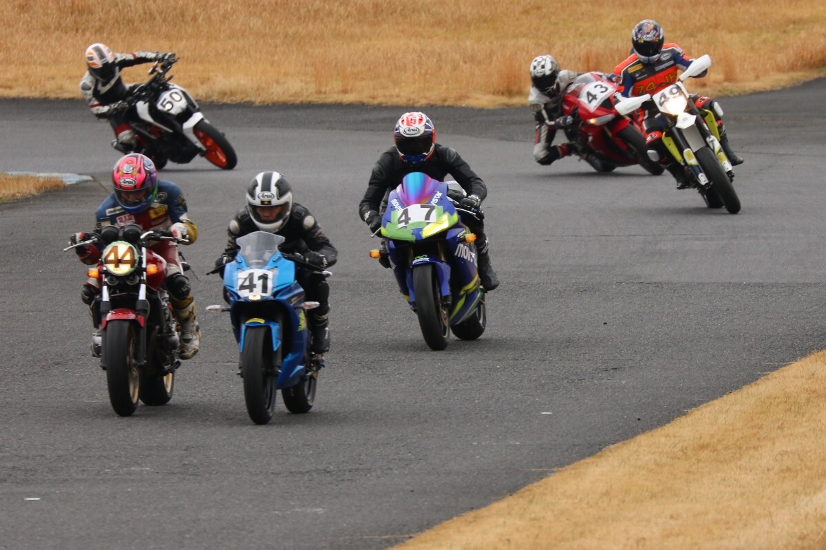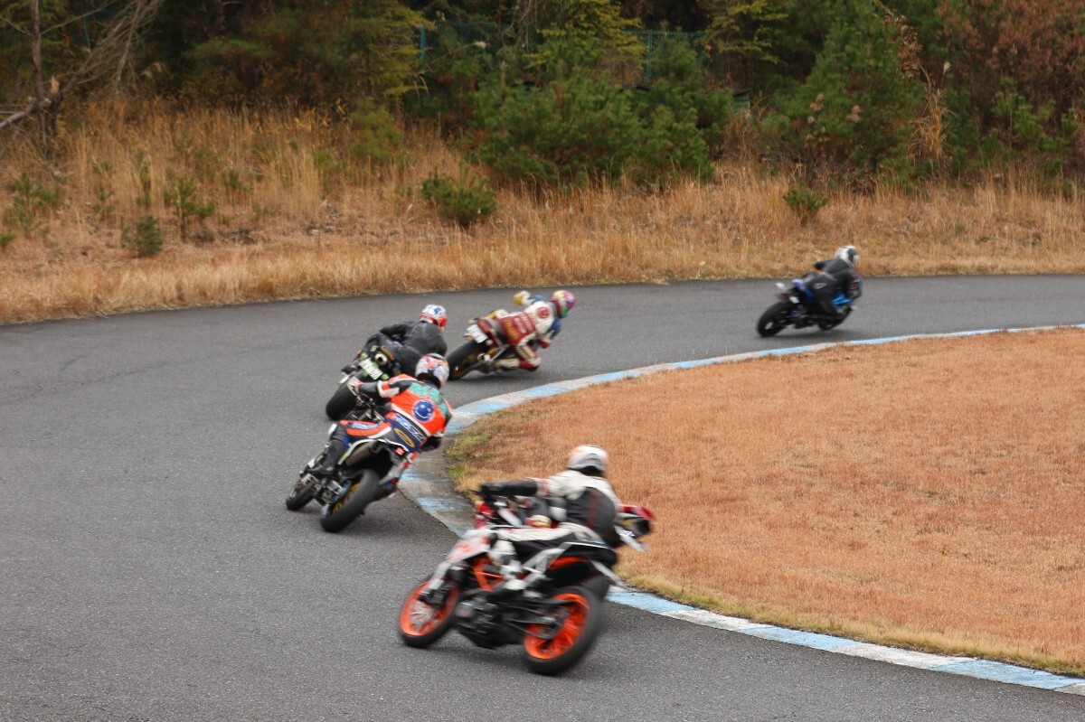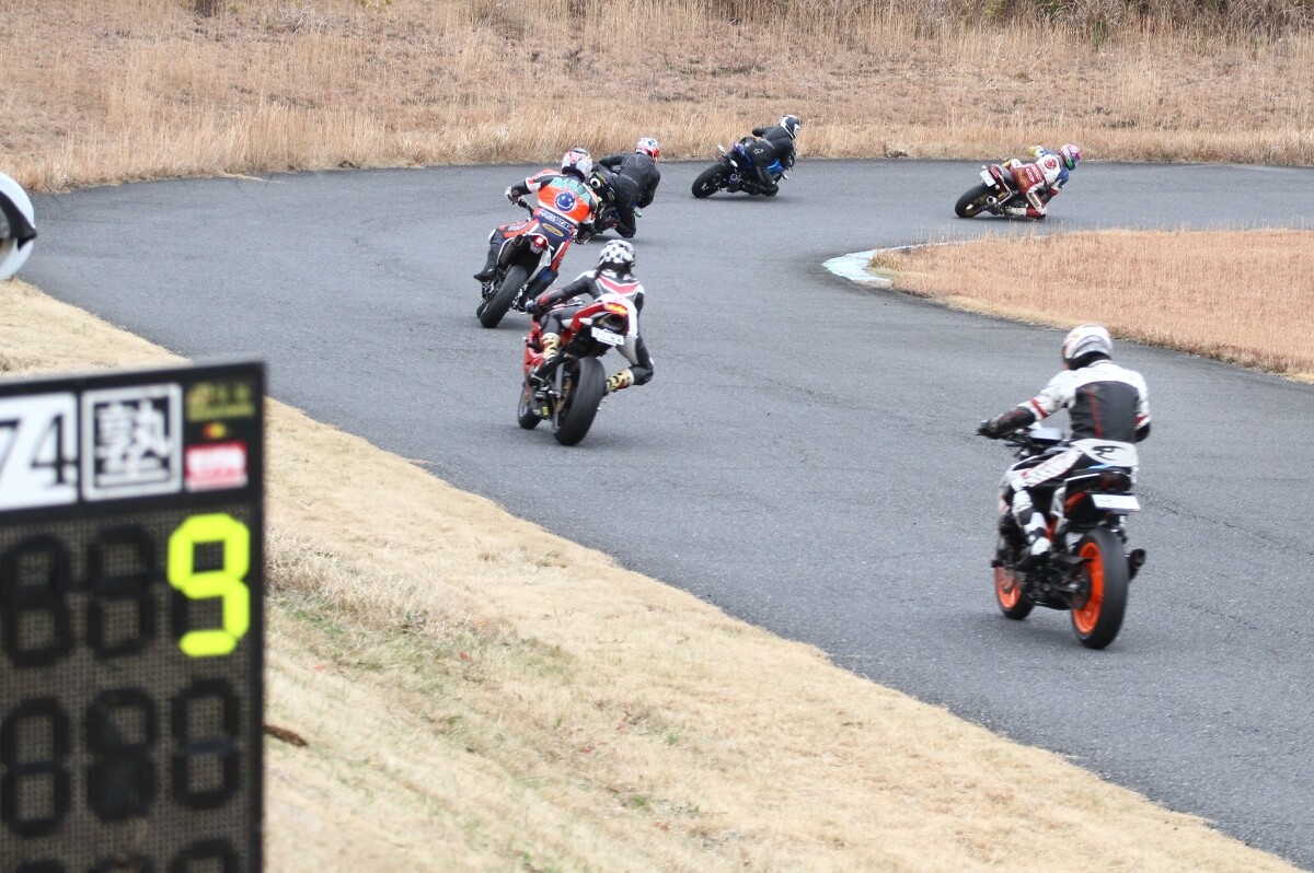 ホールショットを奪ったのはその田中Ninja250SL、2番手に皆藤CB400SF、3番手に高田CBR600RR、4番手に菅原701スーパーモト、5番手に濱390Duke………