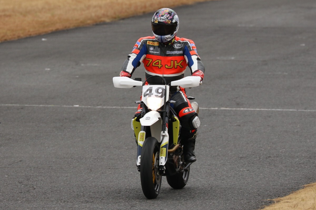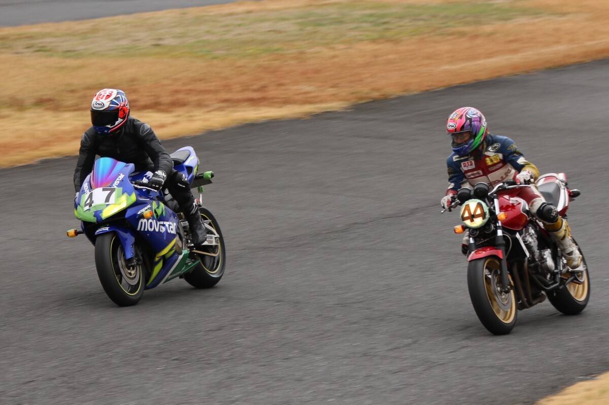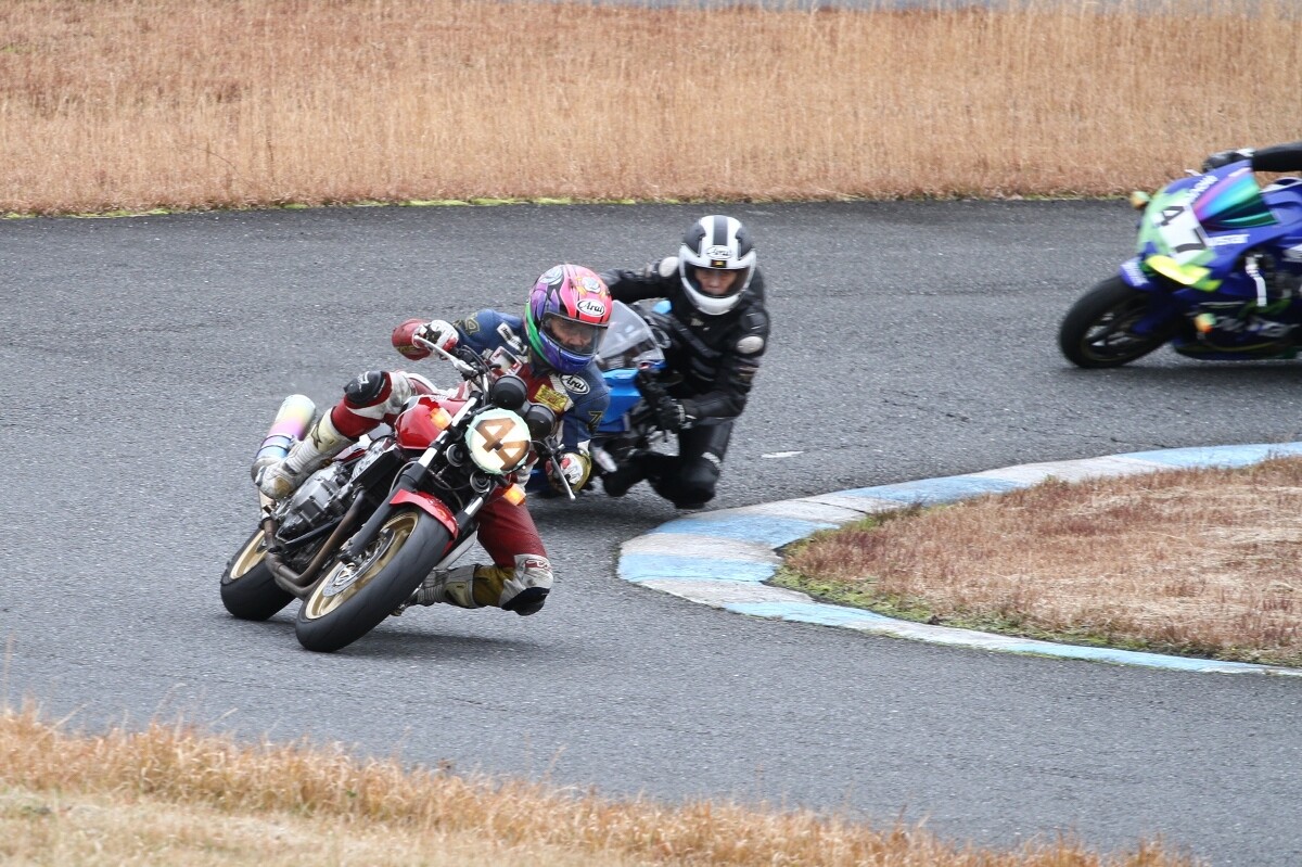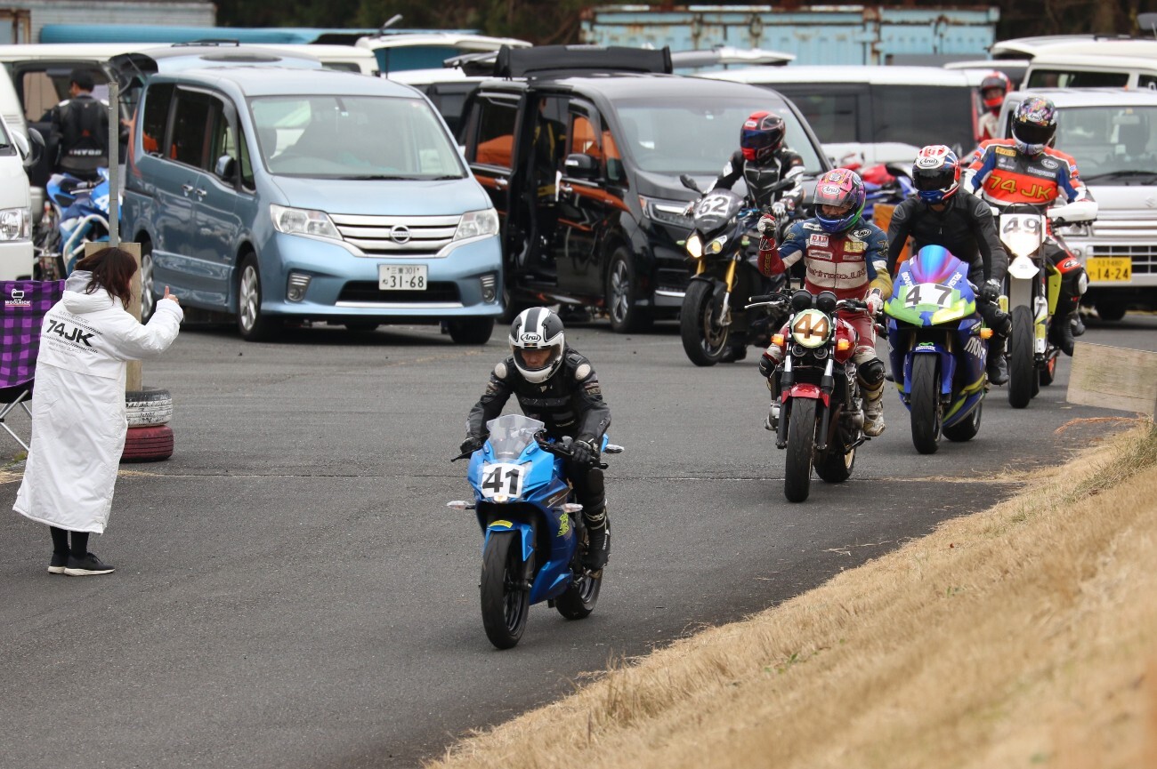 ホールショットを奪ったのはその田中Ninja250SL、2番手に皆藤CB400SF、3番手に高田CBR600RR、4番手に菅原701スーパーモト、5番手に濱390Duke………