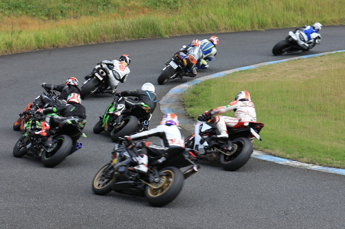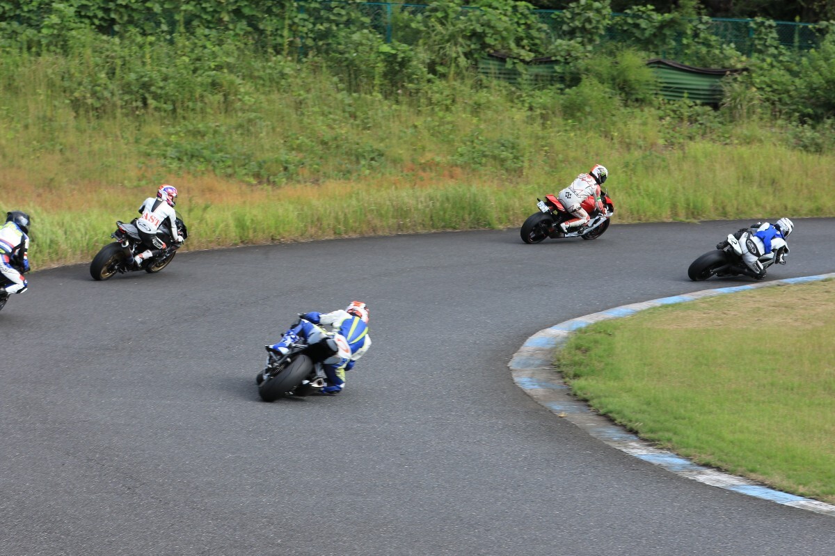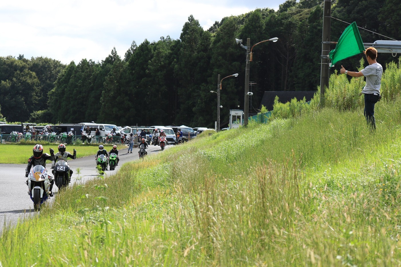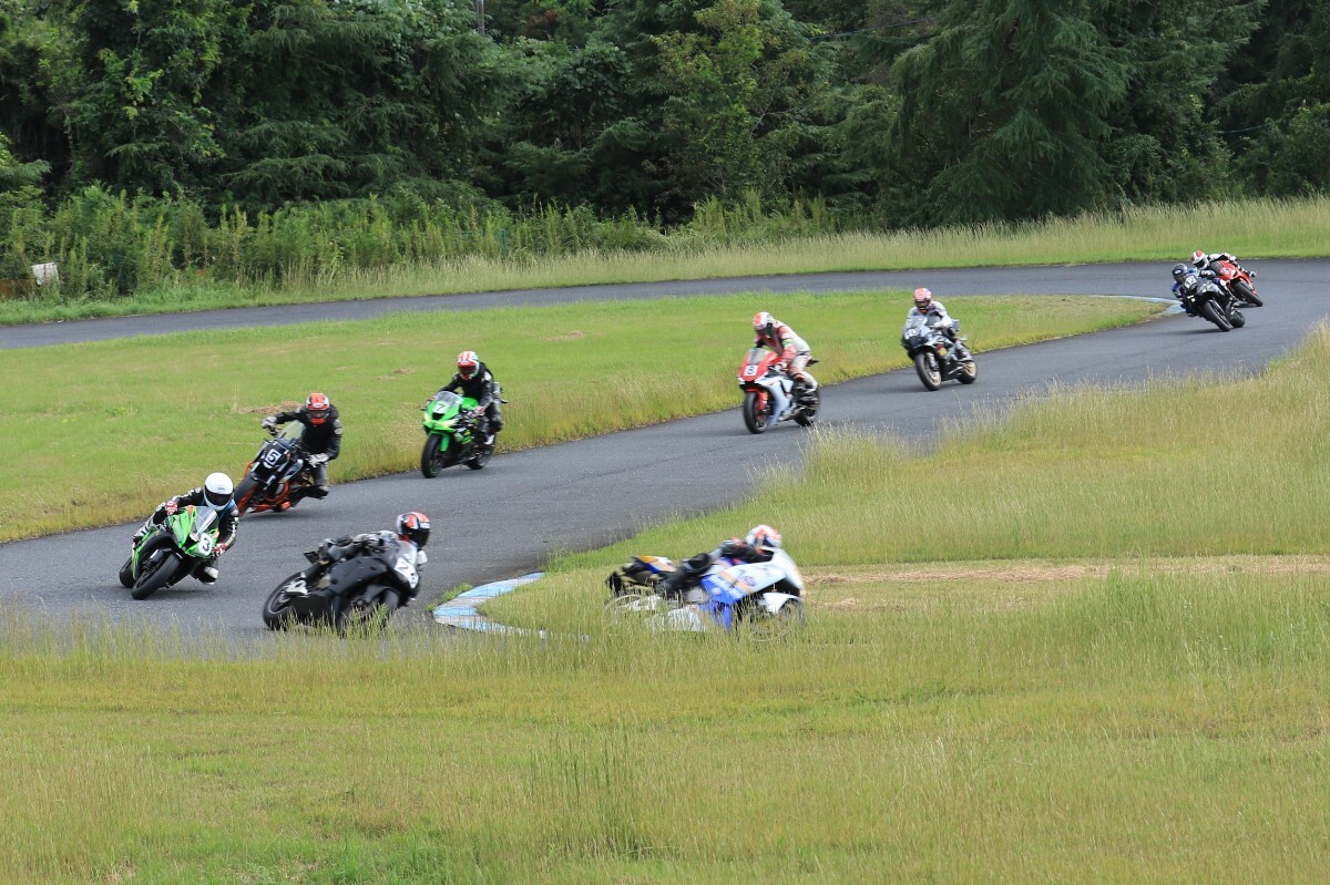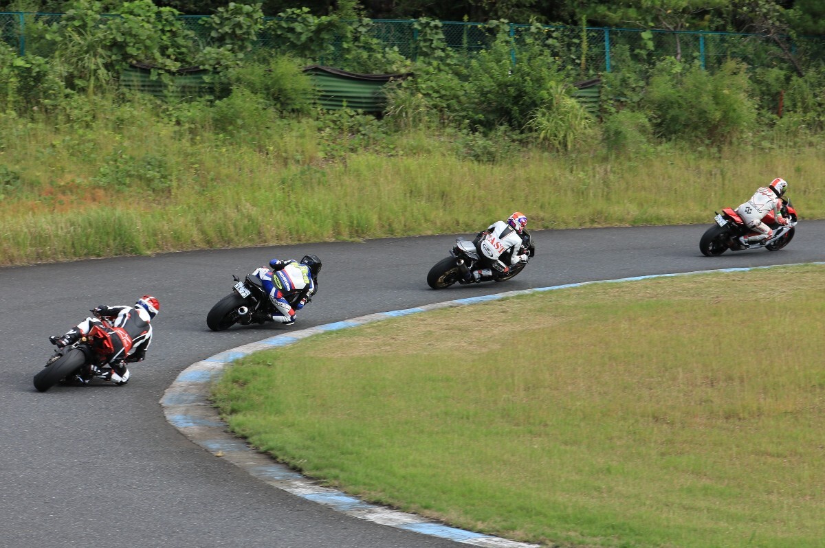 ホールショットを奪ったのは柴。そして山中の鼻先を抑えて2番手には片岡GSXR1000K6。