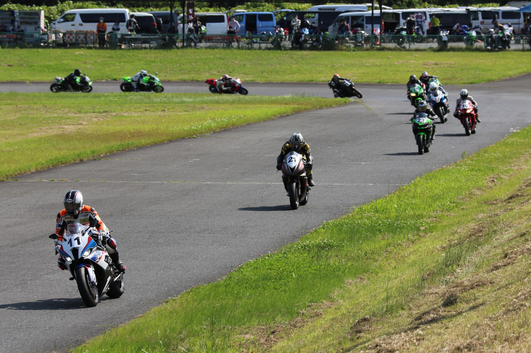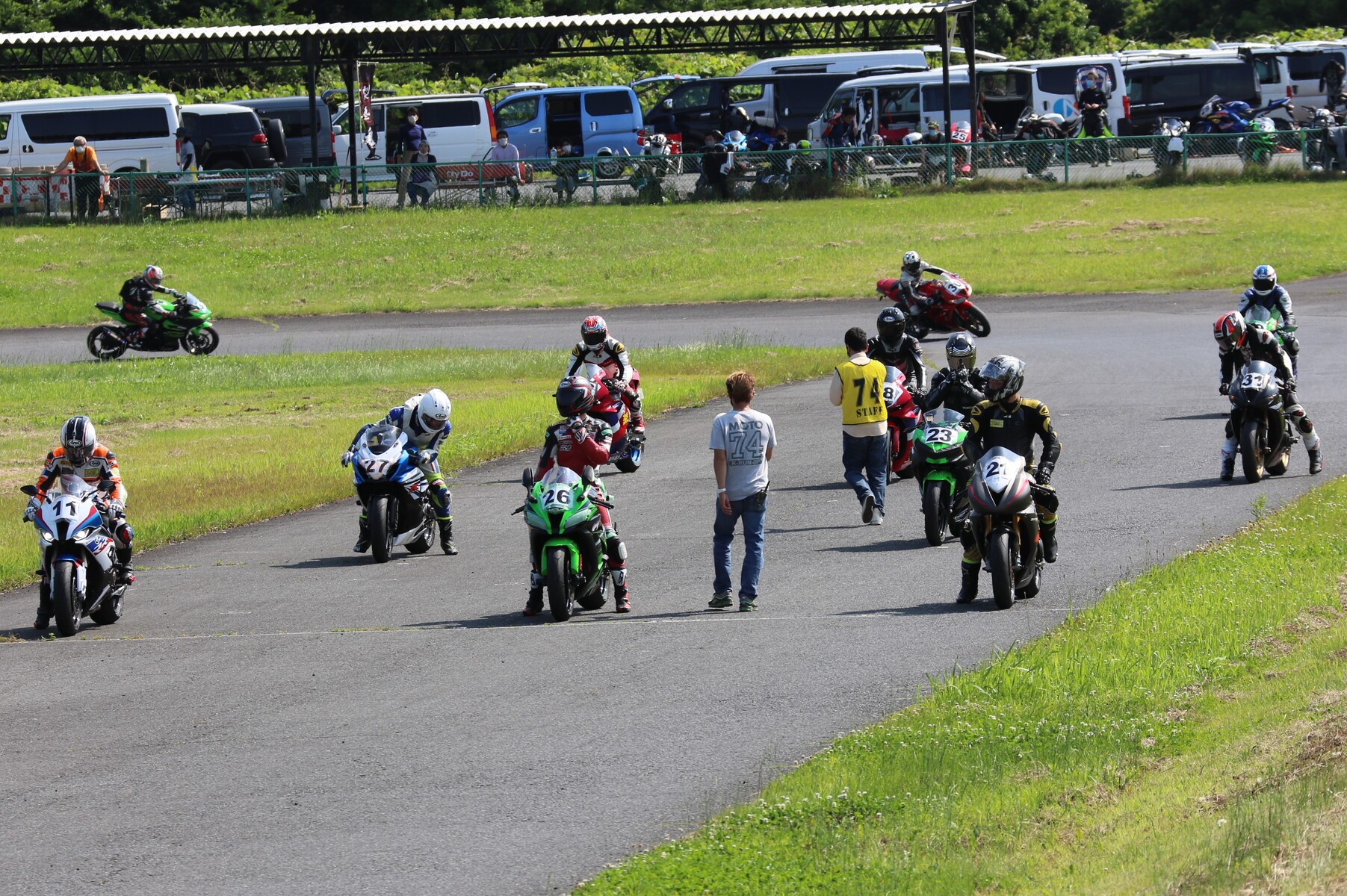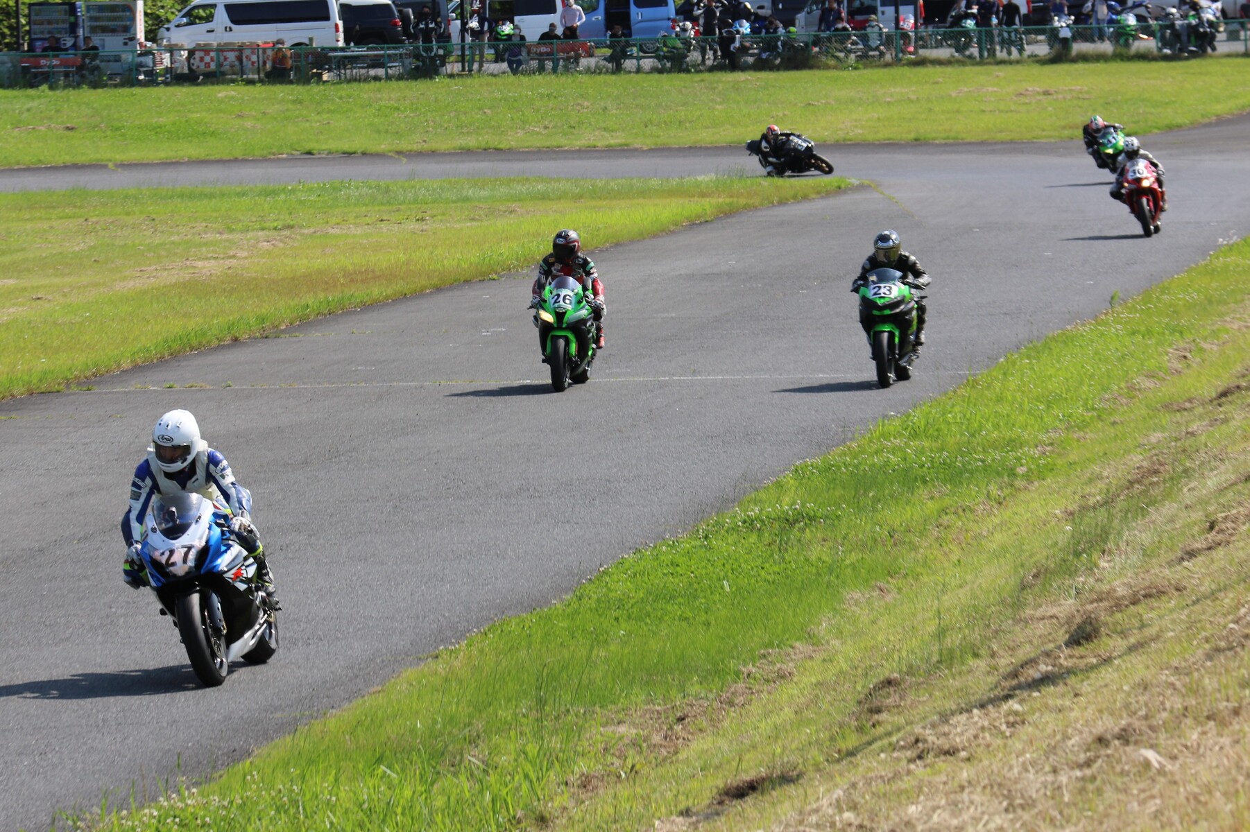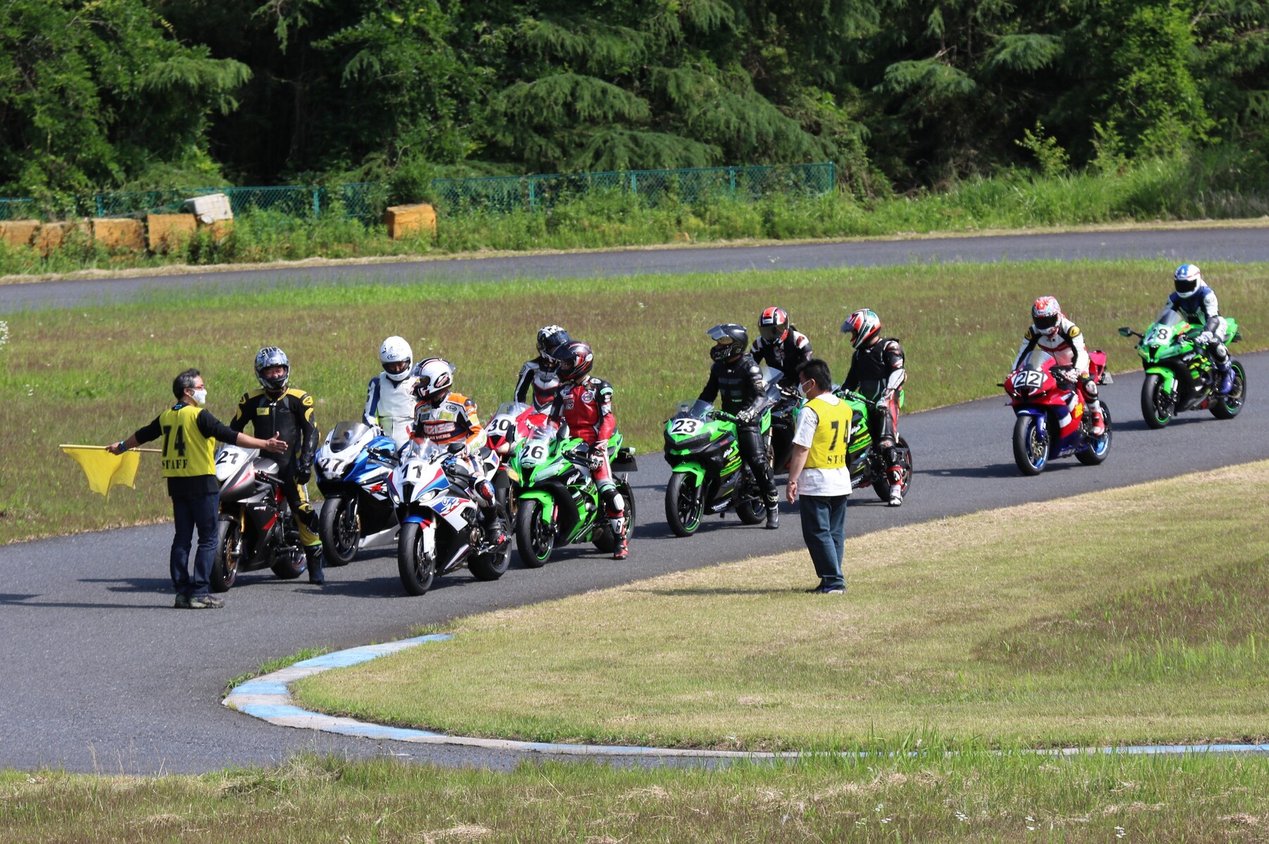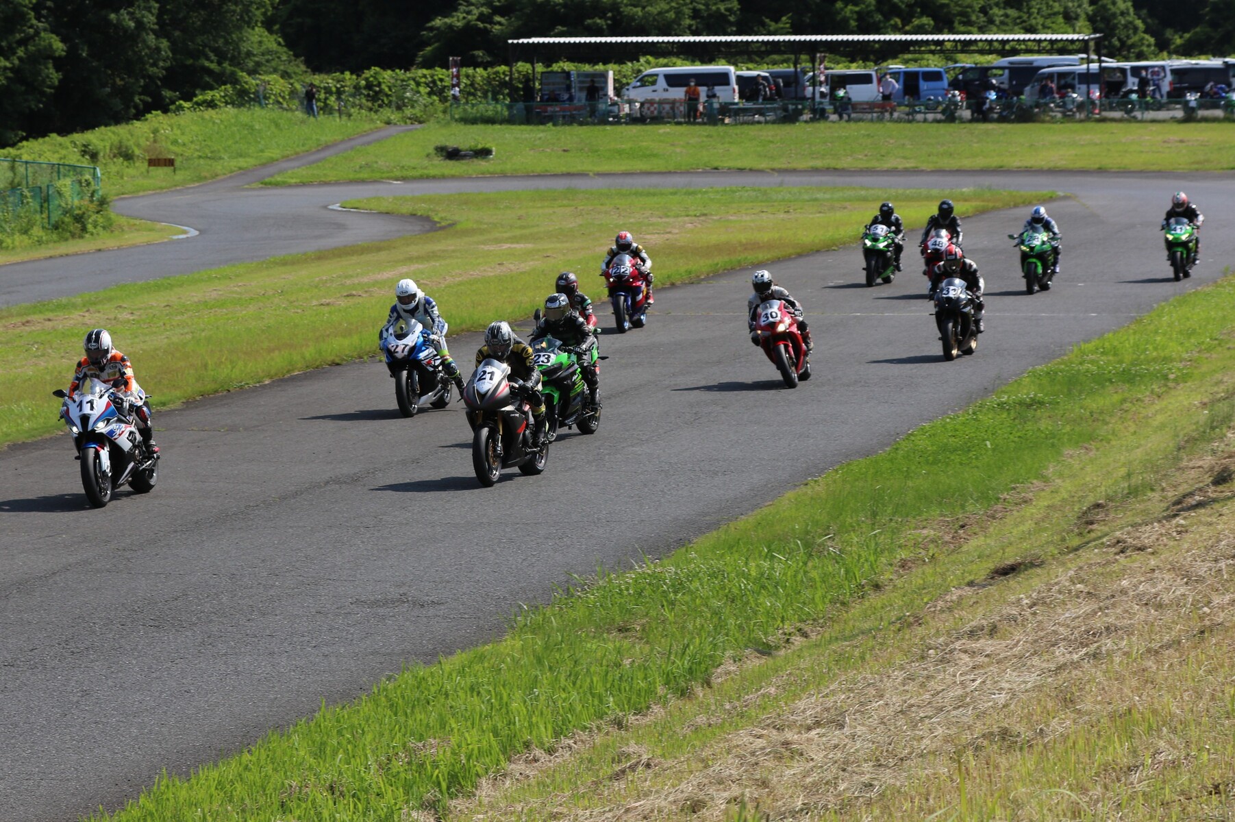 7番手に小川Ninja400、8番手に江川デイトナ675、9番手に大橋CBR600RR、10番手に池野ZX10R、11番手にCクラスからジャンプアップしてきた八木ZX6R、12番手に初参加でやはりCクラスからジャンプアップしてきた清川CBR600RRと続く。