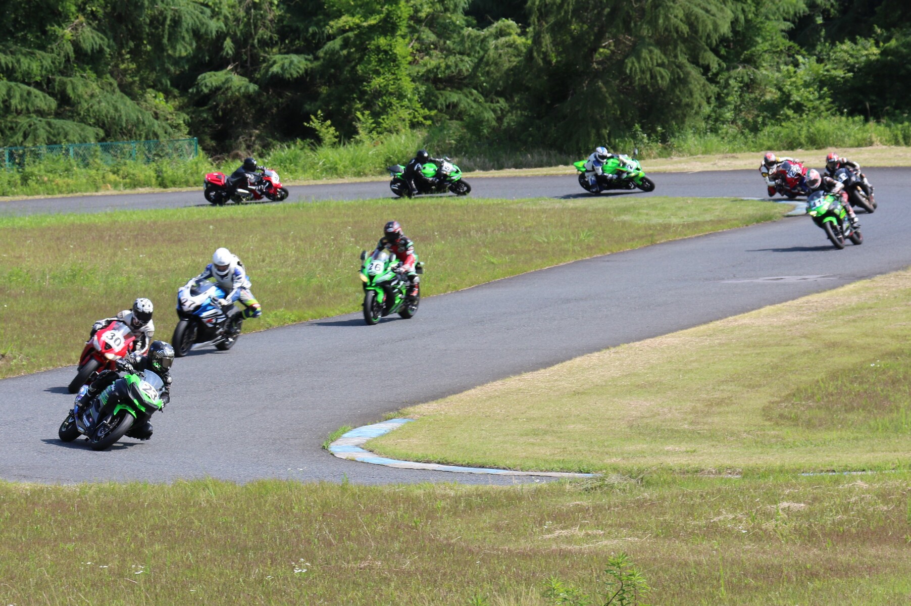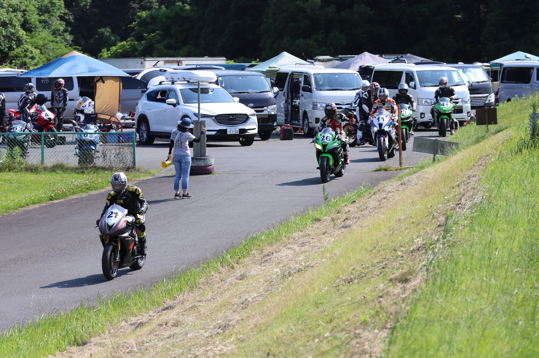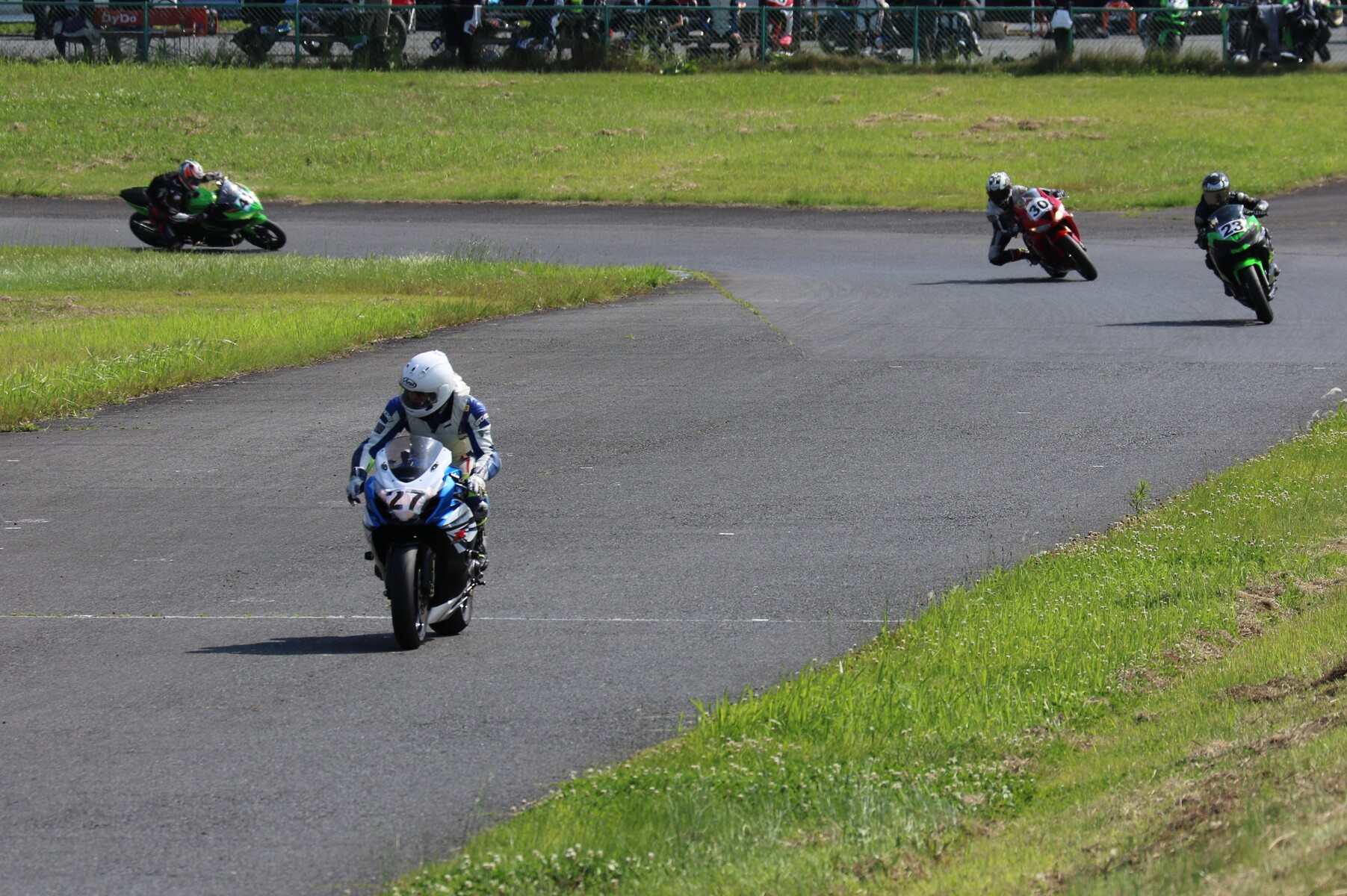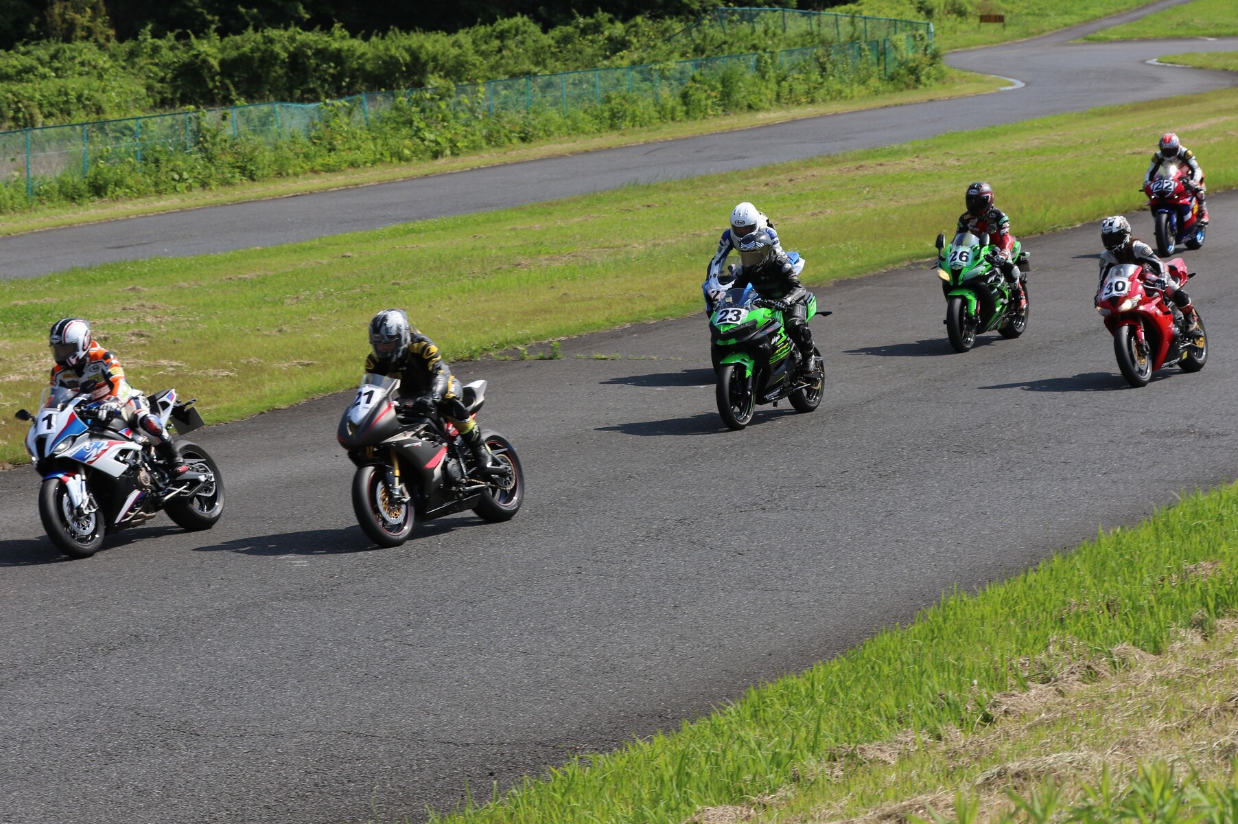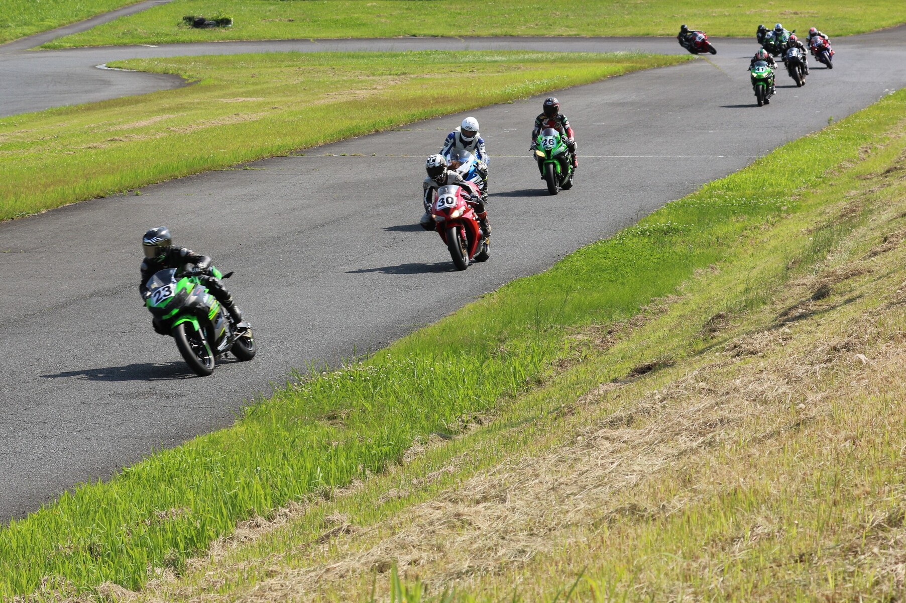 7番手に小川Ninja400、8番手に江川デイトナ675、9番手に大橋CBR600RR、10番手に池野ZX10R、11番手にCクラスからジャンプアップしてきた八木ZX6R、12番手に初参加でやはりCクラスからジャンプアップしてきた清川CBR600RRと続く。