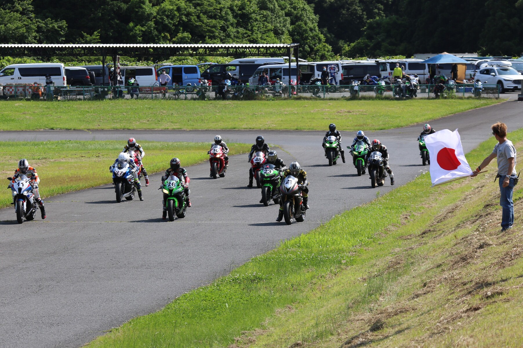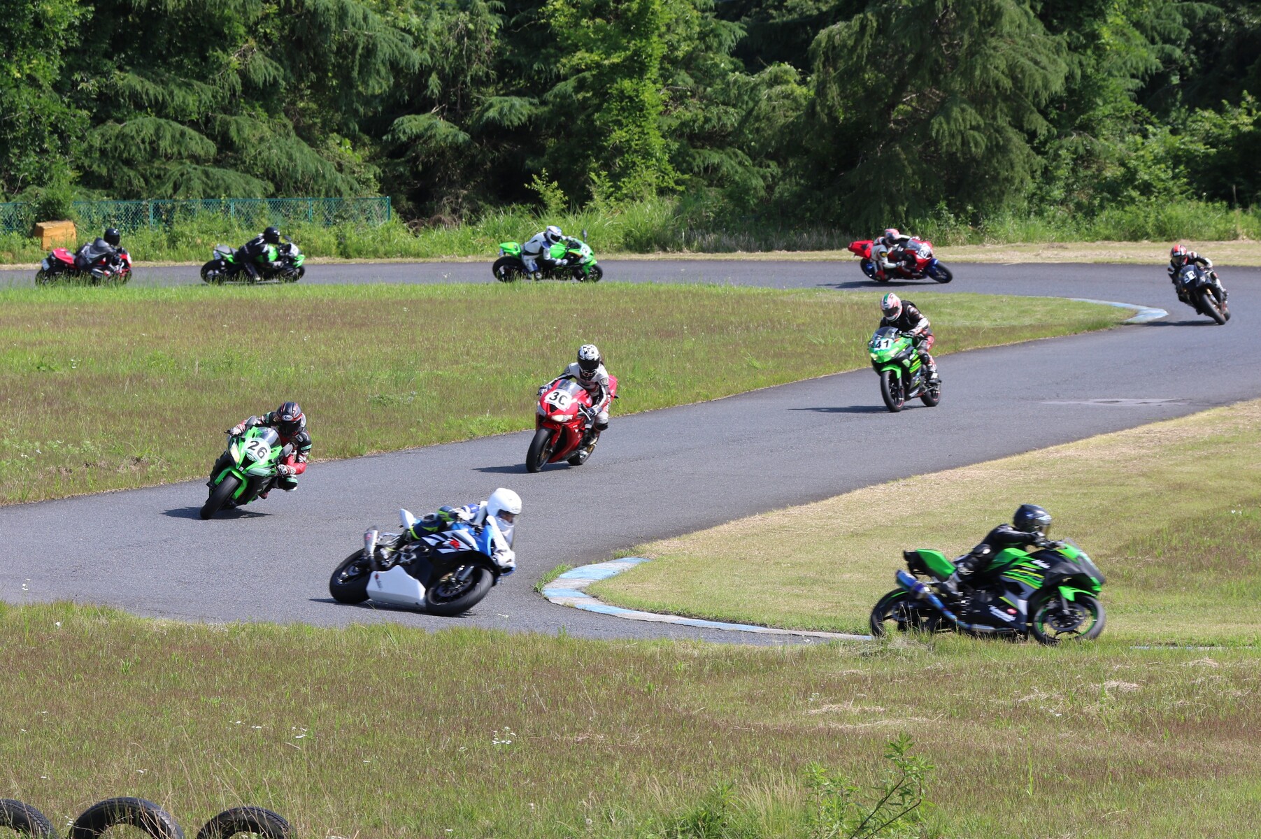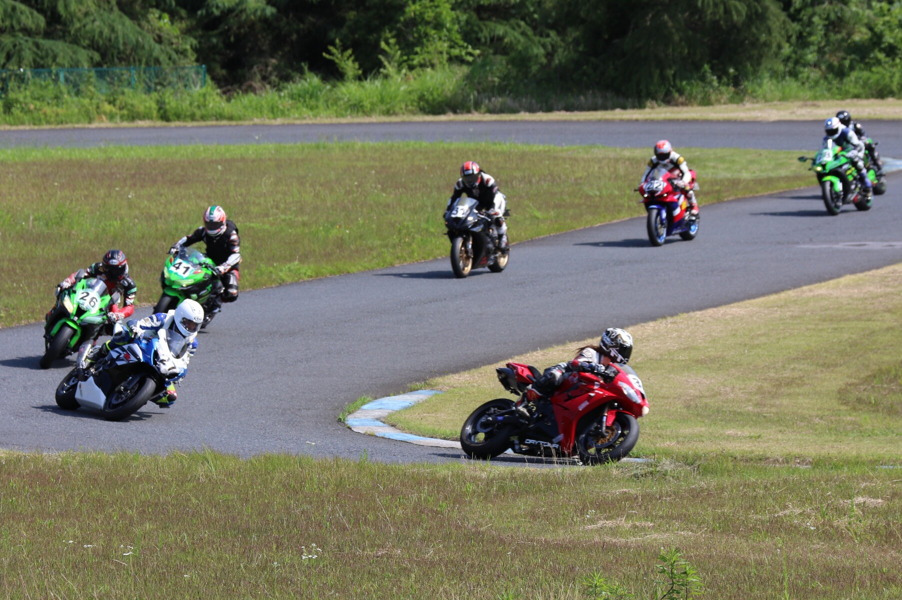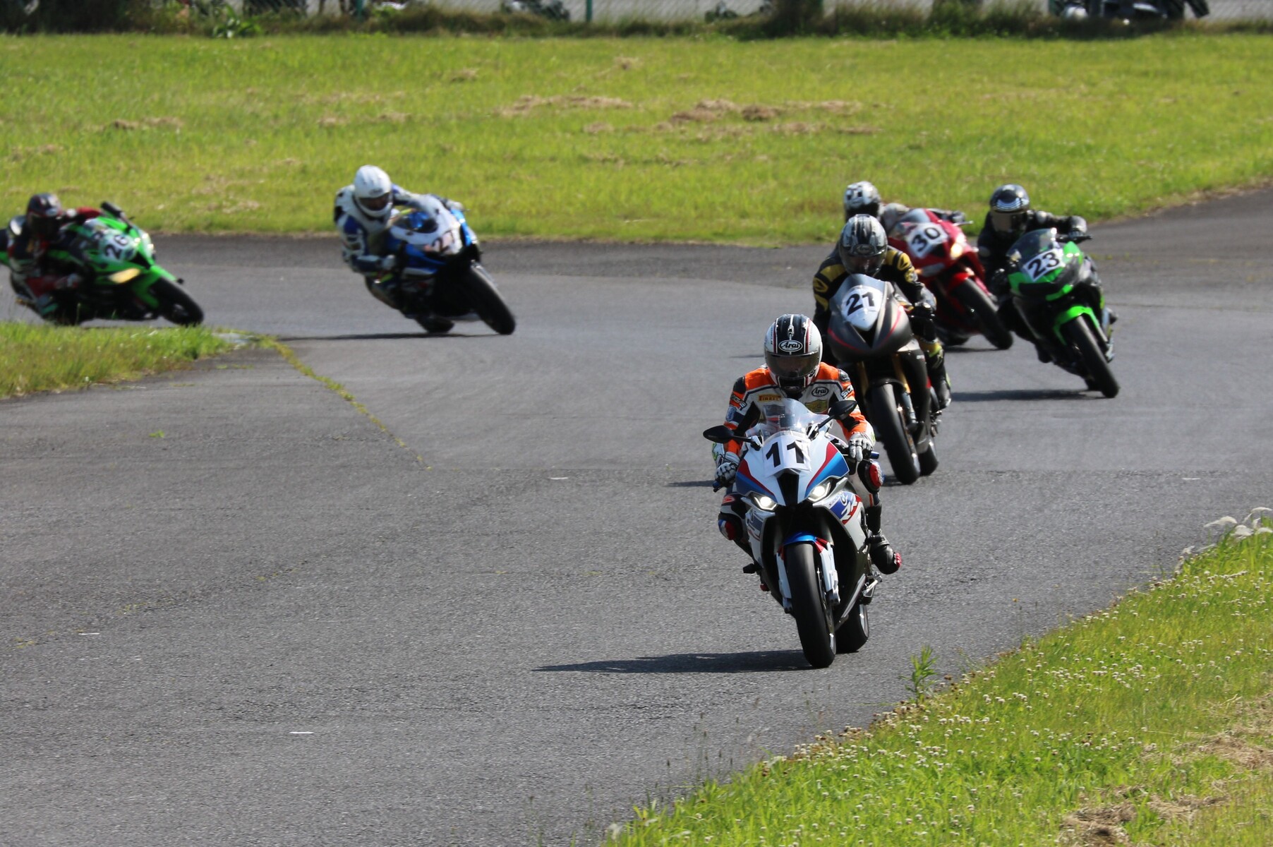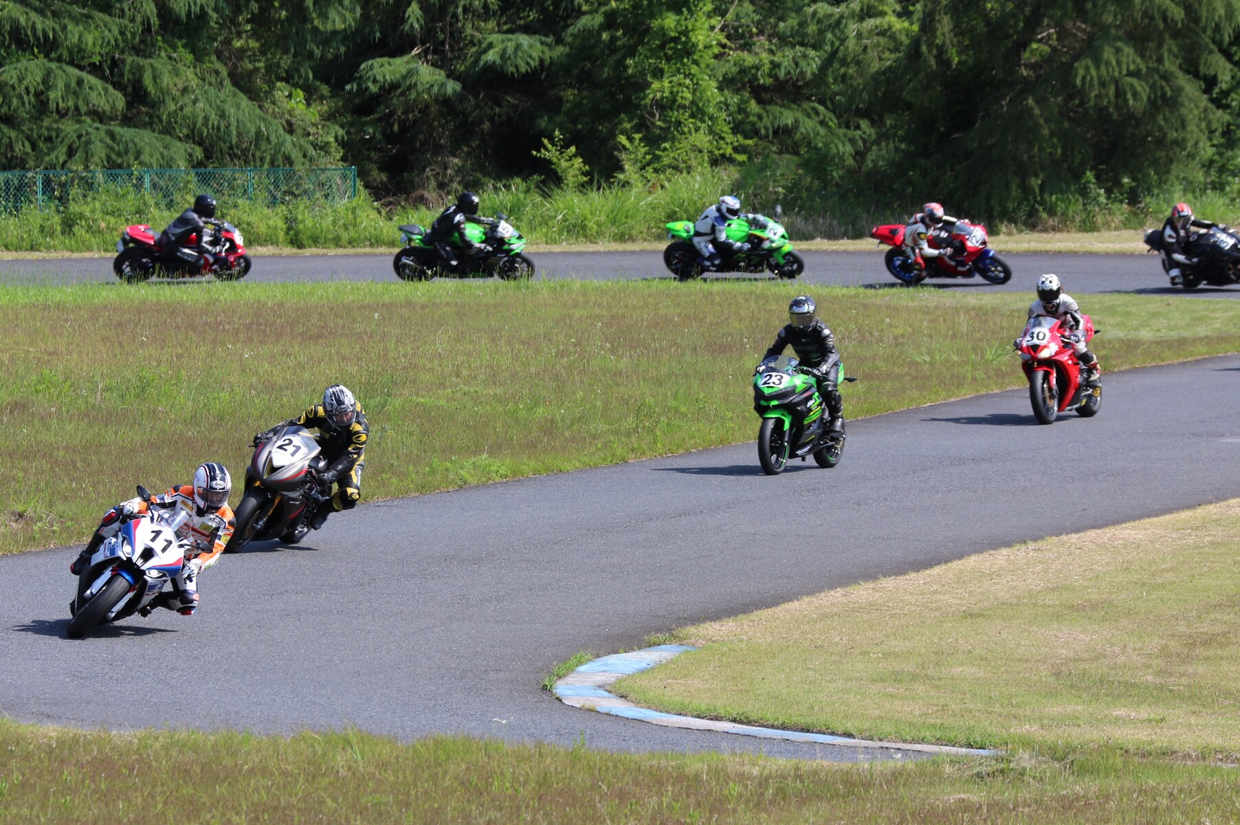 7番手に小川Ninja400、8番手に江川デイトナ675、9番手に大橋CBR600RR、10番手に池野ZX10R、11番手にCクラスからジャンプアップしてきた八木ZX6R、12番手に初参加でやはりCクラスからジャンプアップしてきた清川CBR600RRと続く。