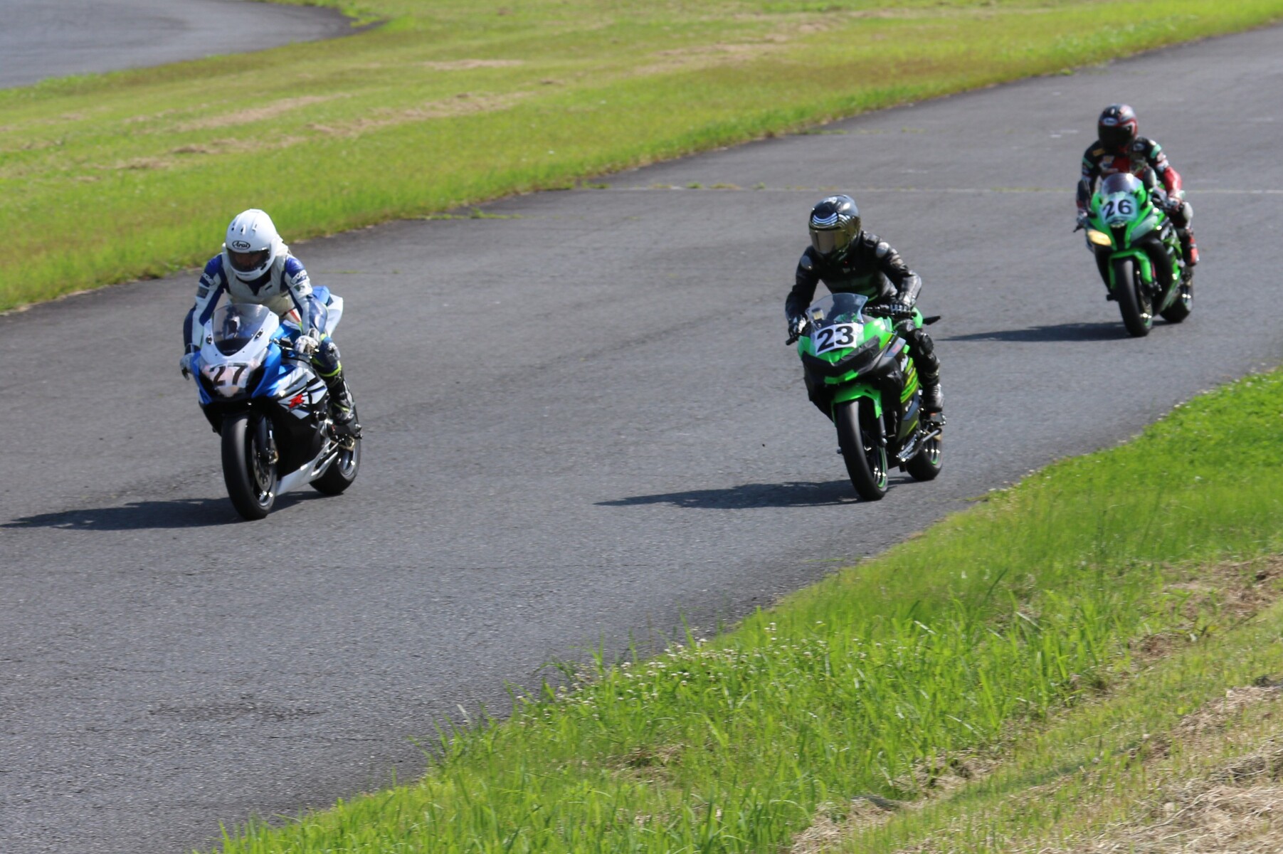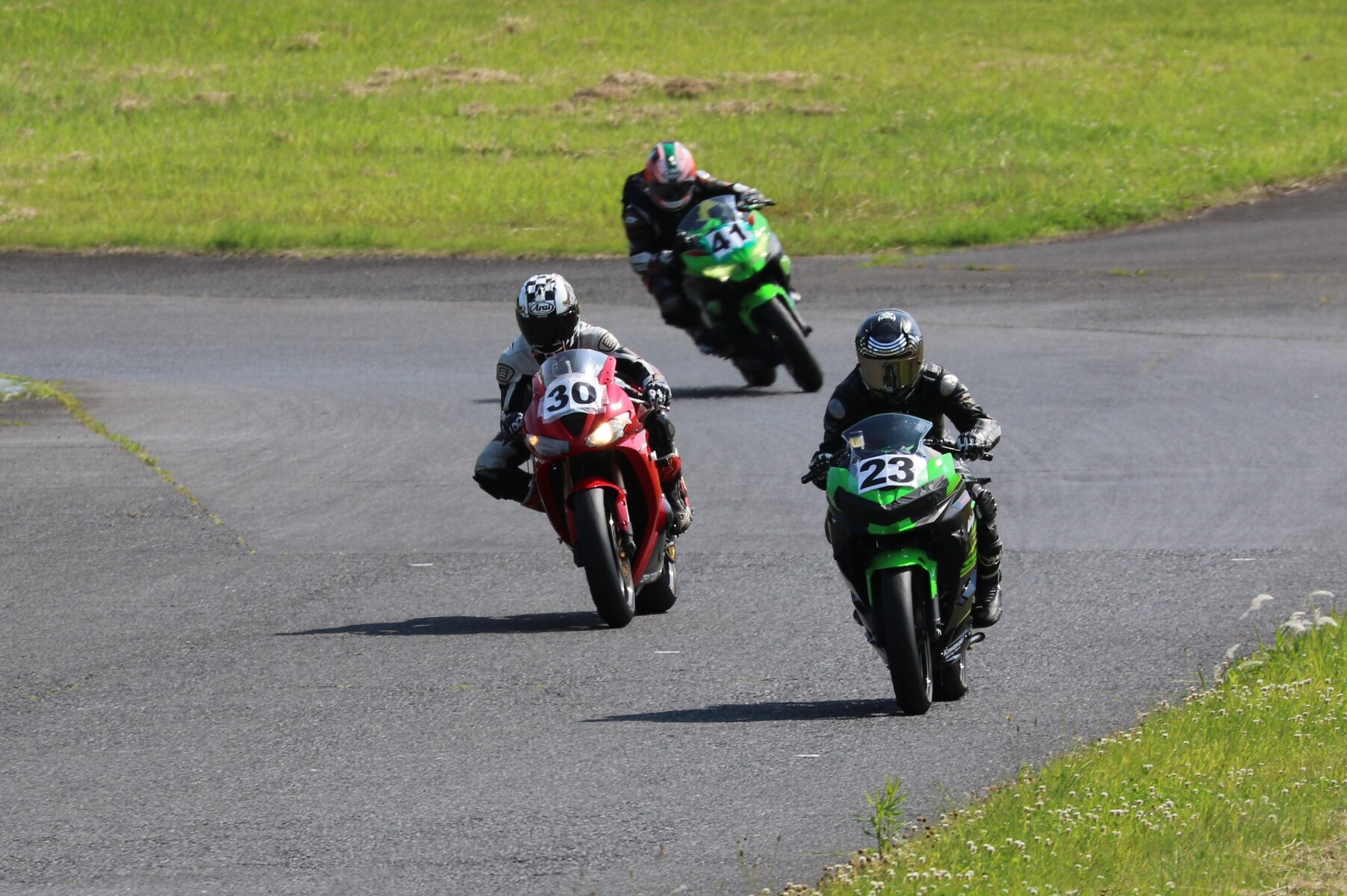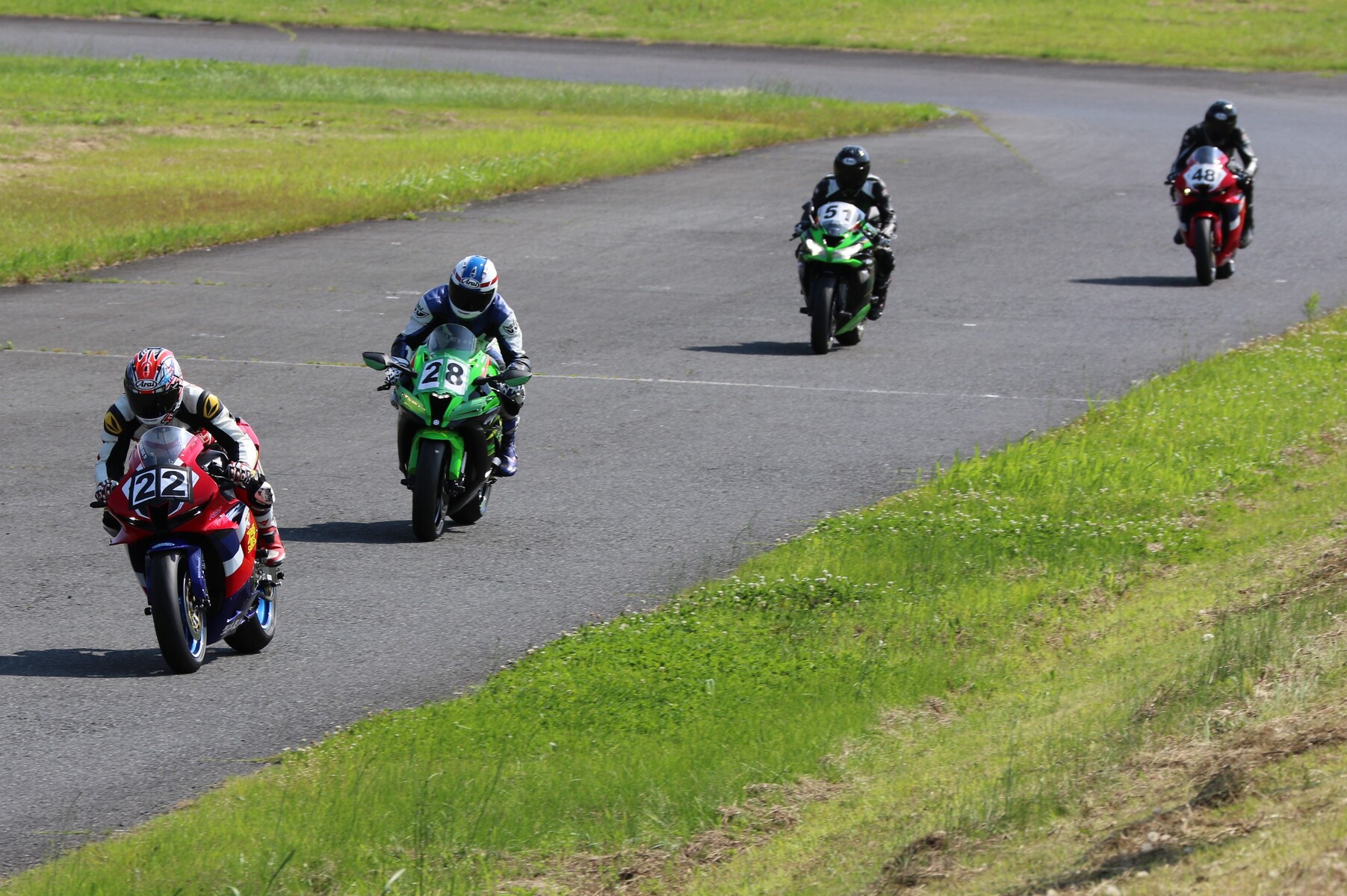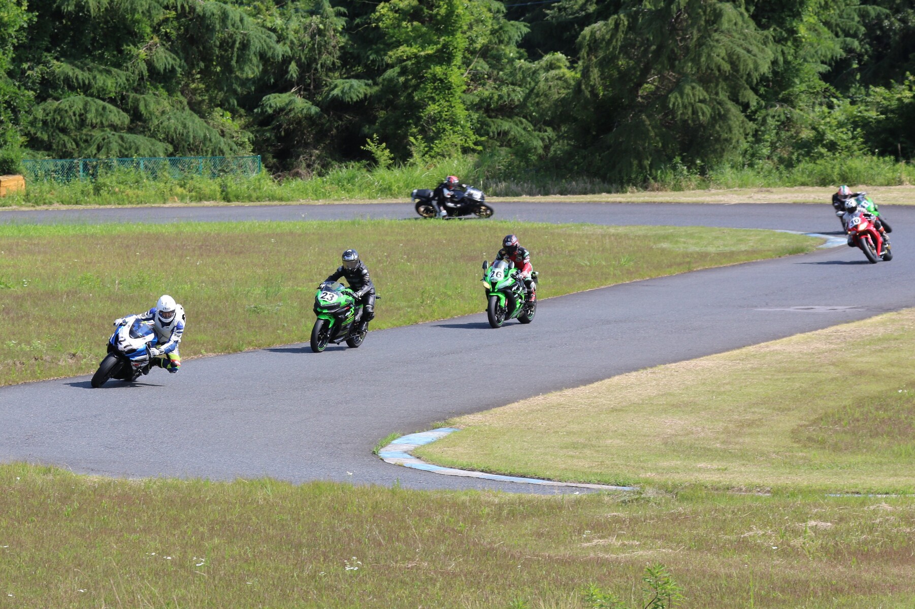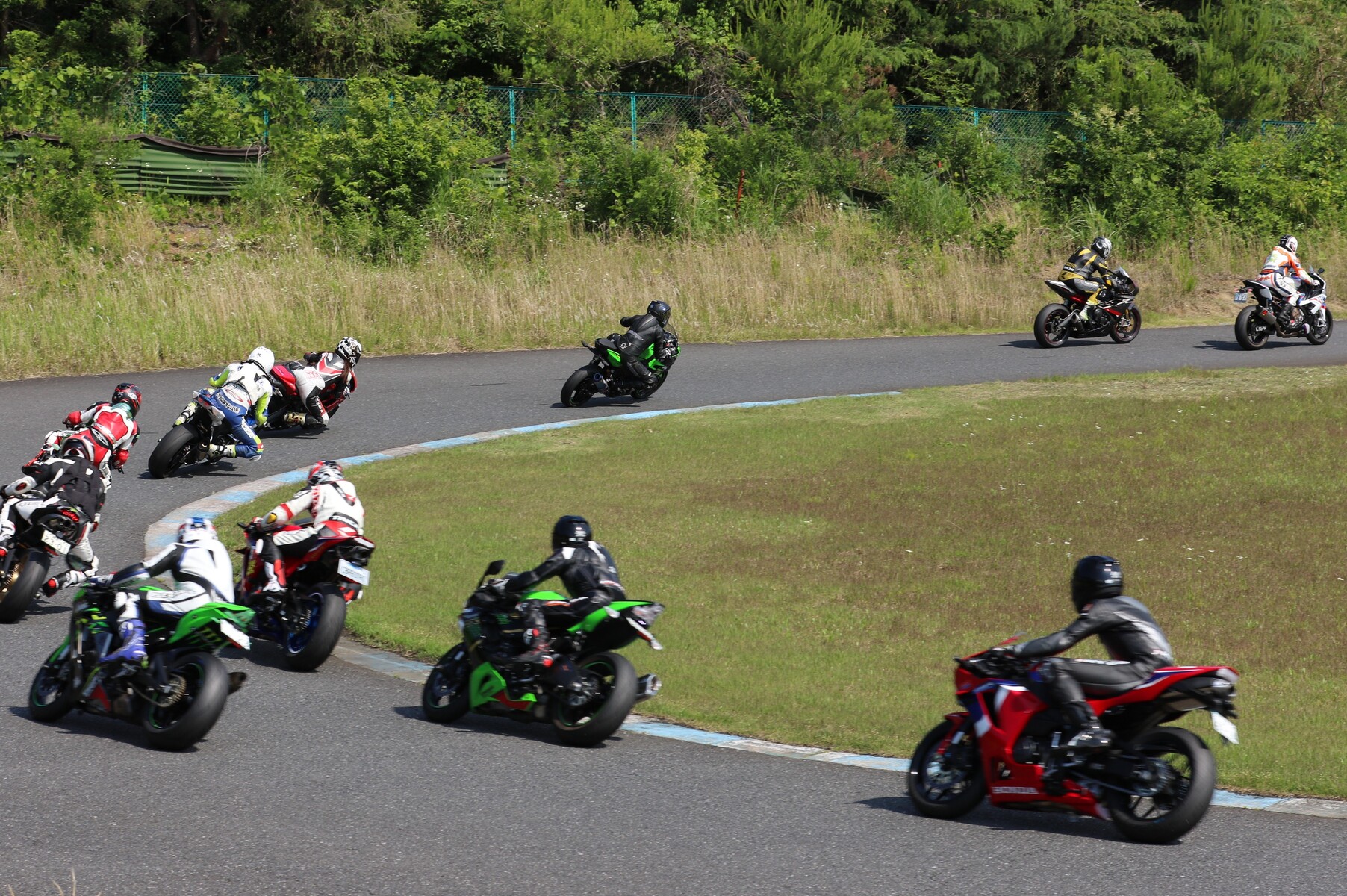 7番手に小川Ninja400、8番手に江川デイトナ675、9番手に大橋CBR600RR、10番手に池野ZX10R、11番手にCクラスからジャンプアップしてきた八木ZX6R、12番手に初参加でやはりCクラスからジャンプアップしてきた清川CBR600RRと続く。
